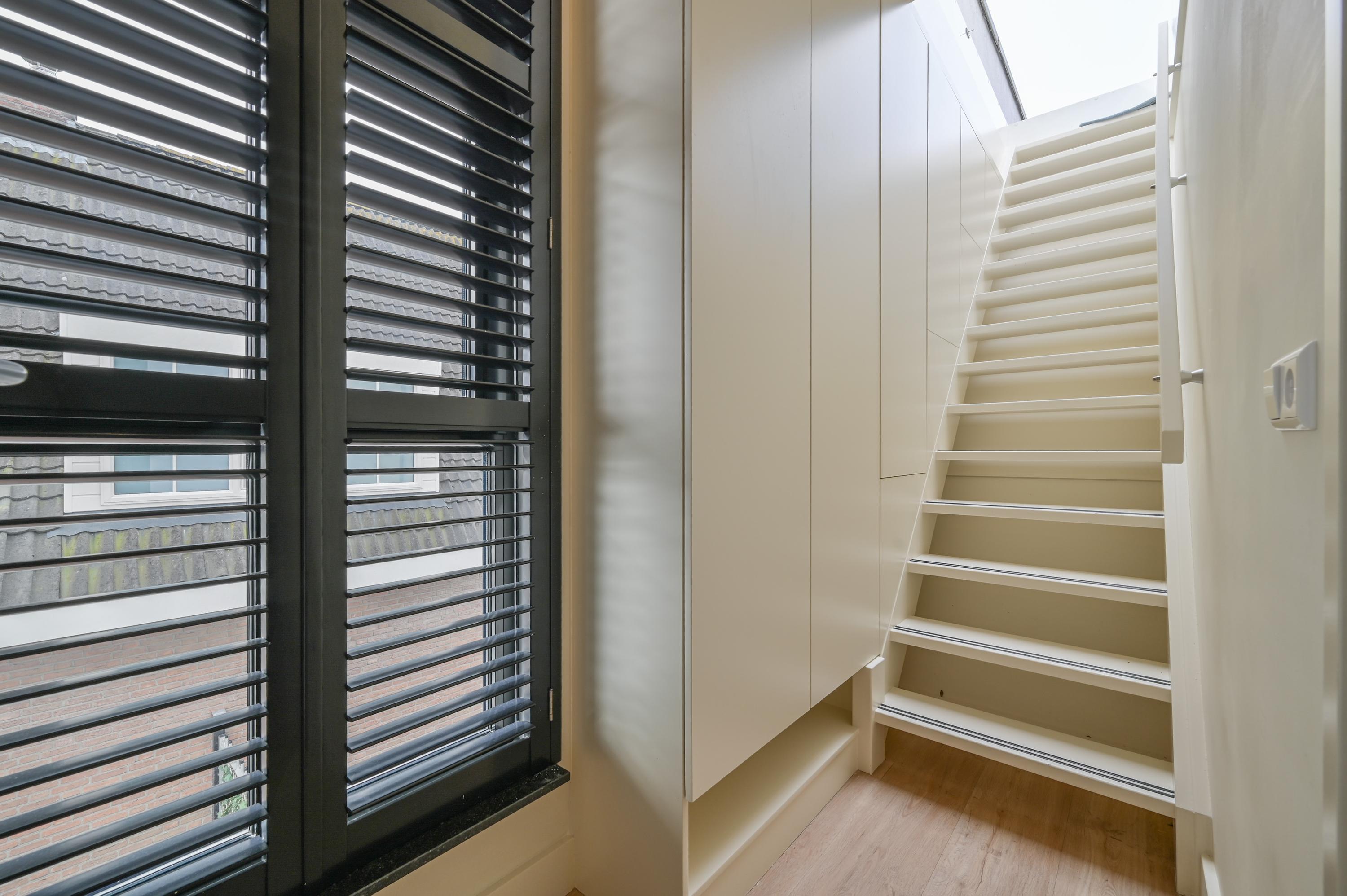 De gang biedt toegang tot de praktische stookruimte met CV-installatie en waar tevens de wasmachine en droger zijn geplaatst. Langs de gang en de trap naar het dakterras bevinden zich op maat gemaakte vaste kasten, die zorgen voor meer dan voldoende bergruimte en een overzichtelijke indeling van het gehele woonoppervlak.