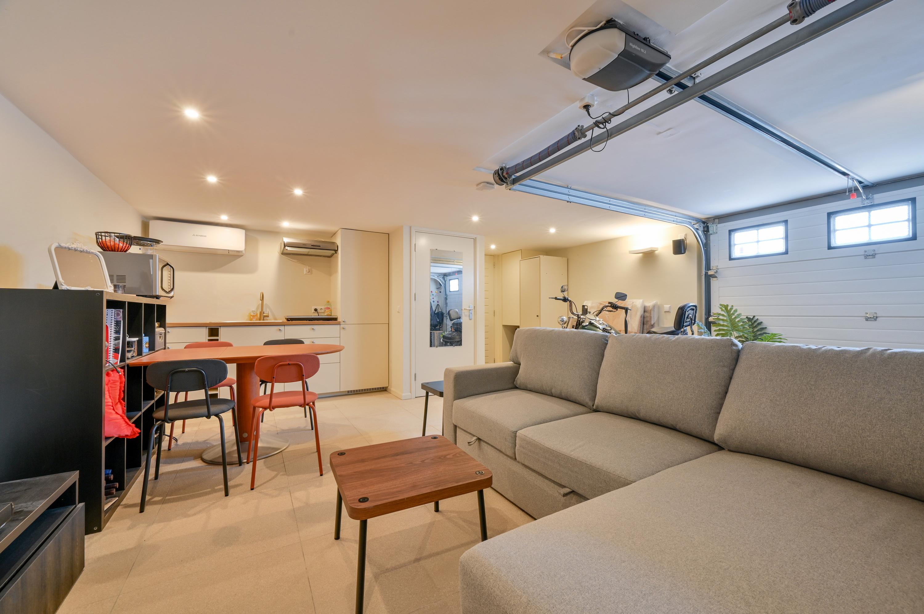 Onder het terras bevindt zich een garage die via een vaste trap bereikbaar is en die momenteel dienstdoet als studio, compleet met keukenblok, toilet, elektrische vloerverwarming en airconditioning. De garage is tevens bereikbaar via een elektrische deur aan de achterzijde van de woning.