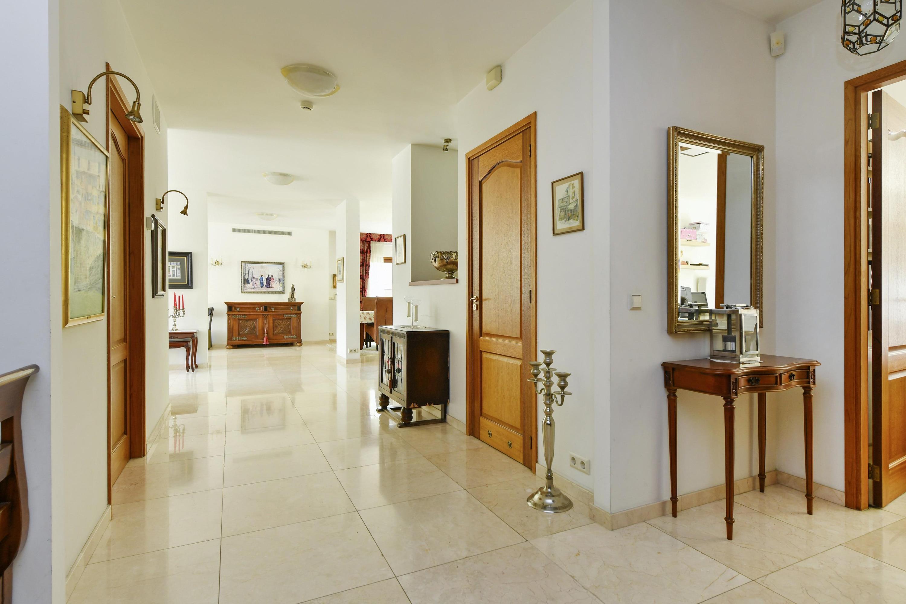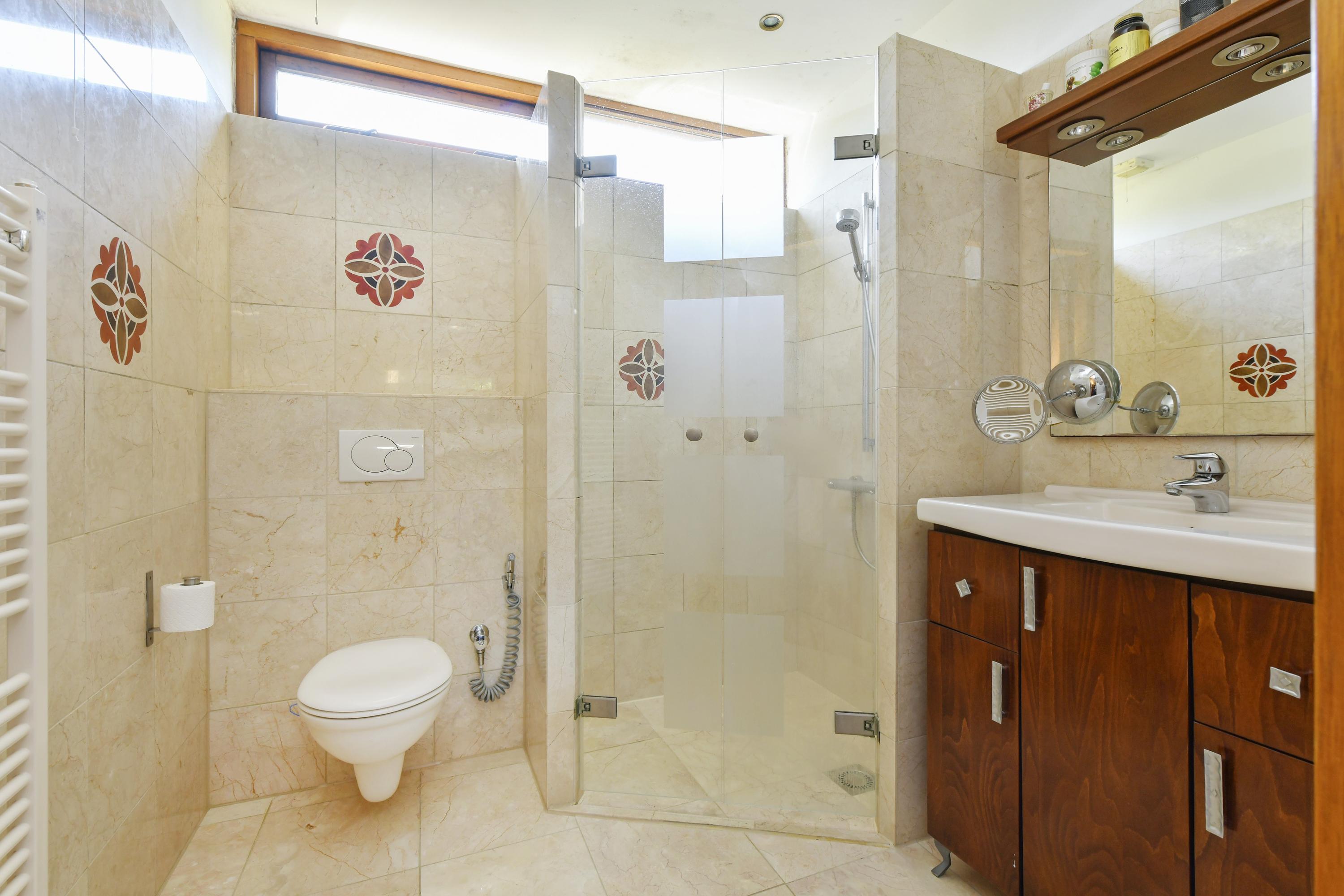 Op de eerste verdieping bevinden zich vijf goed bemeten slaapkamers en twee moderne badkamers. De master bedroom aan de voorzijde beschikt over een inloopkast en directe toegang tot de grootste badkamer, uitgerust met een ligbad, douche en wastafel. De tweede badkamer, bereikbaar vanaf de overloop, beschikt over een douche, wastafel en toilet.