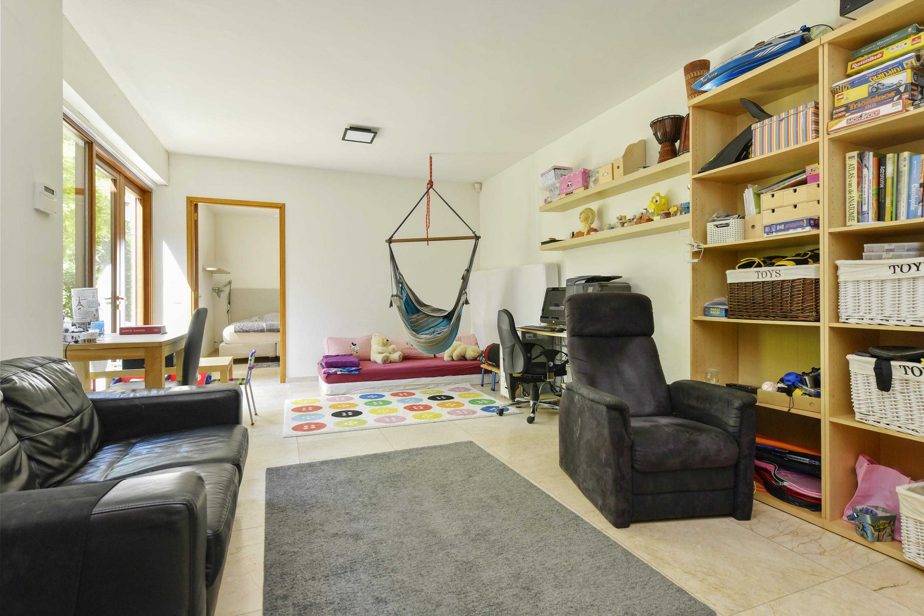 Grenzend aan de woonkamer bevindt zich een praktische bijkeuken met extra bergruimte en aansluitingen voor een wasmachine en droger. Aan de andere zijde van de woning ligt een tussenkamer met toegang tot een slaapkamer met eigen badkamer inclusief wastafelmeubel en douce en seperaat toilet. De ruimte is ideaal voor gasten of een au pair of in te delen als werk- of studeerkamer. Tevens is er een aparte berging bereikbaar vanuit de tuin.