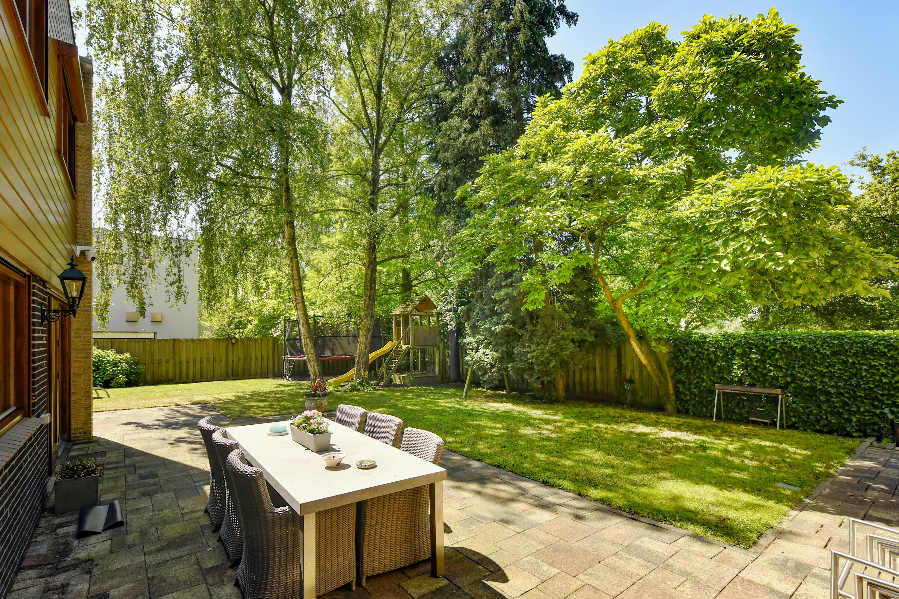 De royale achtertuin ligt op het zuidwesten en grenst direct aan het vaarwater. Hier is het heerlijk genieten van de zon, de rust en het uitzicht over het groen. Er is voldoende ruimte voor een loungeset, eettafel en speelgedeelte. Aan de voorzijde is plaats voor meerdere auto’s op eigen terrein.