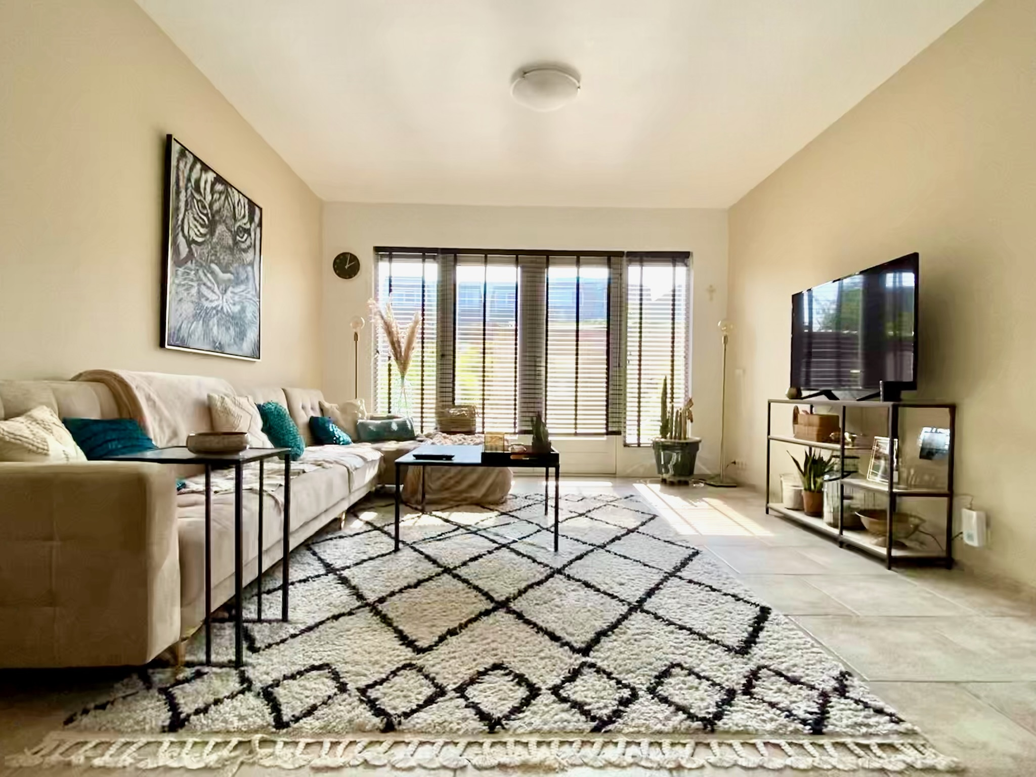De begane grond beschikt over een lichte woonkamer met toegang tot het terras, een volwaardige keuken met onder andere een gasfornuis, vaatwasser, koelkast en aansluiting voor een wasmachine, en een separaat toilet met fonteintje. De tegelvloer is voorzien van vloerverwarming, wat zorgt voor extra comfort. Via een wenteltrap bereikt u de eerste verdieping, waar zich twee slaapkamers bevinden en een badkamer met ligbad, wastafel en toilet.