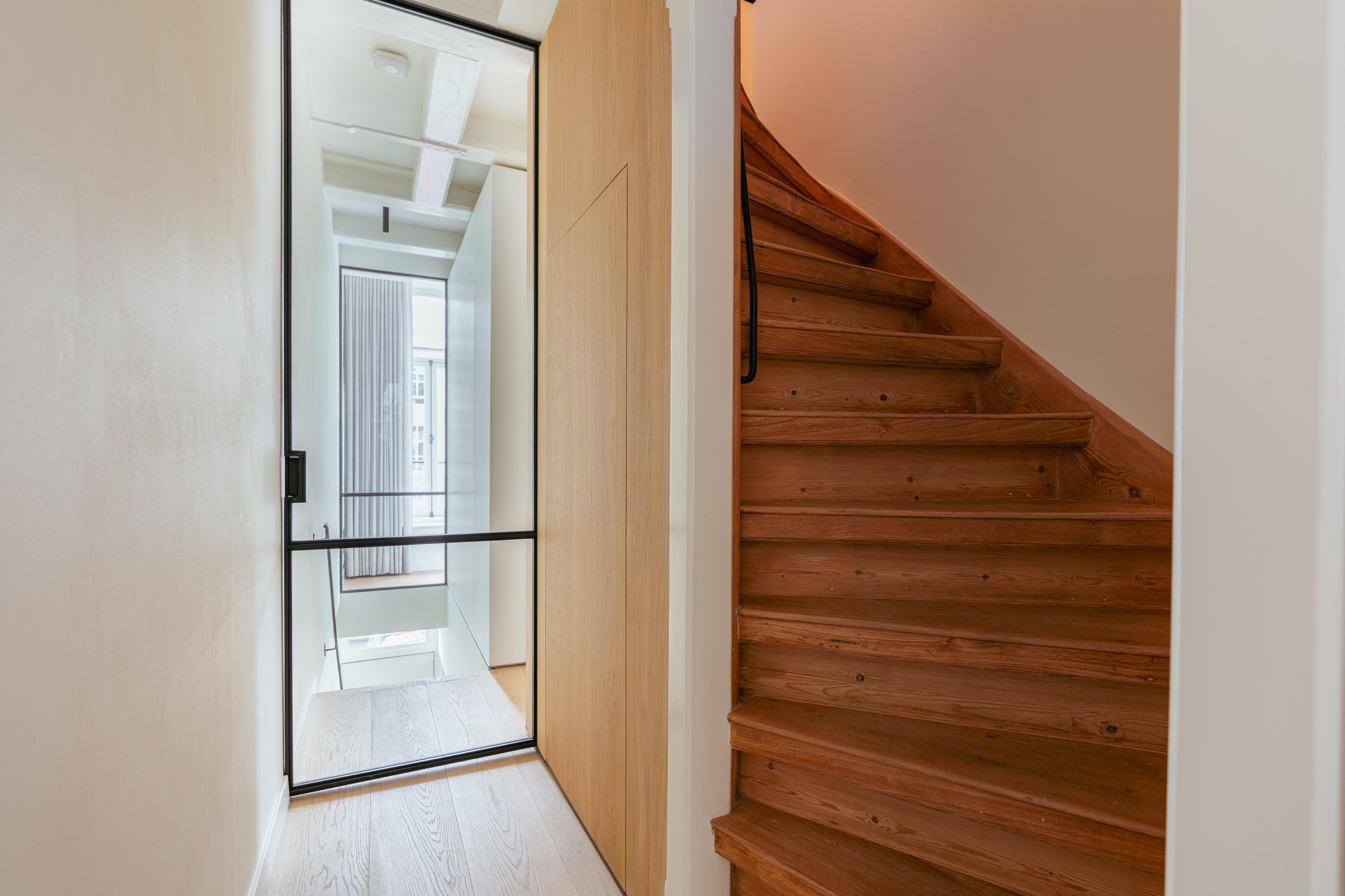 De vierde verdieping, gelegen in de nok van het pand, is momenteel in gebruik als gym. Dankzij de vide is er een directe verbinding met de master bedroom op de verdieping eronder, wat een prettig gevoel van openheid en ruimtelijkheid creëert. De kapconstructie met de schuine daklijnen geeft deze ruimte karakter, terwijl het royale plafond en de grote raampartijen zorgen voor een lichte en aangename sfeer. Dit is een multifunctionele ruimte die eenvoudig aan te passen is naar wens – denk aan een werkplek, hobbyruimte, extra slaapkamer of ontspanningsruimte. Aan de achterzijde bieden openslaande deuren toegang tot een rustig gelegen balkon. Hier geniet u van volledige privacy, een fraai uitzicht en de zon, een ideale plek voor een moment van rust in het hart van de stad.