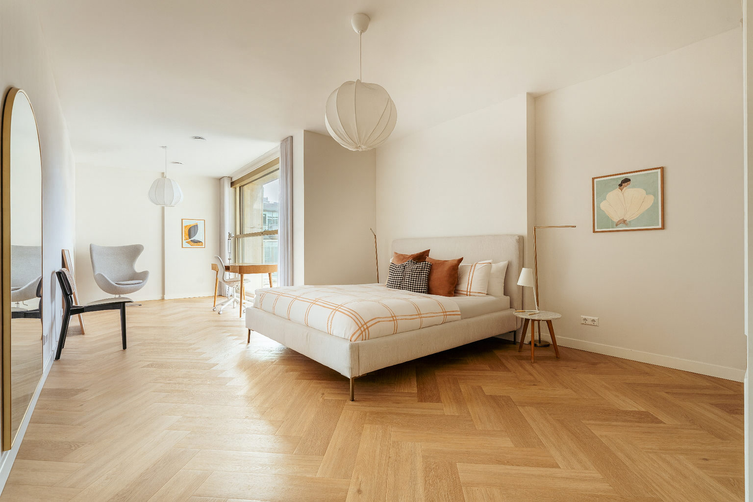 Via de verzorgde entree van de het complex, bereik je via de lift of trap de vijfde verdieping. Hal met separaat toilet en fontein en een ruime berging met de warmtepomp en de benodigde aansluiting voor wasmachine en droger. Vanaf hier heeft u toegang tot alle vertrekken. De riante hoofdslaapkamer is aan de voorzijde gesitueerd. Imposante raampartijen zorgen voor bijzonder veel licht. Aangrenzend bevindt zich de royale living. Een grote schuifpui verschaft de toegang tot het zuidelijk georiënteerde terras. De woonkeuken is voorzien van alle denkbare inbouwapparatuur waaronder een inductiekookplaat, vaatwasser, koel-/vriescombinatie en combi-oven. Er is meer dan genoeg opbergruimte.
