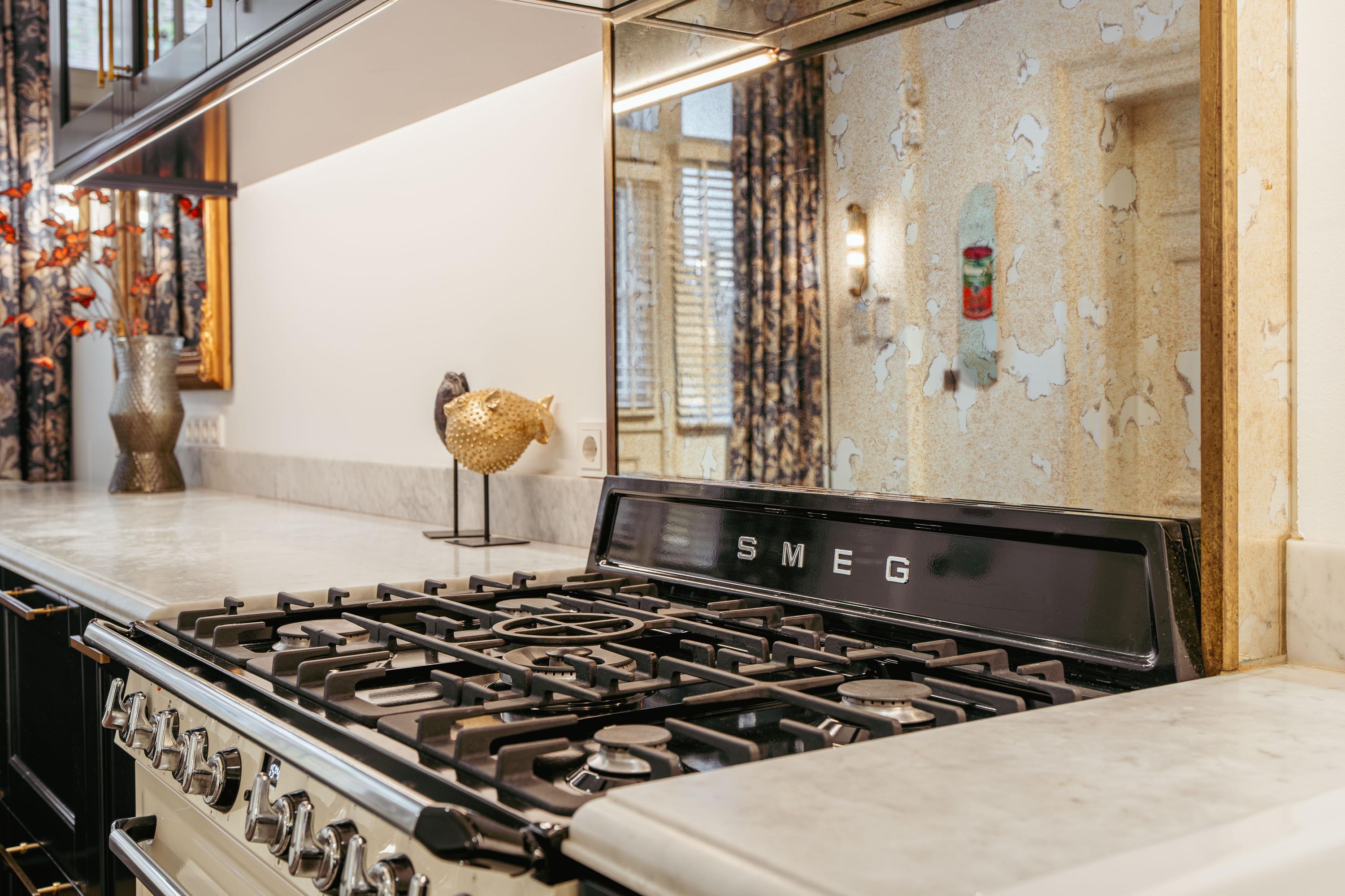Via een statige entree komt u binnen in de ruime en zeer sfeervolle open woonkeuken. De open woonkeuken is voorzien van diverse inbouwapparatuur, zoals vaatwasser, gasfornuis met oven en een Quooker. De verschillende hoogtes in elke ruimte geven deze woning een speels effect. Tussen de open woonkeuken en de zitkamer bevindt zich de werk/- studeerkamer en het ruime toilet. De woonkamer is voorzien van een mooie visgraat parketvloer, een op maat gemaakte inbouwkast en een beamer met scherm. Om de gezellige woonkamer compleet te maken, is er een grote gashaard geplaatst.
