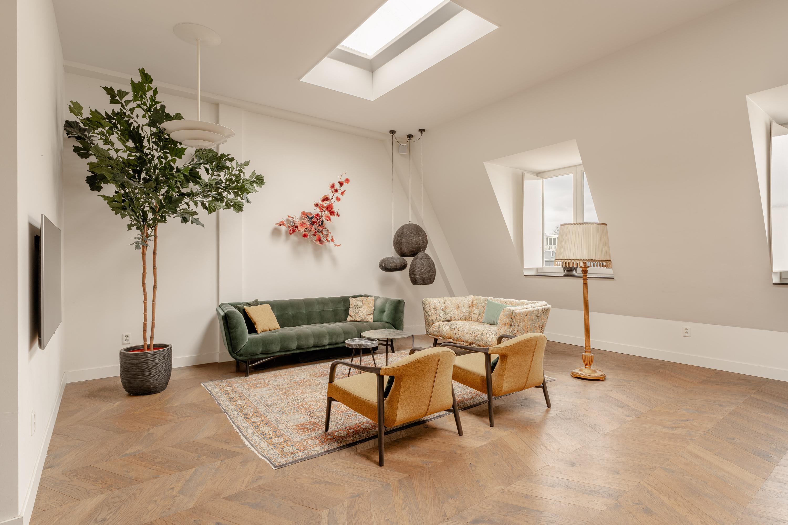 De derde verdieping vormt de woonverdieping van de woning. Hier bevindt zich de royale en lichte woonkamer met open keuken aan de voorzijde. Dankzij de indrukwekkende plafondhoogte en meerdere dakramen valt er veel daglicht naar binnen, wat de ruimte een bijzonder open en ruimtelijk karakter geeft. De houten vloer en de strakke afwerking zorgen voor een warme en moderne uitstraling.
