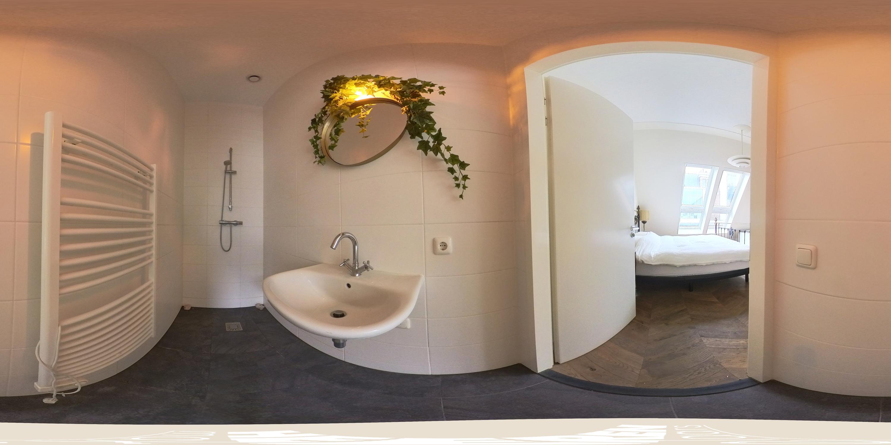 De slaapkamer aan de achterzijde is bijzonder royaal en beschikt over grote raampartijen met Frans balkon, waardoor er veel natuurlijk licht naar binnen valt. De kamer biedt ruim plaats aan een groot bed en kastruimte. Aangrenzend bevindt zich de en-suite badkamer, voorzien van een douche, wastafel en toilet.