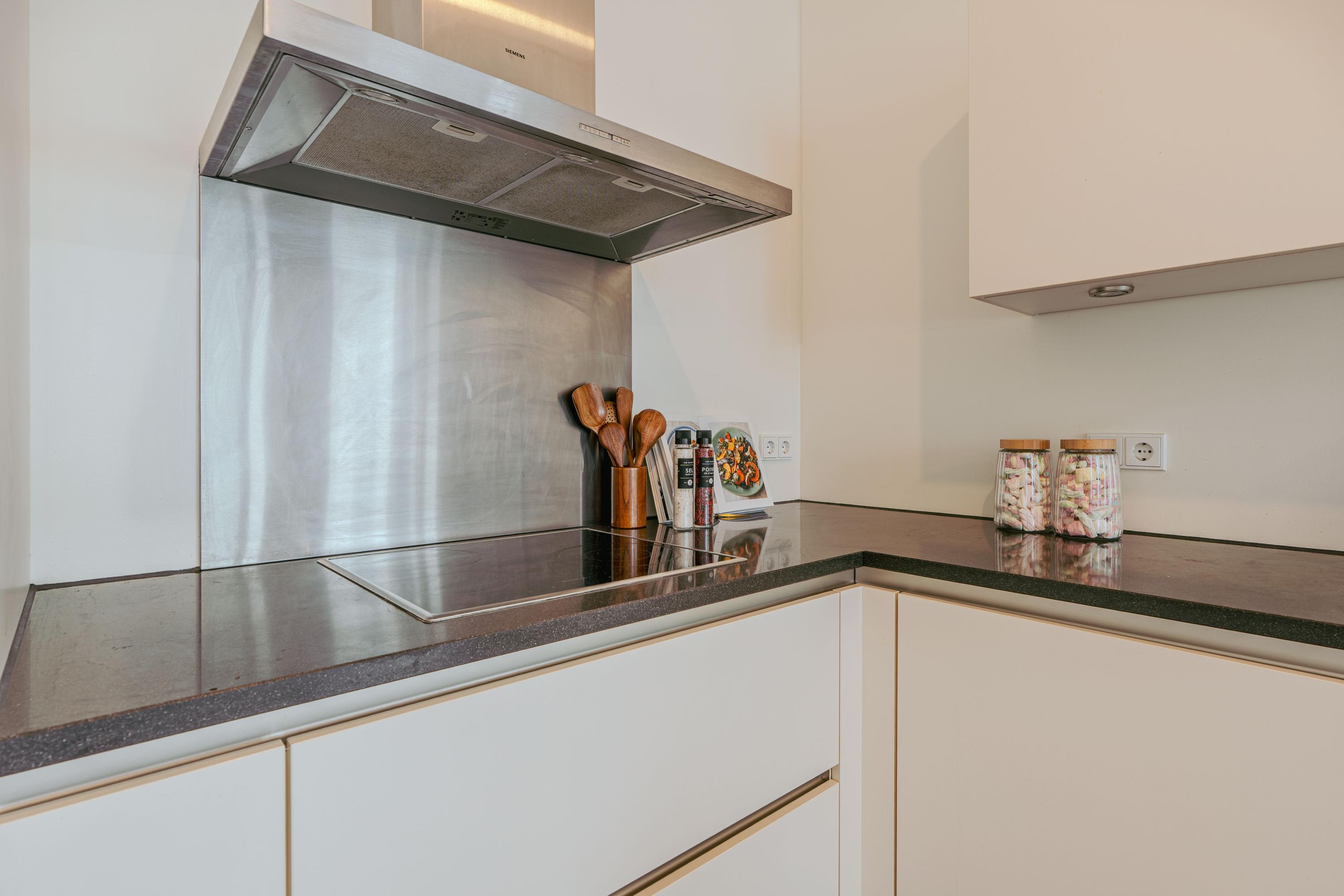 Bij binnenkomst op de 8e verdieping betreedt u een ruime hal met de meterkast, een separaat toilet en ruimte voor een garderobe. Vanuit hier loopt u het ruime woon/leefgedeelte in, waar u niet ontkomt aan het uitzicht wat de ruimte open doet aanvoelen. Middels een schuifpui aan de voorzijde heeft u toegang tot het ruime balkon dat zich over de gehele breedte van het appartement strekt. Een ideale plek om te ontspannen, te genieten van u ontbijt of het uitzicht. De open keuken is gelegen aan de achterzijde en is voorzien van moderne inbouwapparatuur, waaronder een koelkast, vriezer, inductiekookplaat, Quooker en vaatwasser.