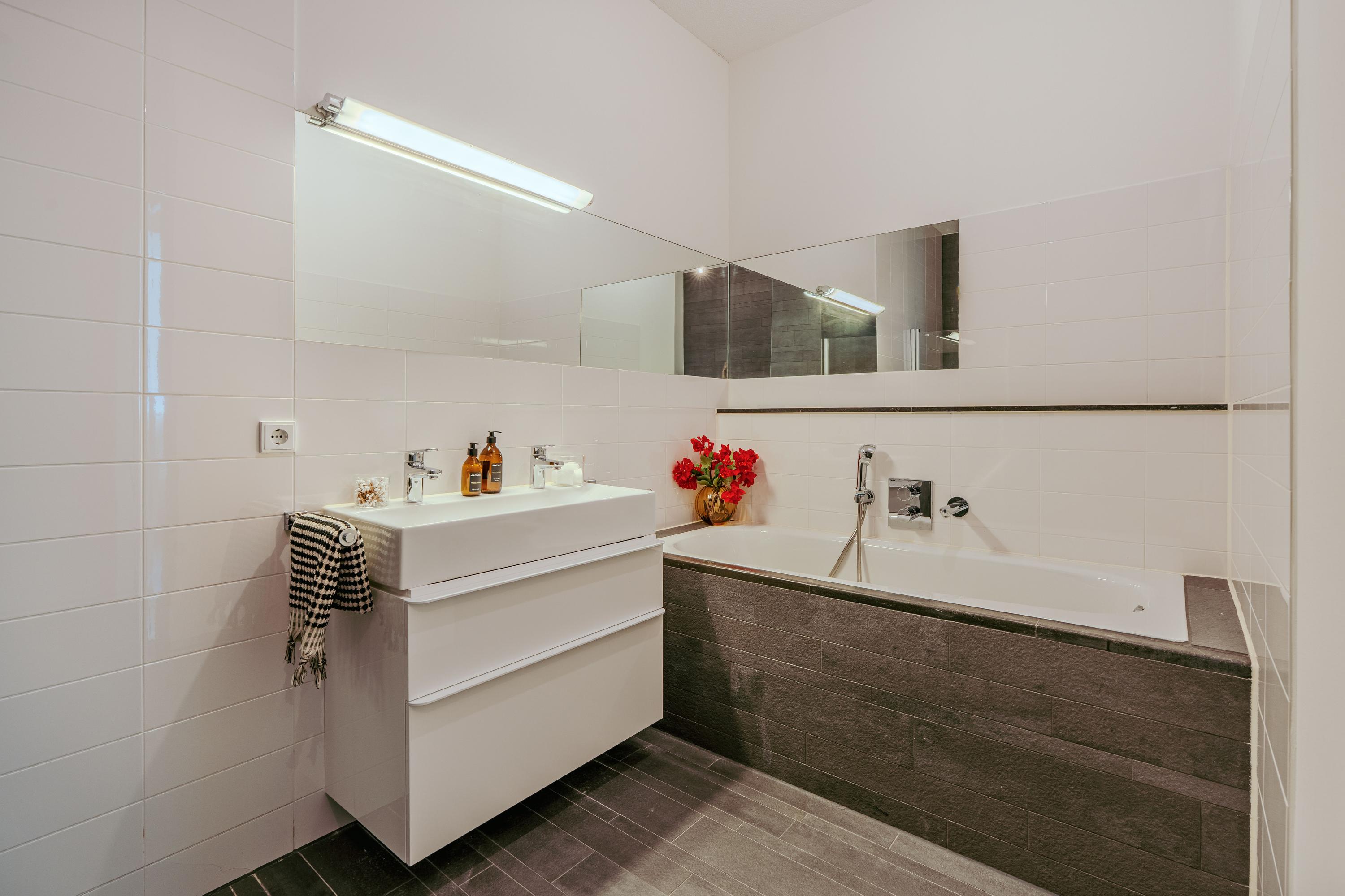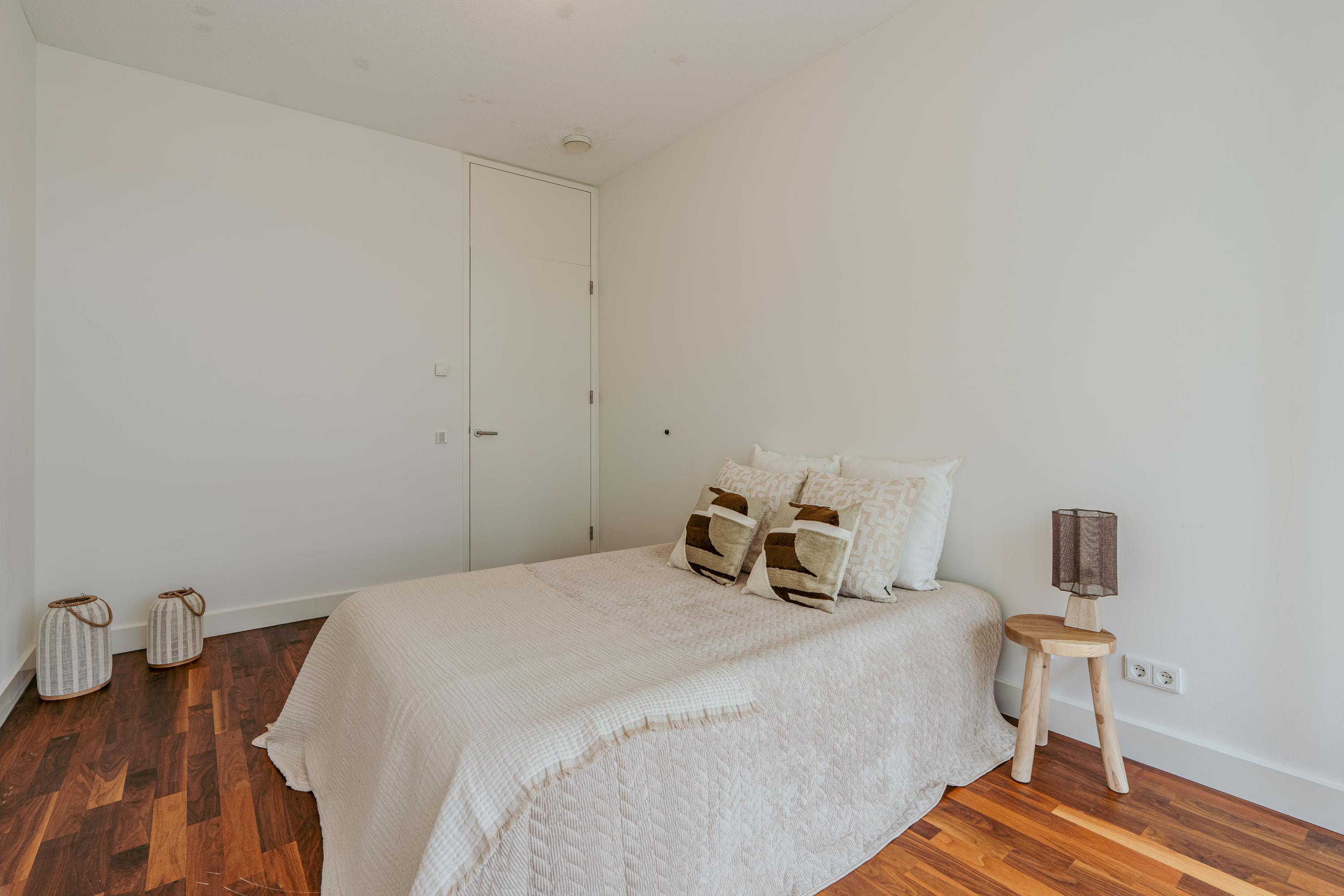 Een tweede hal verbindt de woon/leefruimte met de slaapvertrekken aan de voorzijde en badkamer aan de achterzijde. Beide slaapkamers zijn opvallend ruim en de grote ramen zorgen voor een open gevoel. De kamers brengen rust met zich mee. De hoofdslaapkamer beschikt eveneens over een serre en voelt daardoor extra ruimtelijk aan. Achterin bevindt zich een moderne badkamer, met wastafelmeubel, een ligbad, bidet en inloopdouche. U heeft vanuit de hal ook nog toegang tot een ruime berging voor extra opbergruimte.