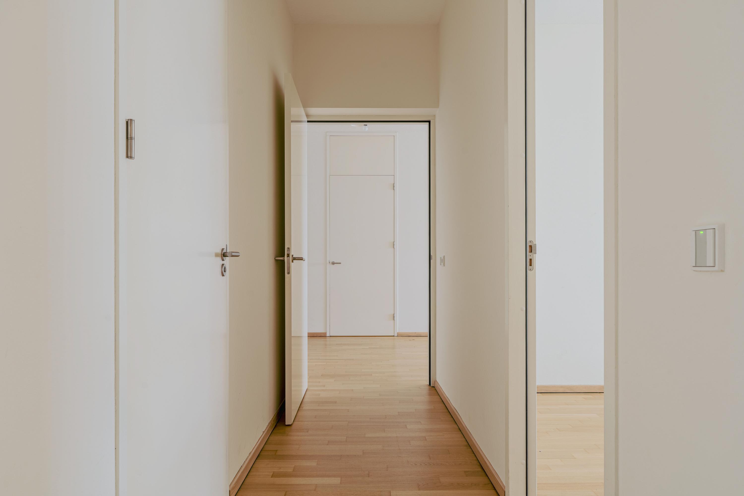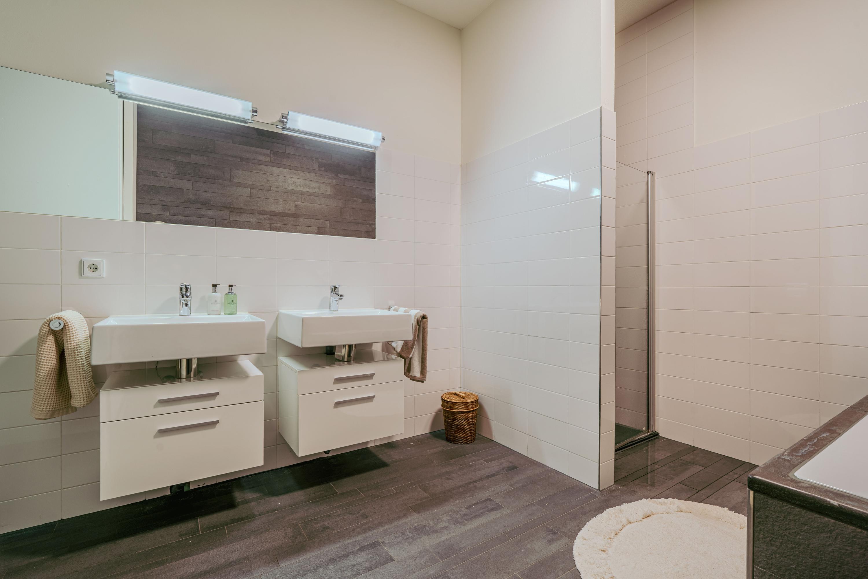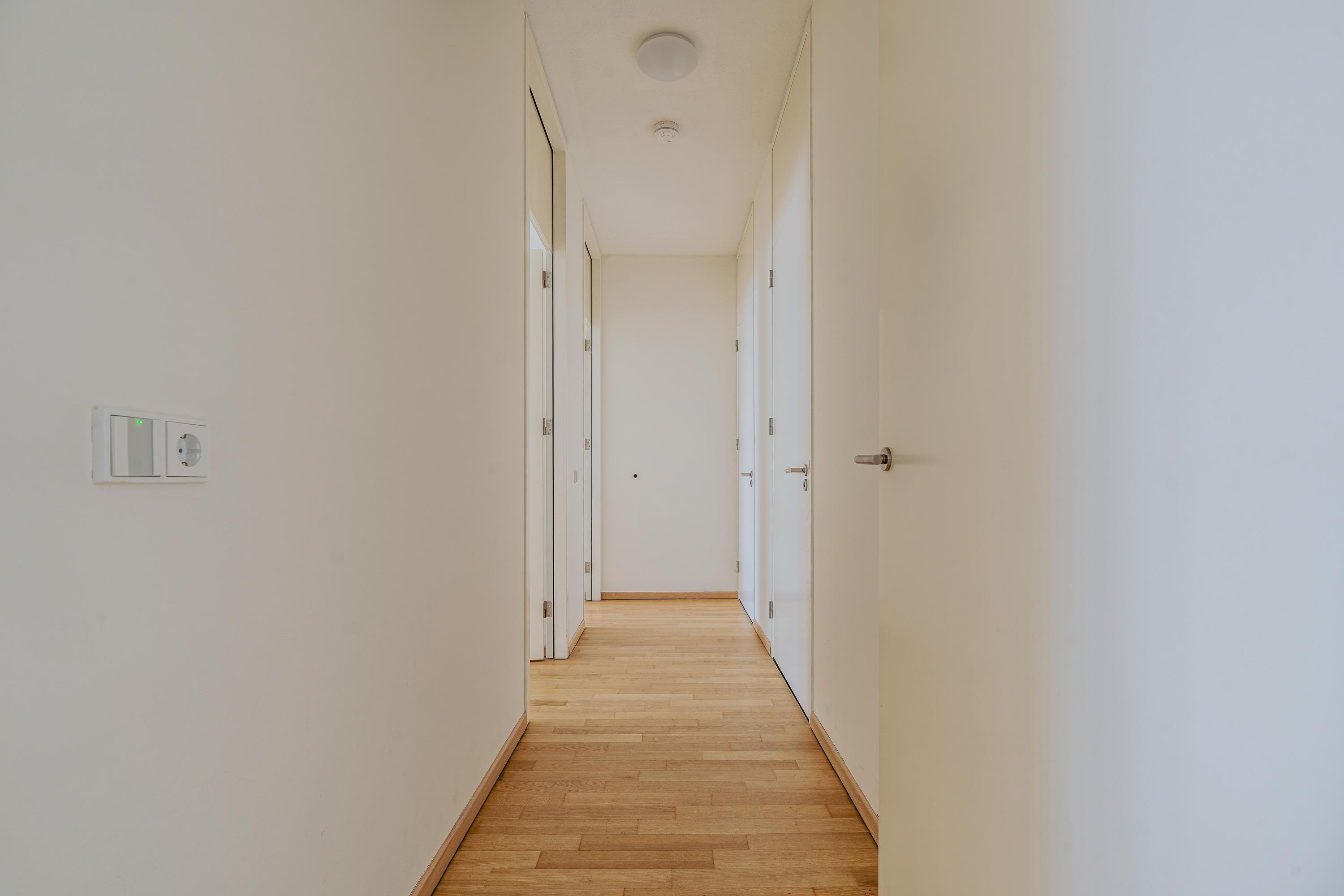 Een tweede hal verbindt de woonruimte met de slaapvertrekken aan de voorzijde en badkamers aan de achterzijde. Beide slaapkamers zijn opvallend ruim en over de lengte gestrekt, wat zorgt voor een open en rustgevende sfeer. De hoofdslaapkamer beschikt eveneens over een serre en voelt daardoor extra ruimtelijk aan. Achterin bevinden zich twee moderne badkamers, elk met dubbele wastafelmeubels, een ligbad en inloopdouche.