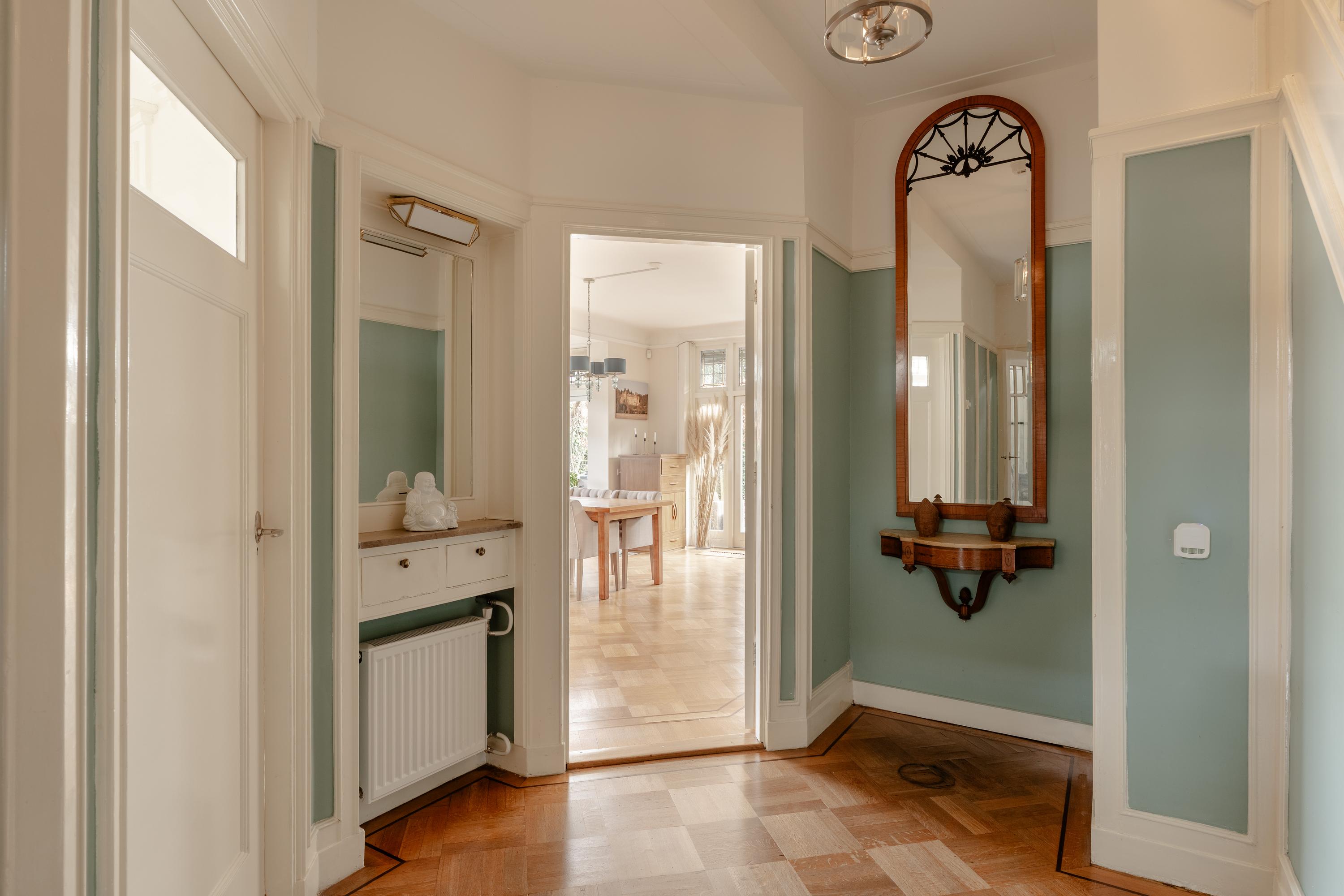 U betreedt de woning via de statige entree met tochtportaal, waarna u uitkomt in de ruime centrale hal. In de hal bevinden zich de garderobe en een separaat toilet.