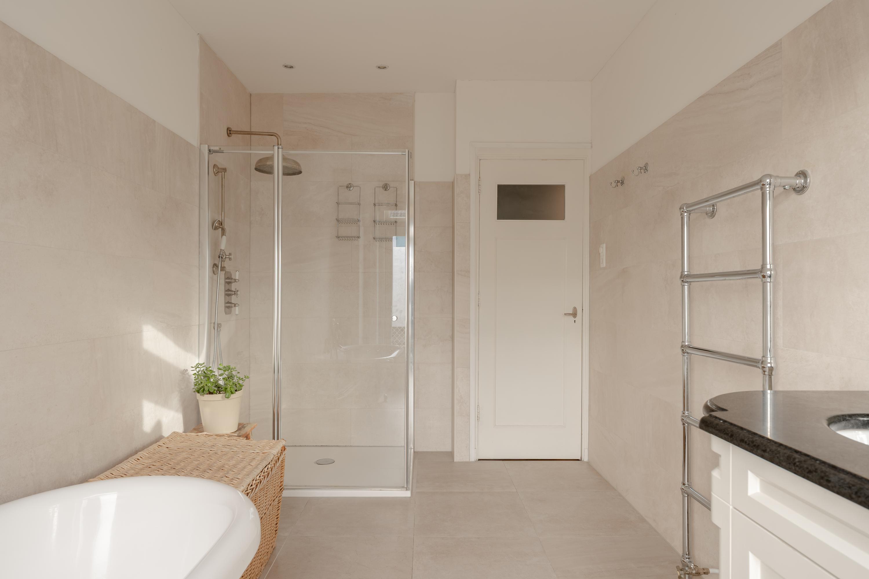 Aan de achterzijde van de woning bevindt zich de ruime master bedroom met toegang tot het balkon. De klassieke badkamer, uitgevoerd in beton ciré, beschikt over een douche, dubbele wastafel, handdoekradiator en een vrijstaand ligbad. Via de openslaande deuren in de badkamer heeft u eveneens toegang tot het balkon.