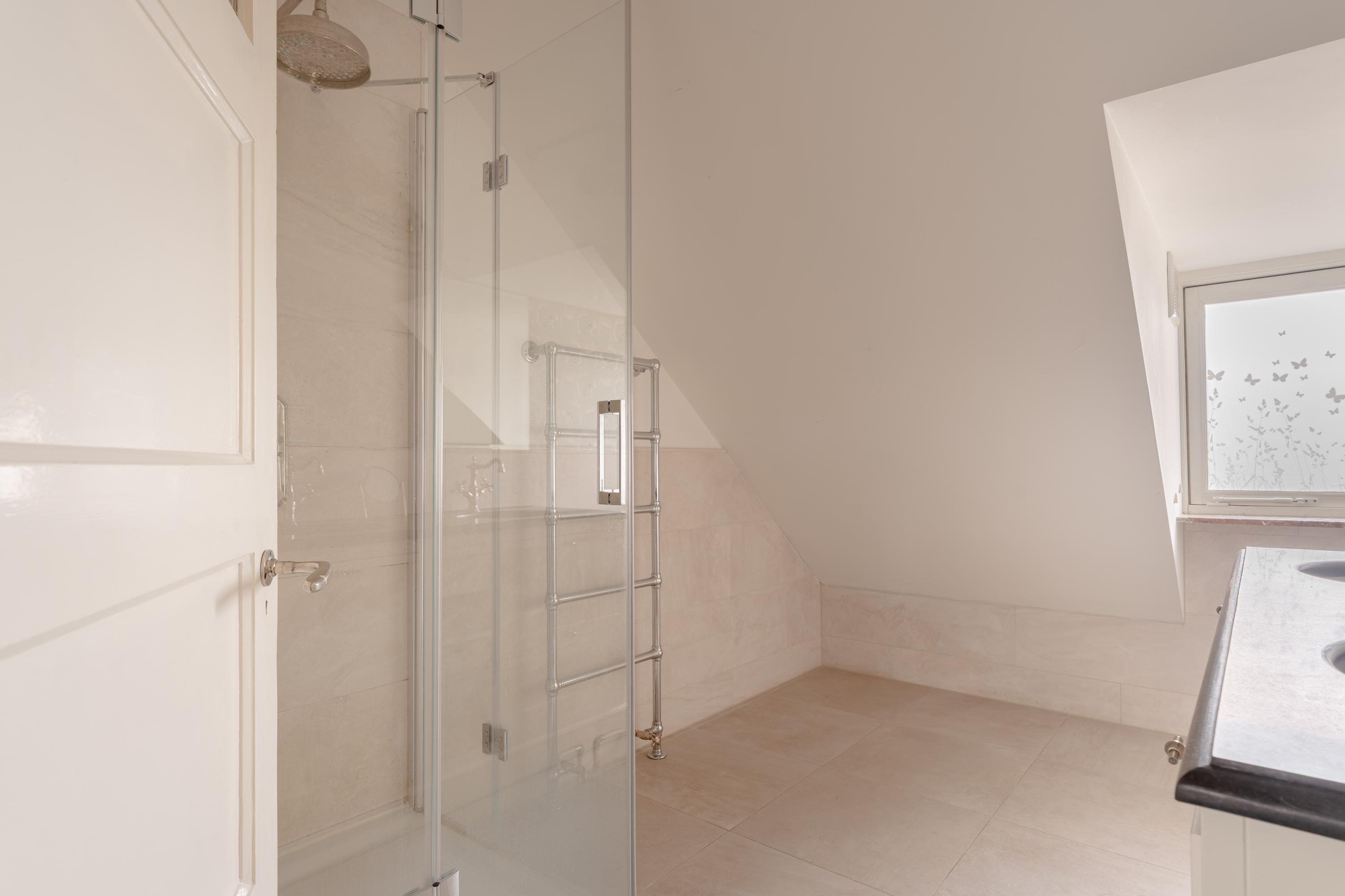 Aan de voorzijde bevindt zich een derde slaapkamer. De badkamer op deze verdieping is voorzien van een dubbele wastafel met meubel, douche en een handdoekradiator.