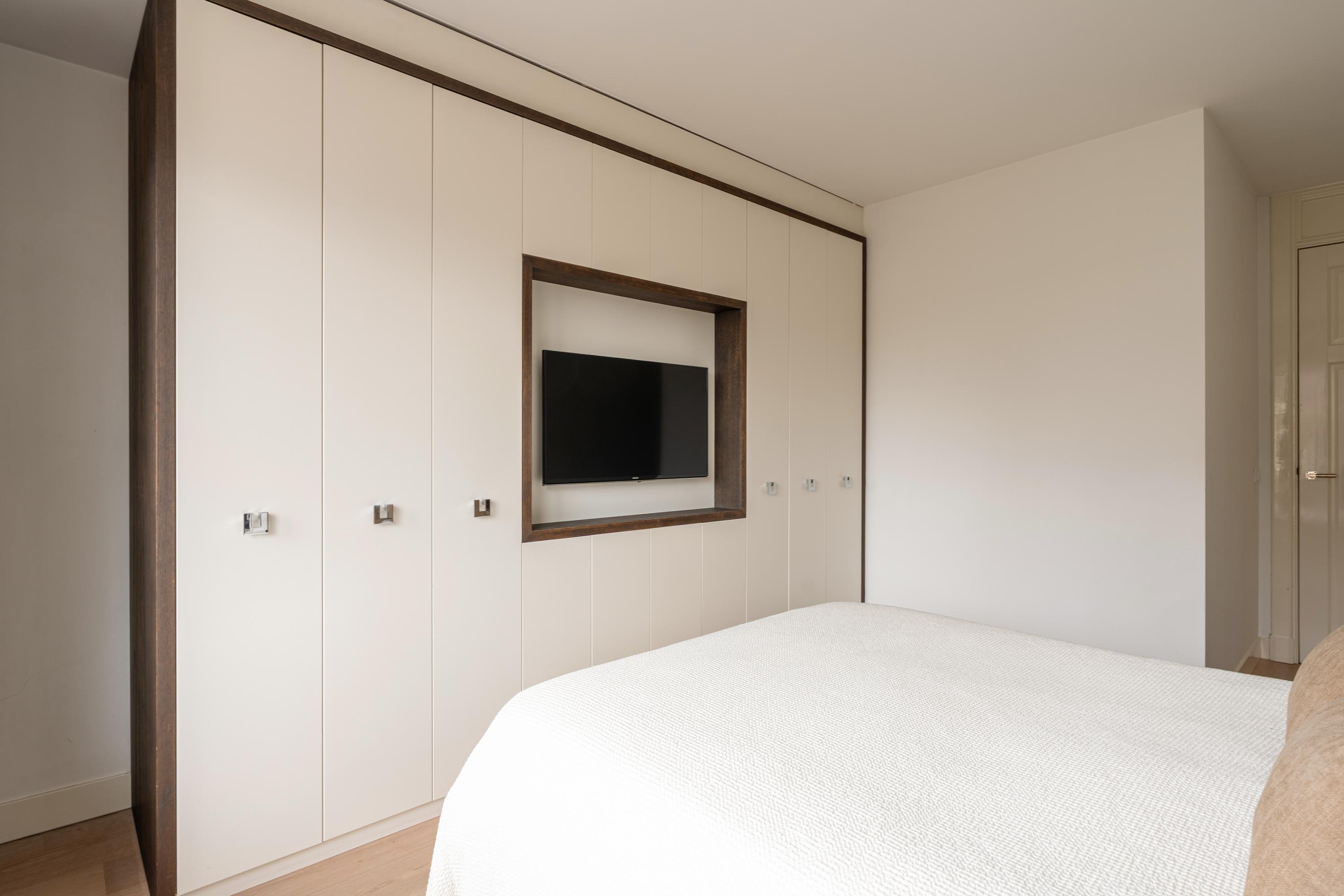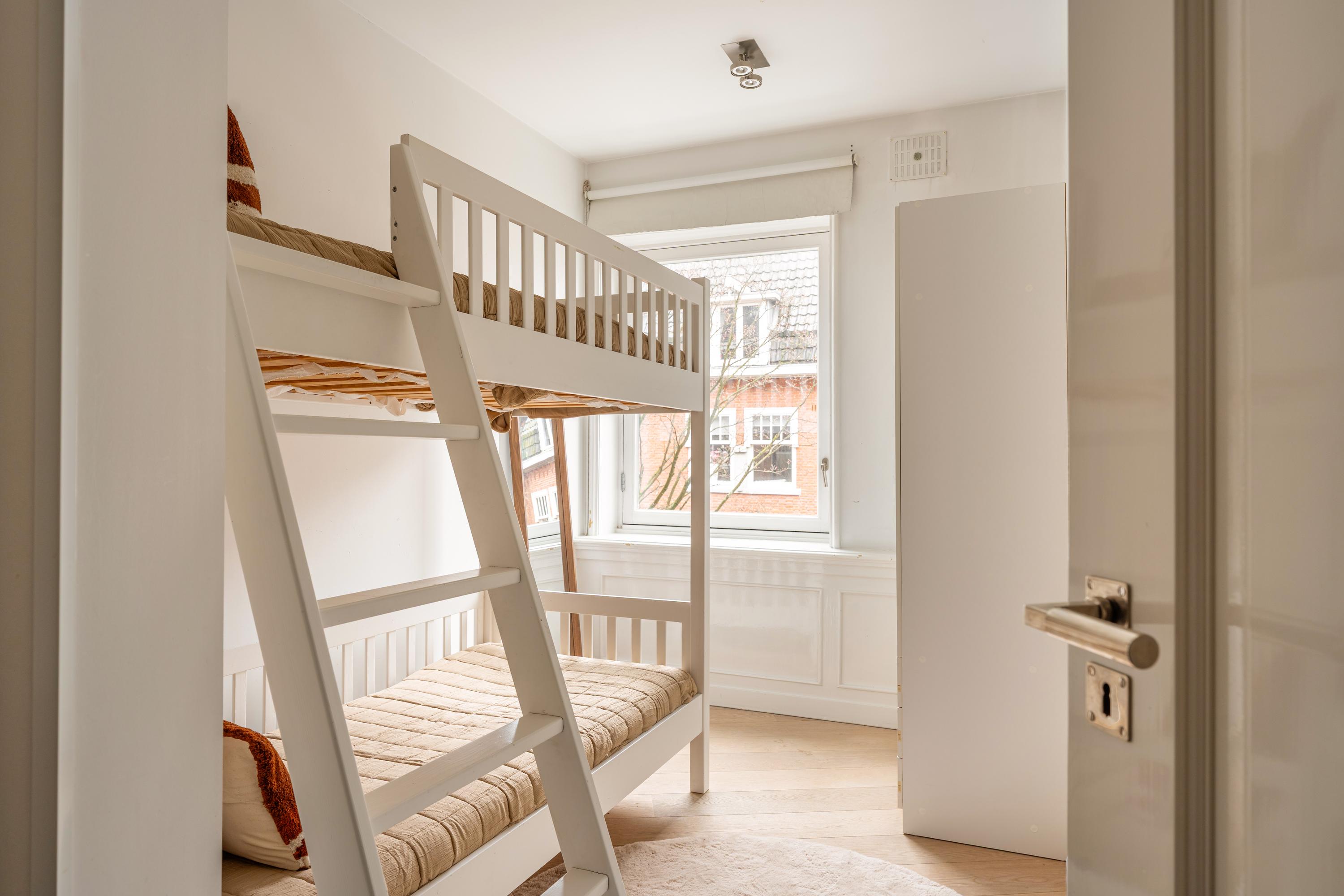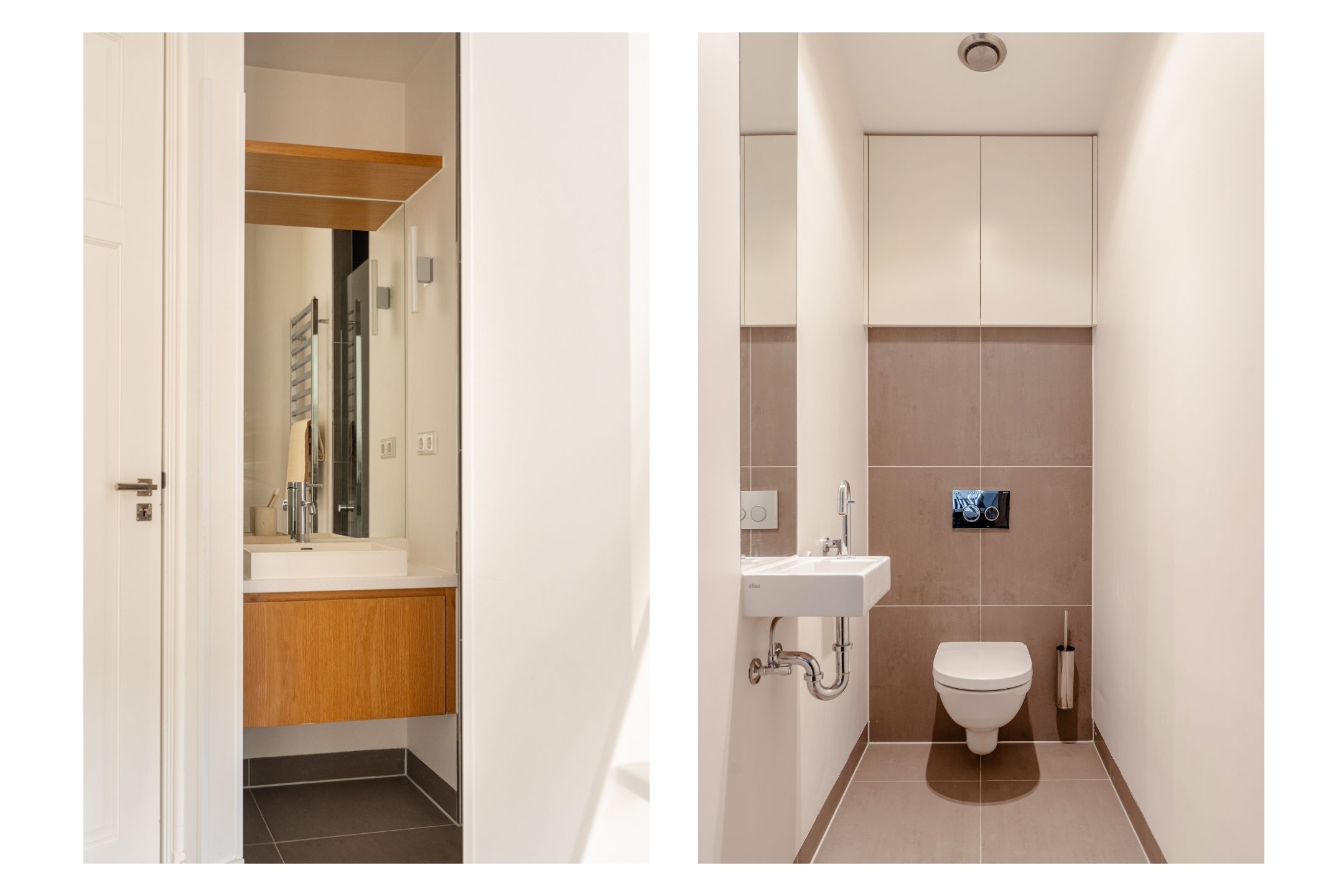 Via de trap in de woonkamer bereikt u de derde en tevens bovenste verdieping van het appartement. Hier bevinden zich twee goed bemeten slaapkamers, beide voorzien van grote raampartijen en maatwerk inbouwkasten. De master bedroom beschikt bovendien over een stijlvol geïntegreerde televisie in de kastenwand. De moderne badkamer is uitgerust met een ruim ligbad, een dubbele wastafel met meubel en een toilet. Tevens bevinden zich hier de aansluitingen voor wasmachine en droger.