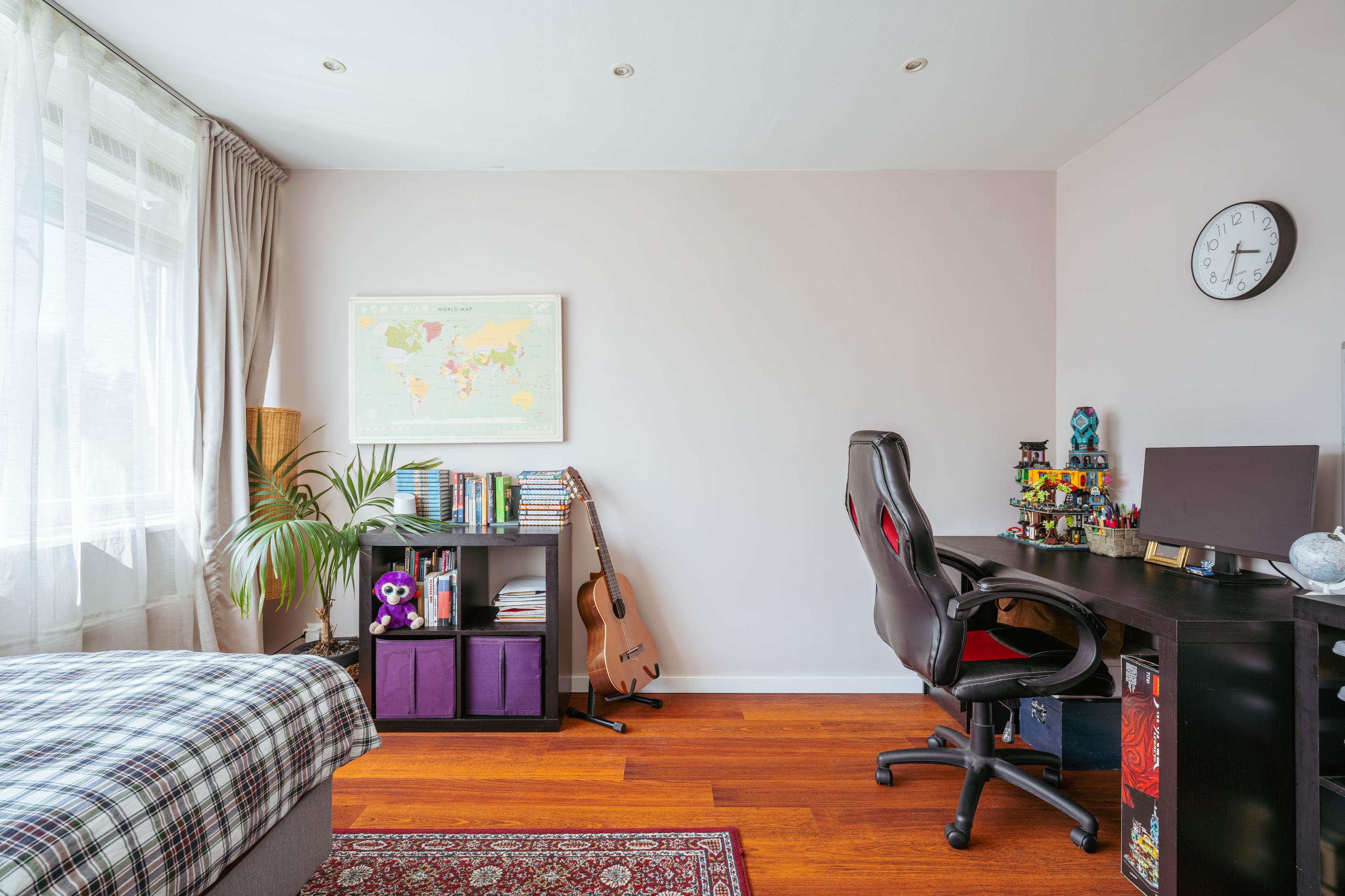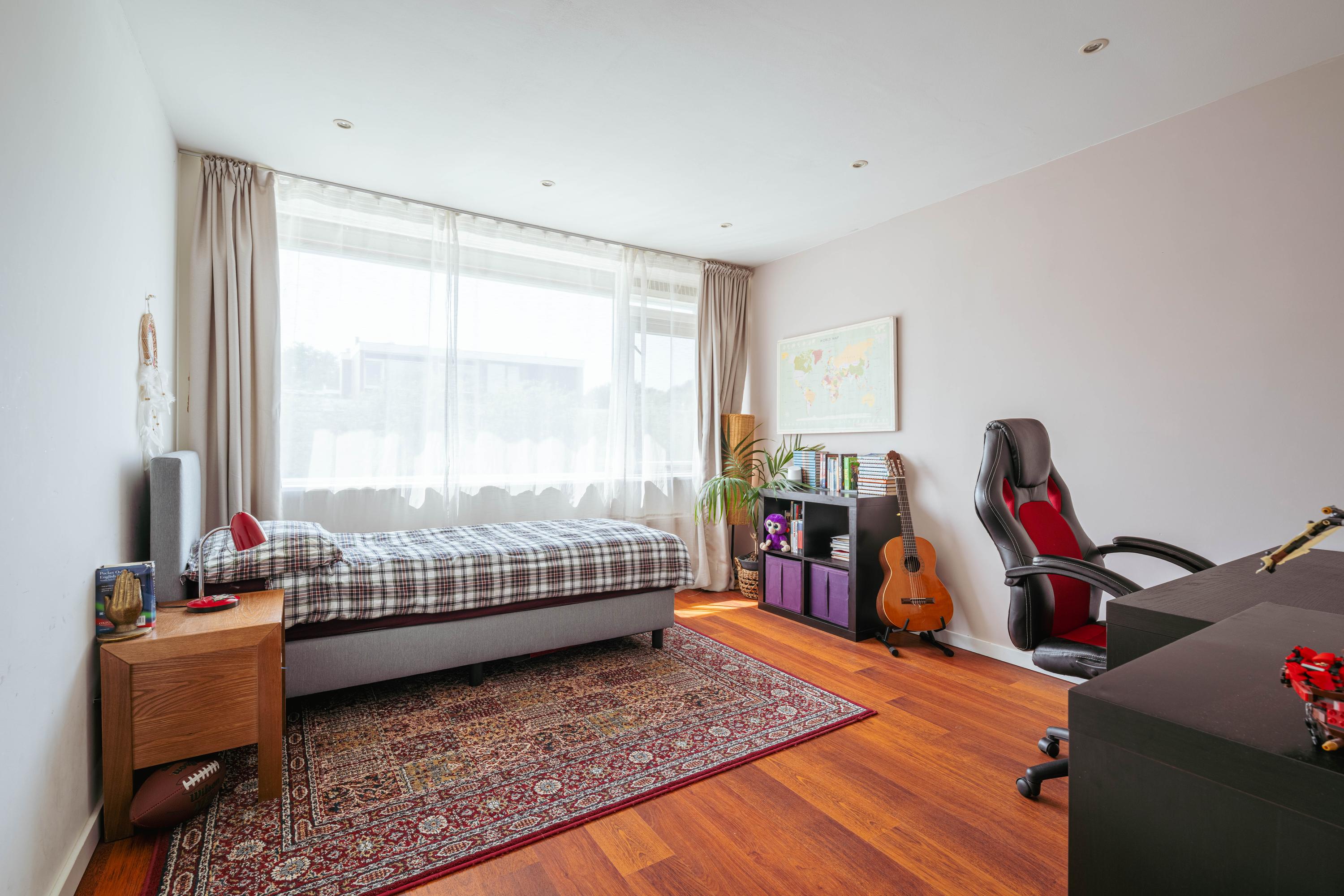 De overloop biedt toegang tot alle vertrekken op deze verdieping. Er zijn vier ruime slaapkamers, waarvan twee aan de voorzijde en twee aan de achterzijde van de woning. De centraal gelegen badkamer is voorzien van een dubbele wastafel met meubel, een inloopdouche, toilet en aansluitingen voor wasmachine en droger.