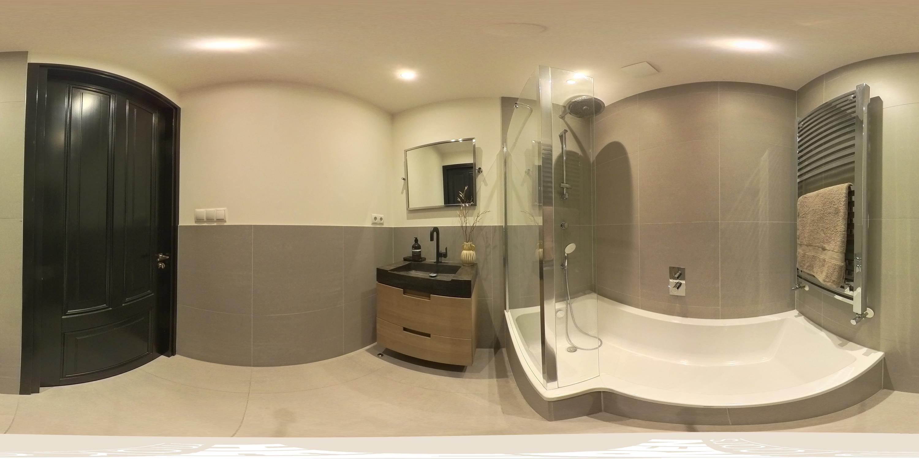 De tweede badkamer op deze verdieping is uitgerust met een ligbad met douche en een wastafelmeubel. Daarnaast is er een separaat toilet en een aparte ruimte voor de wasmachine en droger.