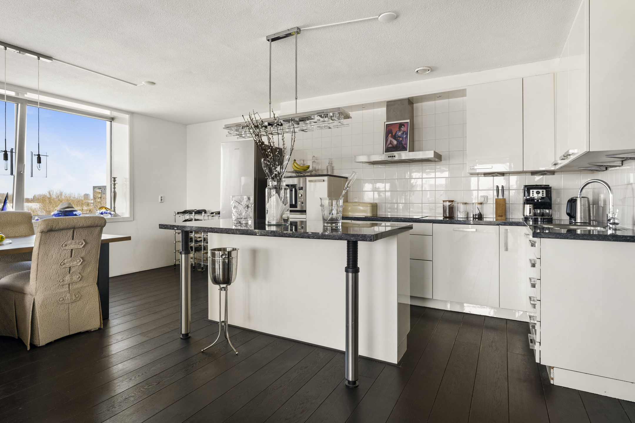 De woning heeft een luxe woonkeuken met kookeiland in lichte kleuren met een antracieten hardstenen blad. De keuken heeft diverse inbouwapparatuur waaronder een gaskookplaat met afzuigkap, een koelkast, vaatwasser, een diepvries, een oven en een magnetron. De hele woning heeft een stoere eiken parketvloer.