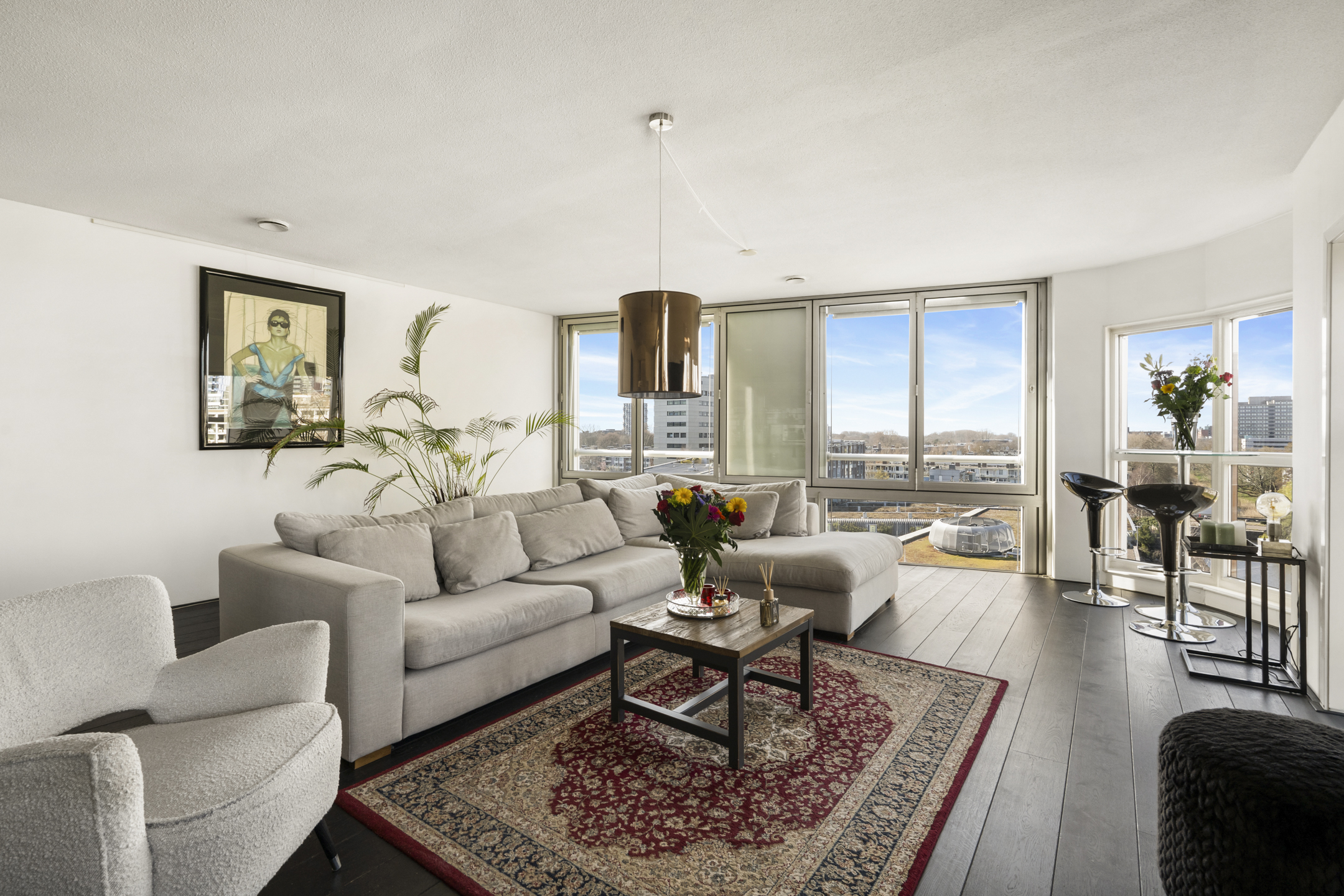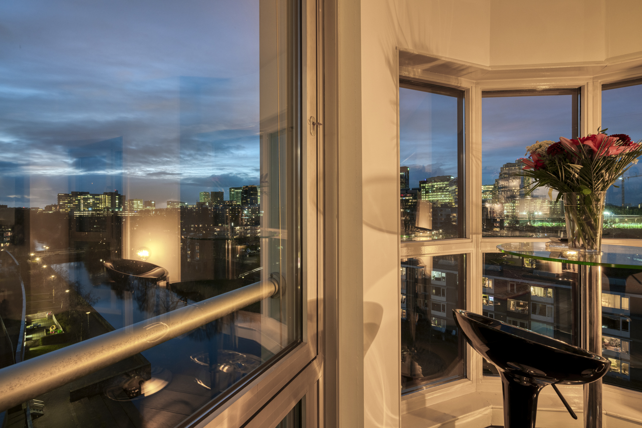 Door de ligging en de vele ramen aan zowel de zuidwest als aan de noordkant in combinatie met een ligging op de zevende (!) verdieping heeft het appartement een spectaculair uitzicht over het water en de skyline van de Amsterdamse Zuidas.