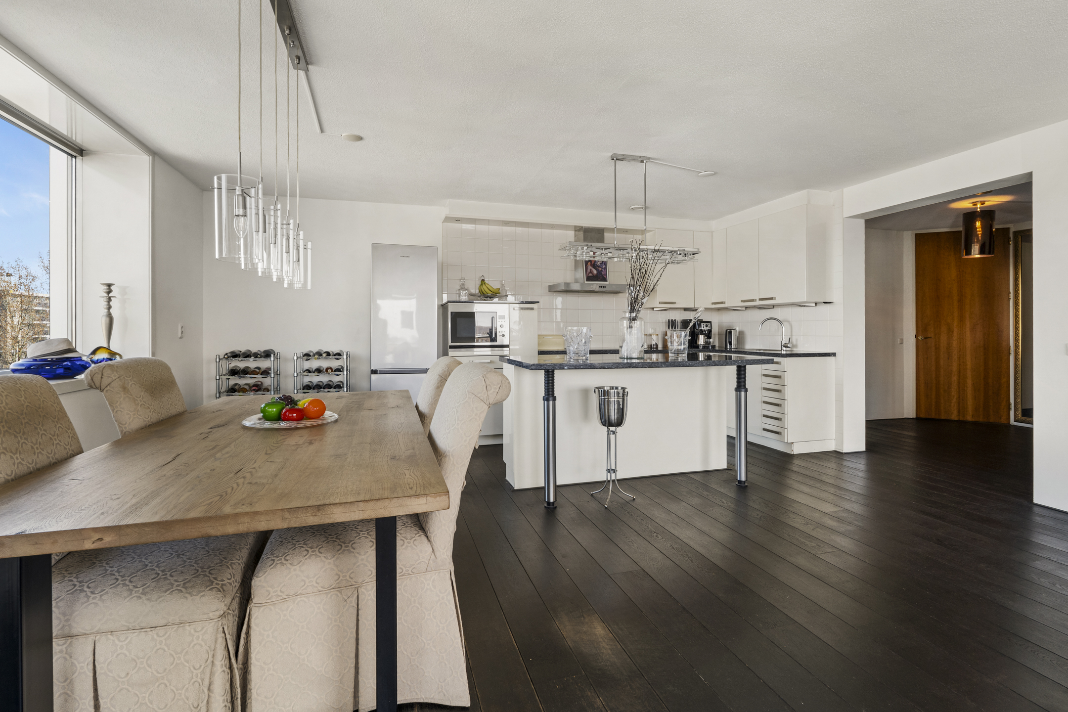 Ruime living, door de hoekligging en de gebogen hoekramen trekt het stadse en waterrijke vergezicht direct de aandacht mede omdat ook hier de gevel vrijwel geheel uit glas bestaat.