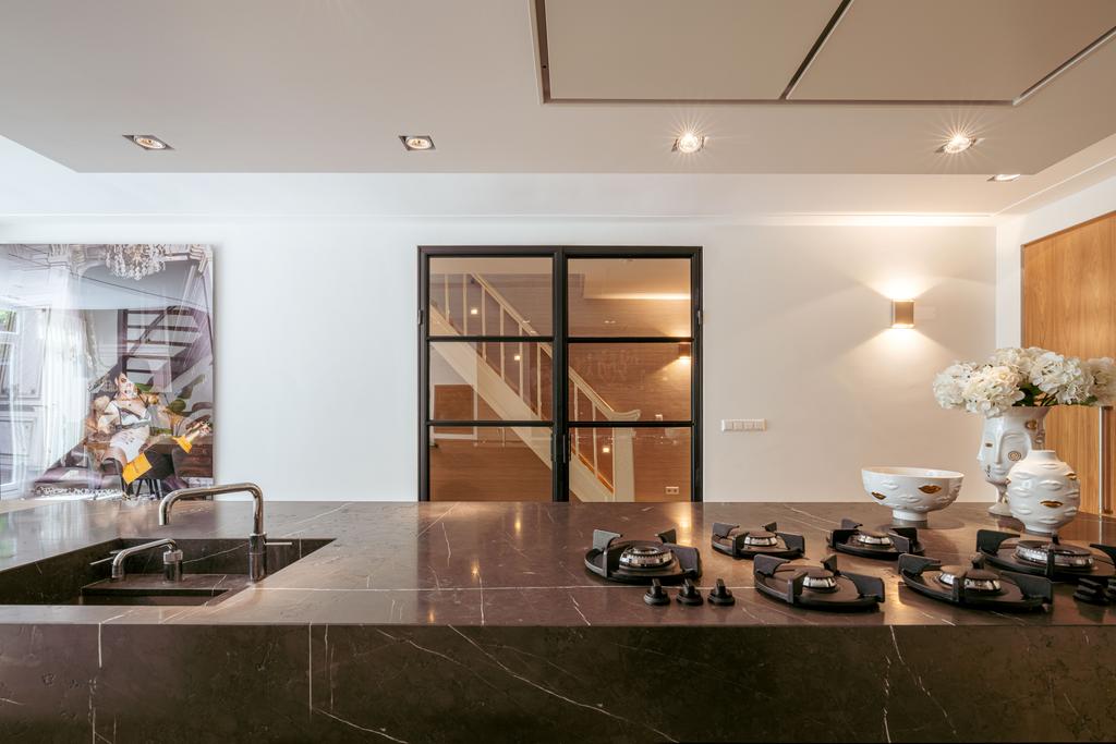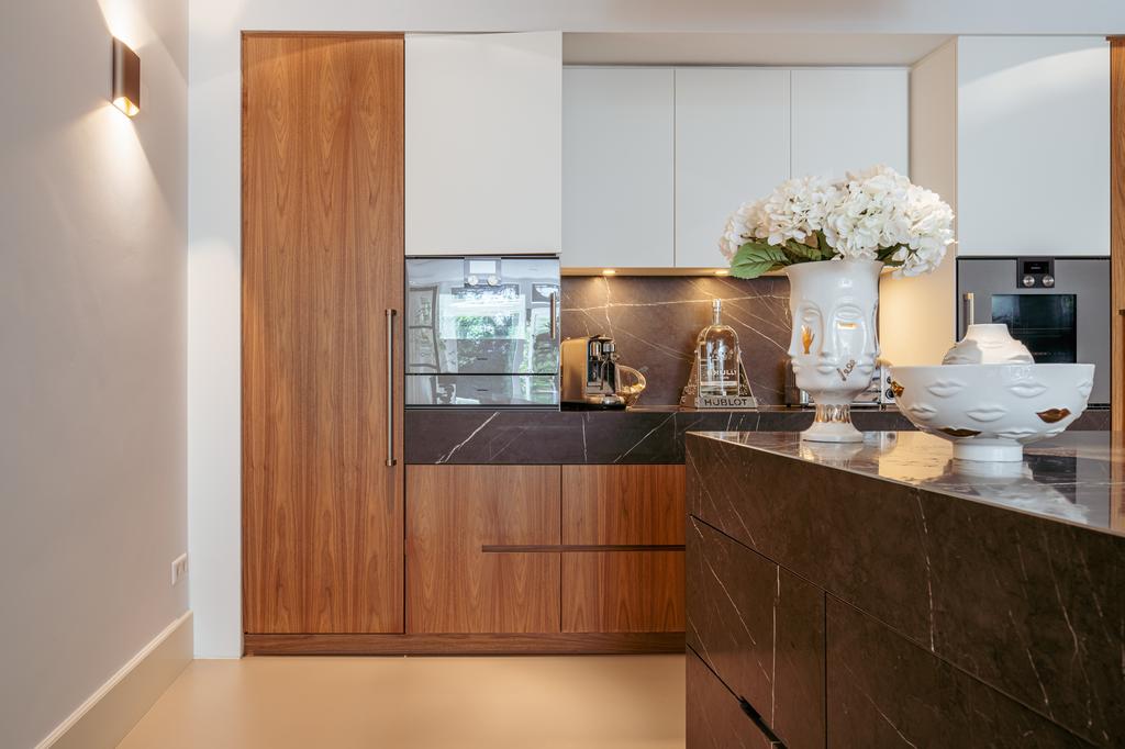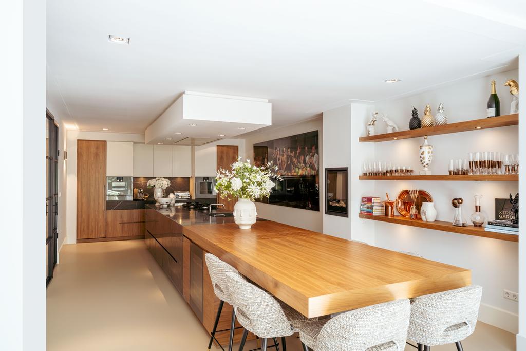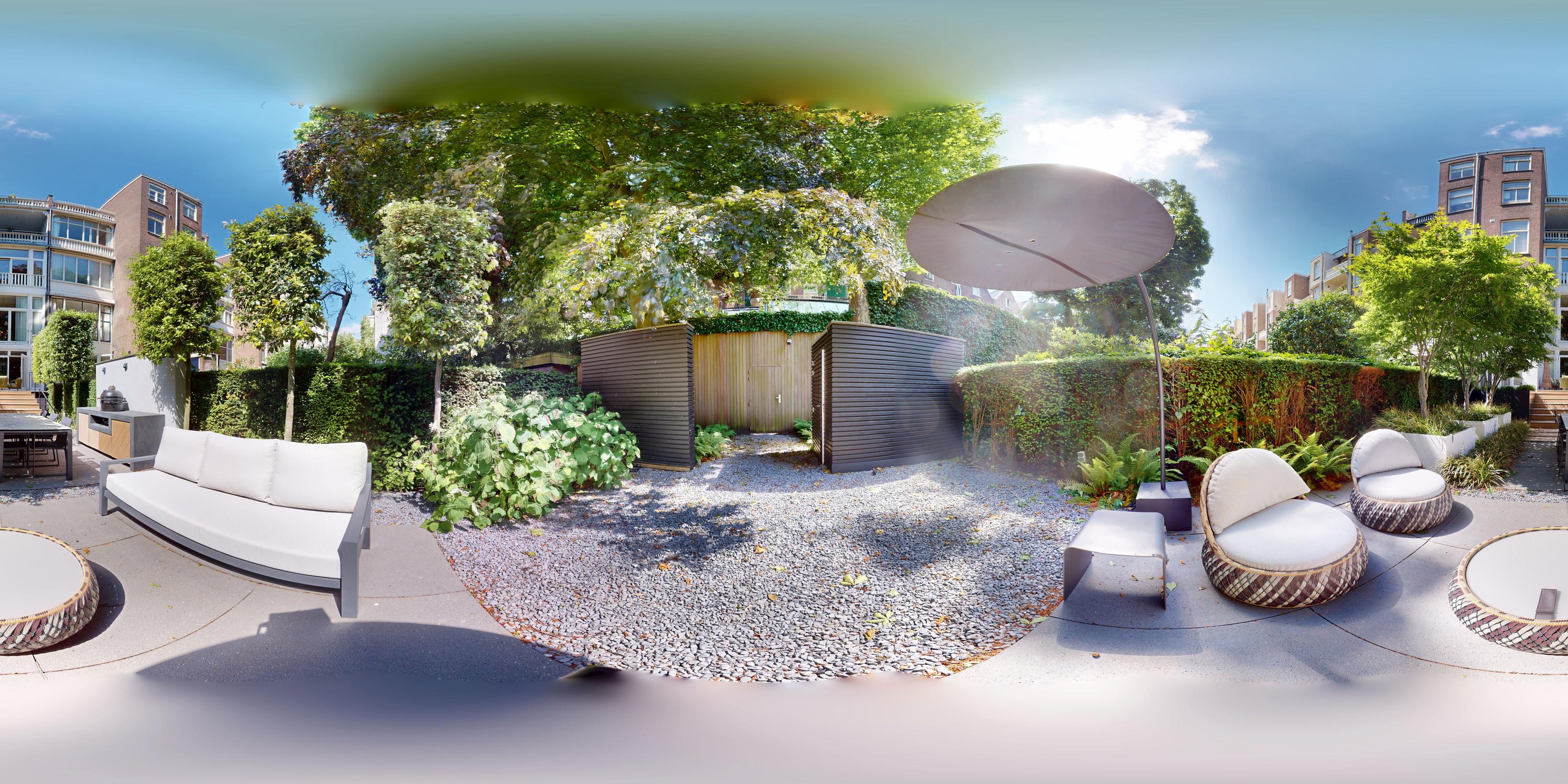 De woning is toegankelijk zowel vanaf de bel-etage als vanuit het souterrain, dat bereikbaar is via de trap of lift vanuit de hal of direct vanuit de bovengelegen eetkamer. Bij binnenkomst op deze verdieping treedt u de hal binnen, waar zich een separaat toilet bevindt. Aan de voorzijde ligt een slaapkamer met een en-suite badkamer, voorzien van een wastafel en douche. Deze multifunctionele ruimte wordt momenteel gebruikt als gym, maar is flexibel inzetbaar. De luxe uitgevoerde open woonkeuken bevindt zich aan de achterzijde en vormt het kloppend hart van deze verdieping. De keuken is uitgerust met hoogwaardige inbouwapparatuur van het merk Gaggenau, waaronder een koelkast, vriezer, Quooker, vijfpits gasfornuis geïntegreerd in het aanrecht, oven, stoomoven, vaatwasser en wijnklimaatkast. Het massief natuurstenen aanrechtblad in combinatie met het houten bargedeelte zorgt voor een warme, stijlvolle uitstraling. De keuken beschikt bovendien over bijzonder veel opbergruimte en is toegankelijk vanuit de eetkamer op de bel-etage of via openslaande deuren vanuit de hal. Een sfeervolle gashaard maakt de ruimte helemaal af. Aangrenzend aan de keuken bevindt zich een slaapkamer – momenteel in gebruik als werkkamer – die, net als de keuken, via openslaande deuren directe toegang biedt tot het ruime terras. Dit terras leidt via een trap naar de fraai aangelegde, op het zuiden gelegen achtertuin, die ook bereikbaar is via een achterom aan het Schapenburgerpad. Deze toegang biedt de zeldzame mogelijkheid om de achtertuin te betreden en bijvoorbeeld fietsen direct in de tuin te plaatsen, uniek in het centrum van Amsterdam. De tuin, onder architectuur aangelegd door Erik van Gelder, beschikt over een complete buitenkeuken, ideaal voor lange zomeravonden, en is ook voorzien van een vrijstaande berging. Hier geniet u in alle rust van zon en privacy, tot in de late uurtjes.