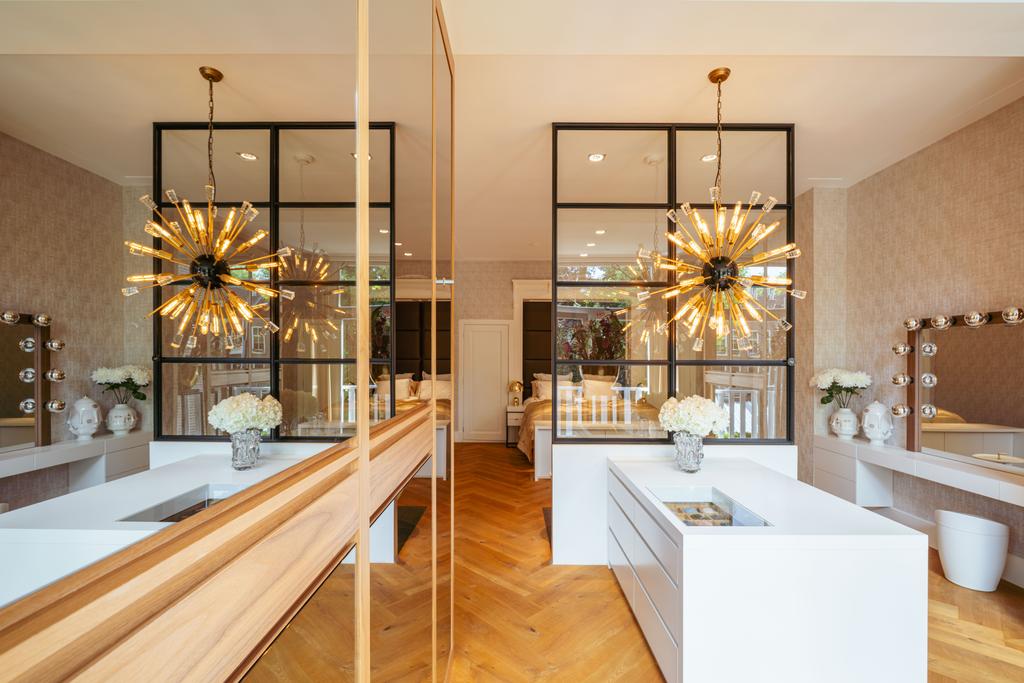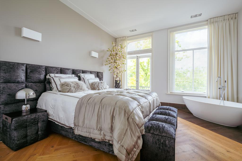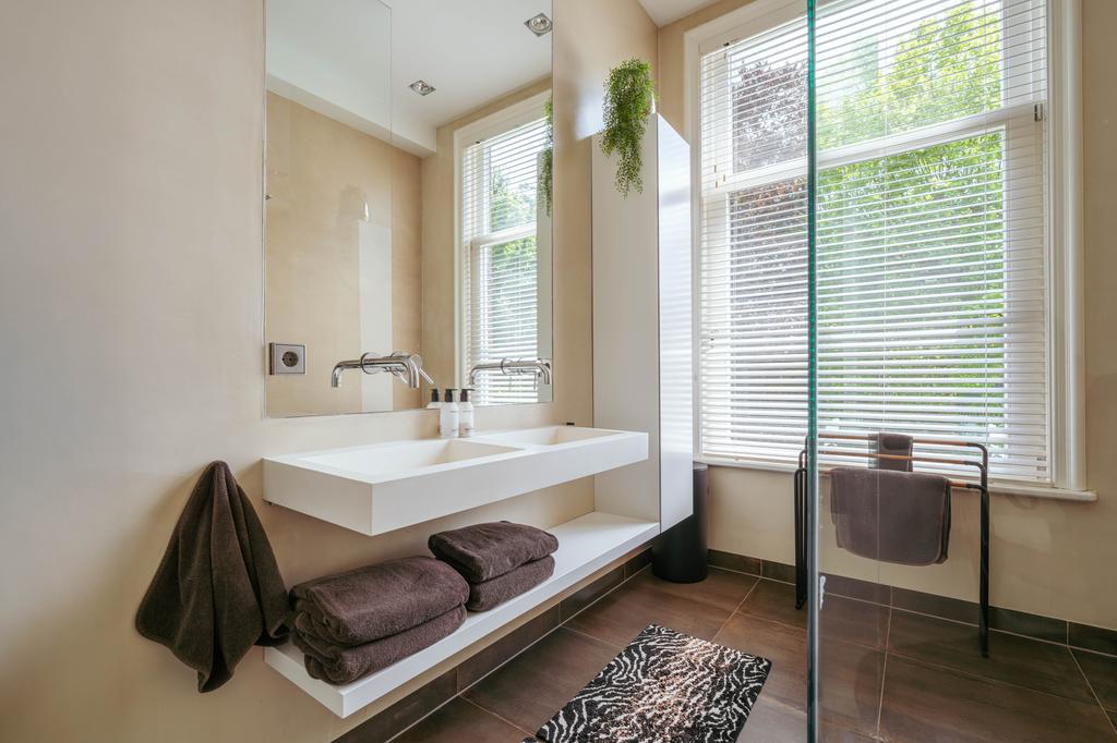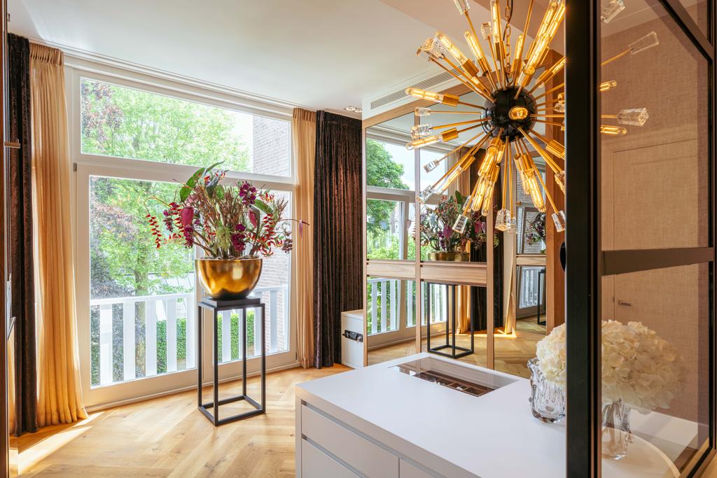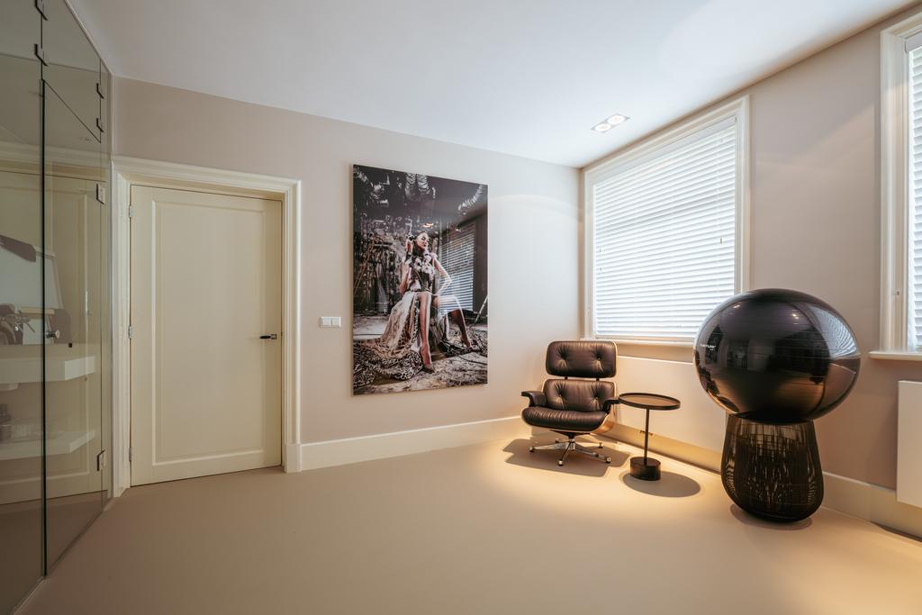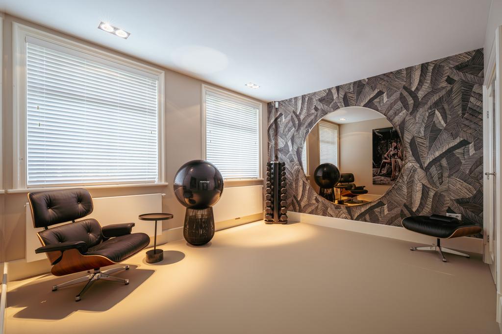 De gehele verdieping is hoogwaardig afgewerkt met stijlvol en sfeervol behang, wat de ruimte warmte en karakter geeft. Grote raampartijen aan beide zijden van de verdieping zorgen voor een uitzonderlijke hoeveelheid daglicht en benadrukken de ruimtelijkheid en luxe van het geheel.