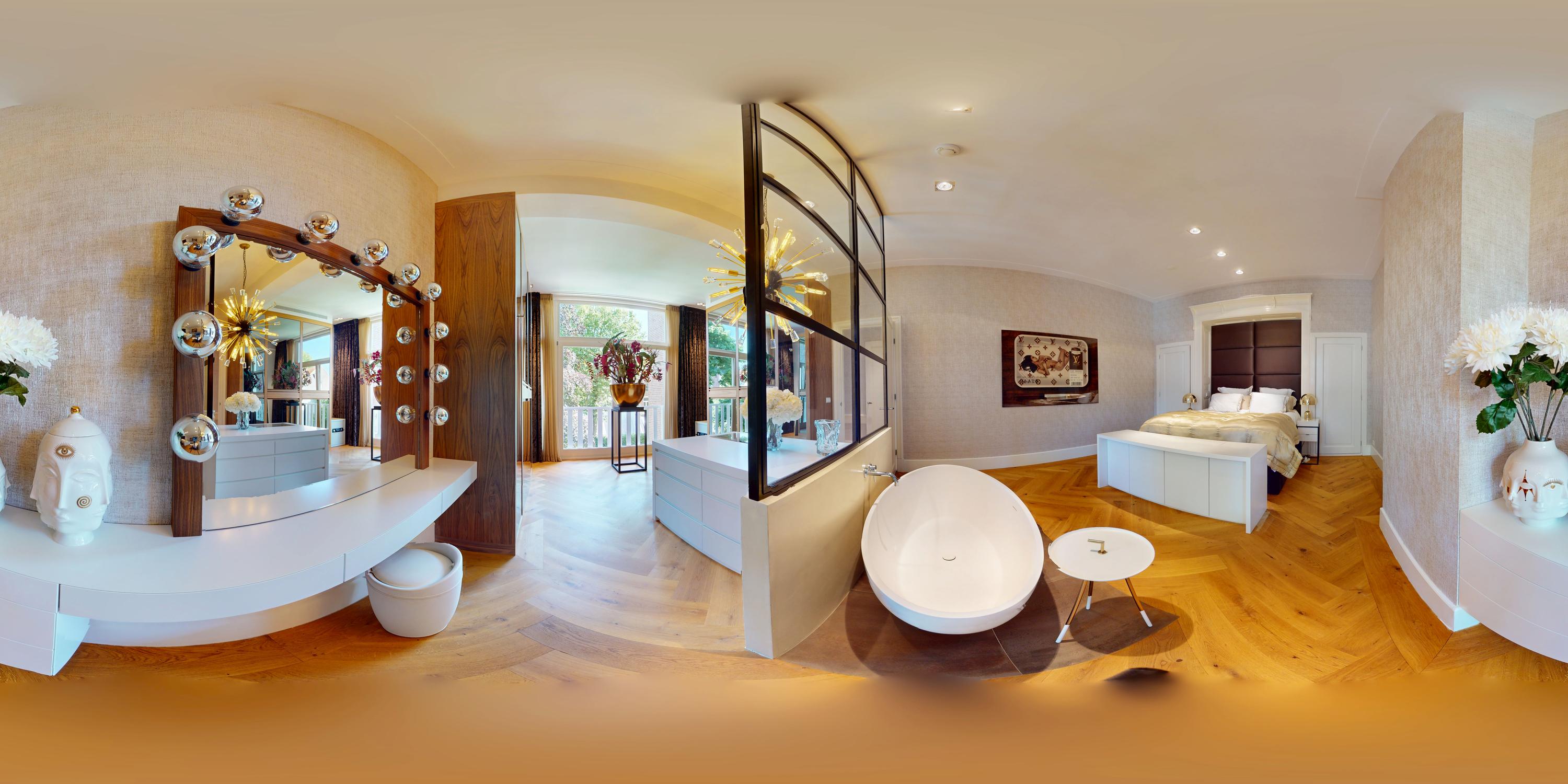 Via de trap of lift bereikt u de overloop die toegang biedt tot alle vertrekken op deze verdieping. Aan de achterzijde bevindt zich de bijzonder ruime master bedroom, met een stijlvolle indeling waarbij een glazen wand een subtiele scheiding vormt tussen het slaapgedeelte, het badgedeelte en de kleedruimte. De kamer is voorzien van ingebouwde kasten, een vrijstaand ligbad en openslaande deuren die uitzicht bieden op de fraai aangelegde tuin. Eveneens aan de achterzijde bevindt zich een moderne badkamer, uitgerust met een dubbele wastafel, een ruim opgezette inloopdouche en een toilet. Aan de voorzijde vindt u een tweede, royaal bemeten slaapkamer, compleet met een sfeervolle gashaard en een vrijstaand ligbad. Ook deze kamer beschikt over openslaande deuren naar een balkon met adembenemend uitzicht over het Vondelpark. Aangrenzend aan deze kamer, een tweede badkamer voorzien van douche en wastafel. Daarnaast is er nog een derde slaapkamer, bereikbaar via de hal met sfeervolle loggia te bereiken middels openslaande deuren.