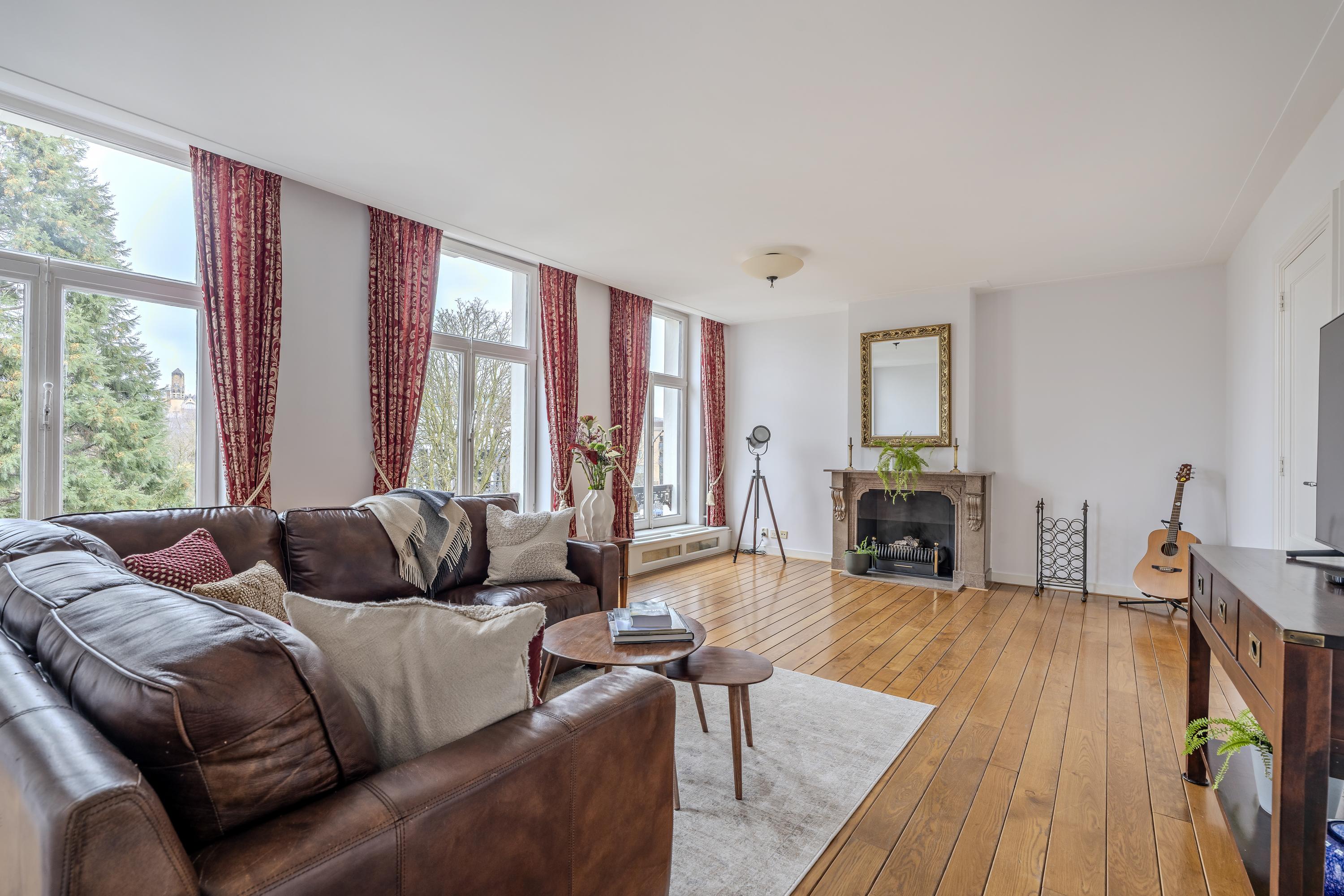 Entrance on the third floor. From the central hall, you have access to all rooms. At the front of the apartment, you will find the very spacious living room with a cozy fireplace and large windows, each featuring a French balcony. From here, you can enjoy breathtaking views over the lush greenery of the Vondelpark and the Singelgracht.