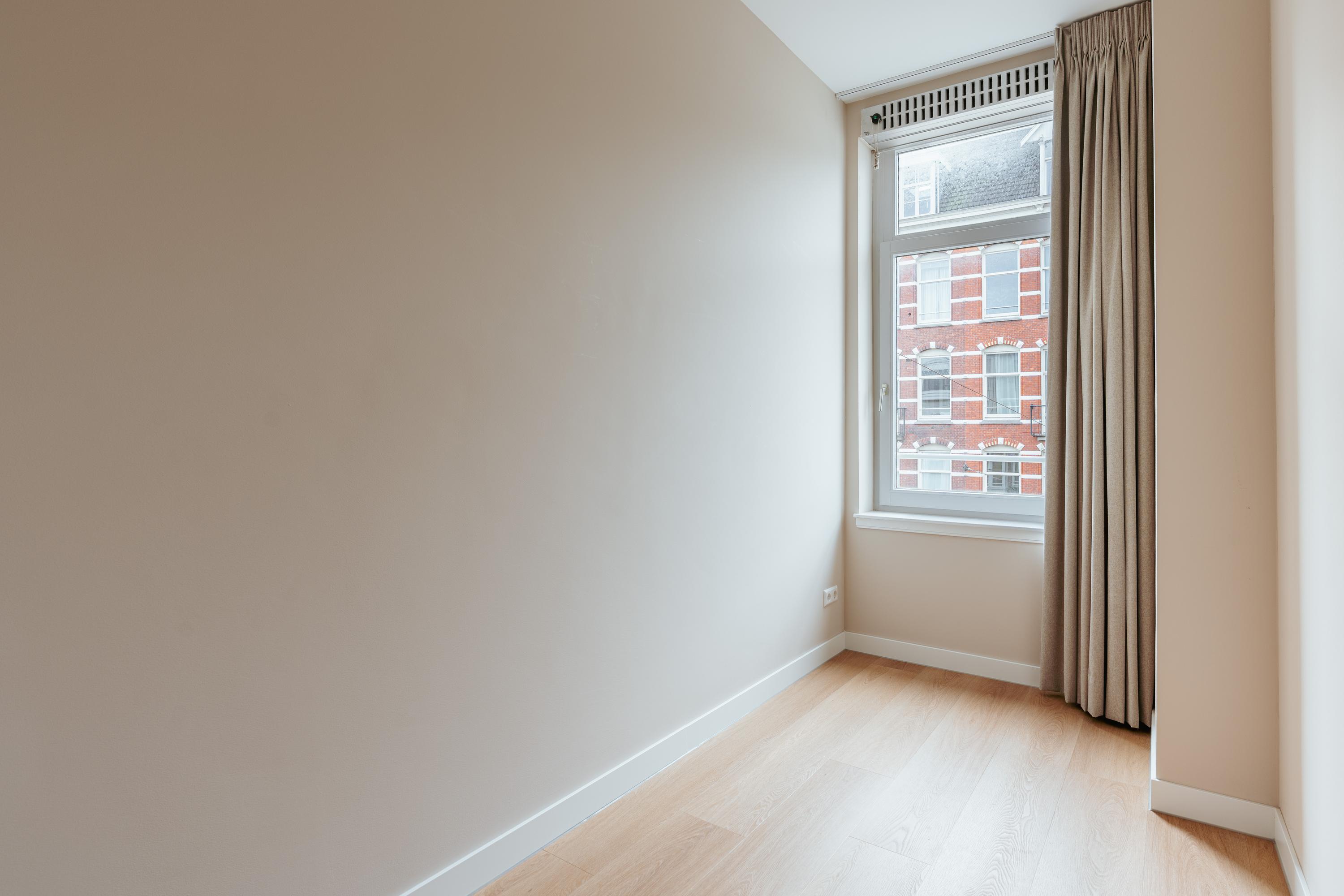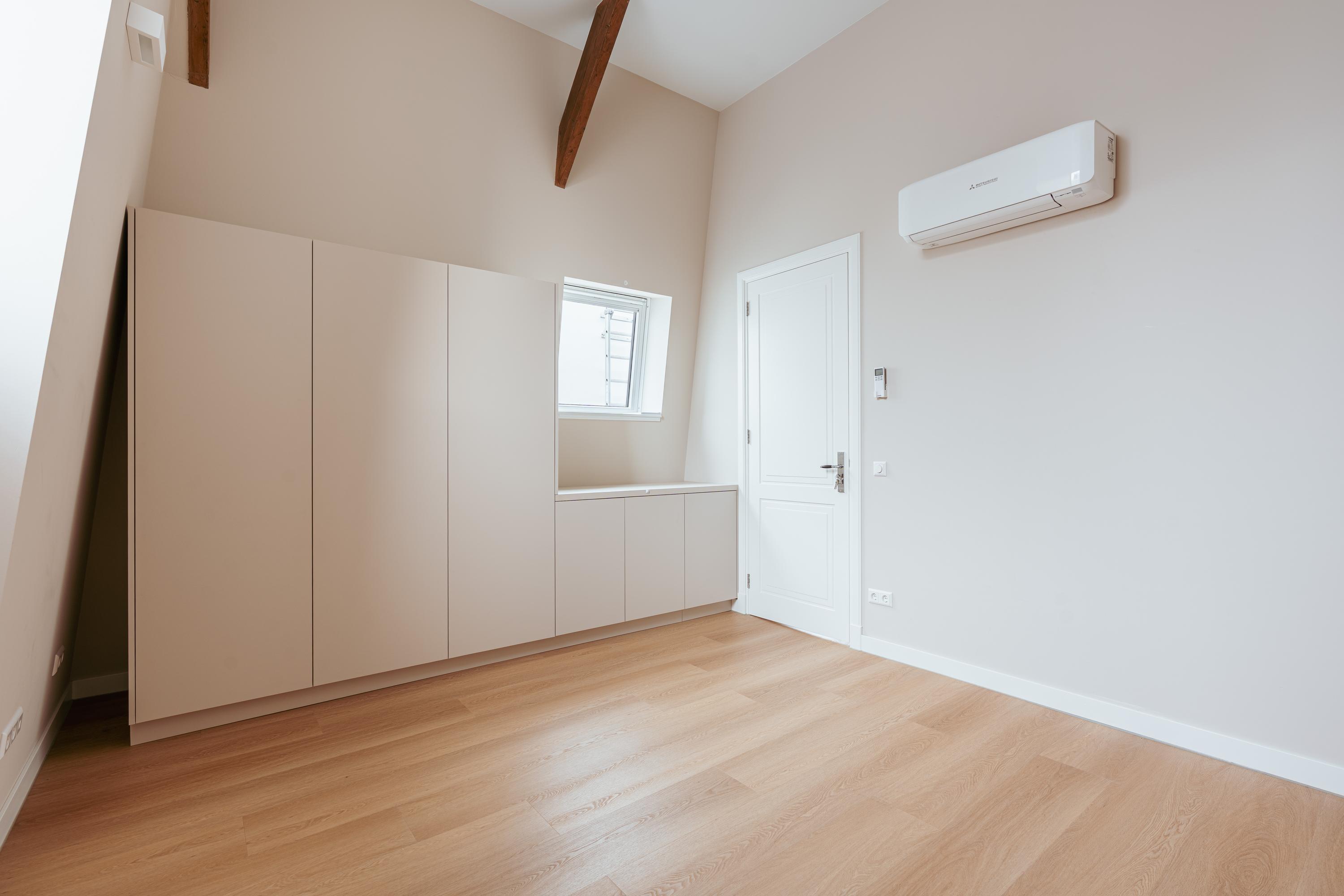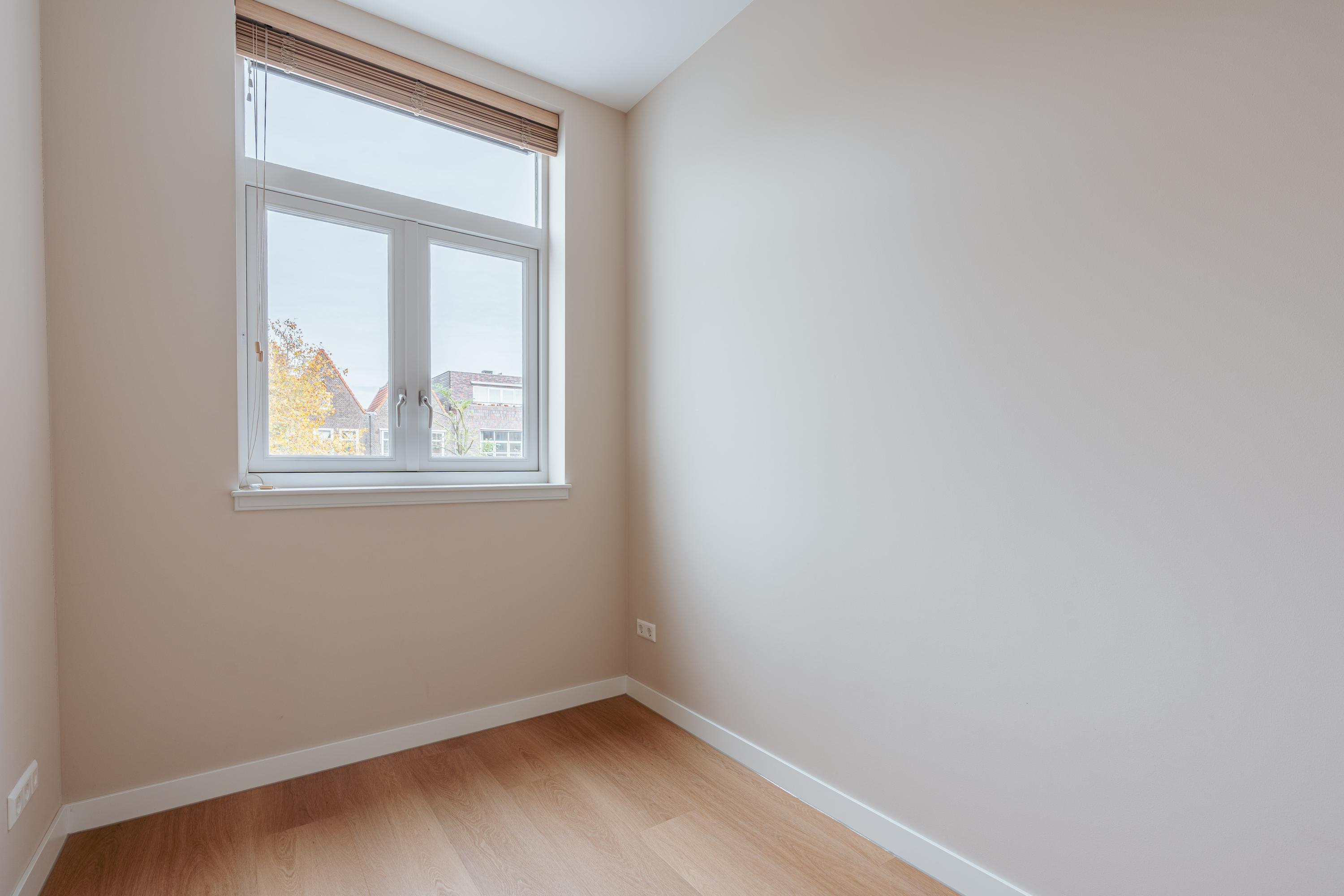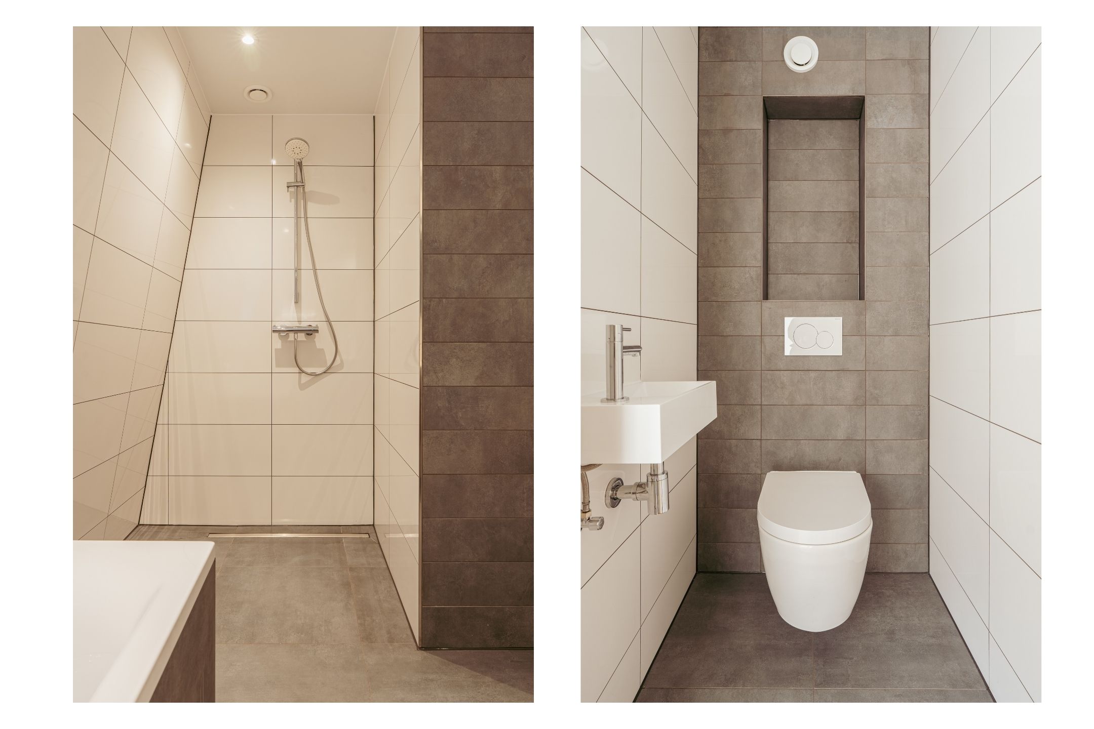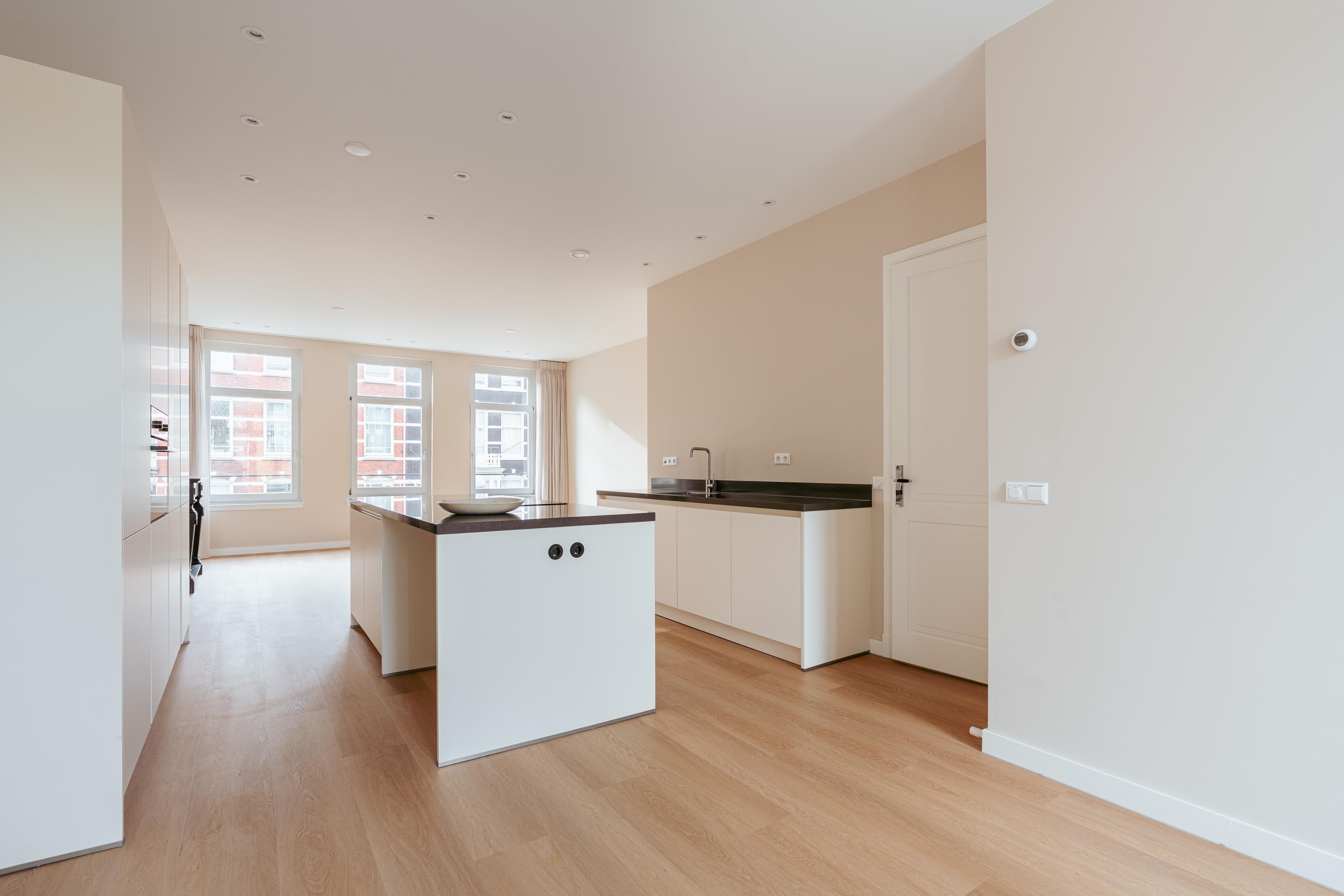 Via de overloop, waar zich een separaat gastentoilet bevindt, zijn alle vertrekken op deze verdieping toegankelijk. Aan de linkerzijde bevinden zich twee goed bemeten slaapkamers. Aan de rechterzijde ligt de royale doorzonwoonkamer, die dankzij de grote raampartijen rijkelijk wordt overspoeld met daglicht. De stijlvolle open keuken is uitgevoerd in een strak en luxe design en uitgerust met alle denkbare inbouwapparatuur, waaronder een kookeiland, combi-oven, vaatwasser, koel-vriescombinatie en volop bergruimte. De originele schouw voegt een warm, authentiek accent toe aan het geheel. Via openslaande deuren heeft u toegang tot het dakterras (ca. 32 m²): een heerlijke plek om buiten te ontspannen.
