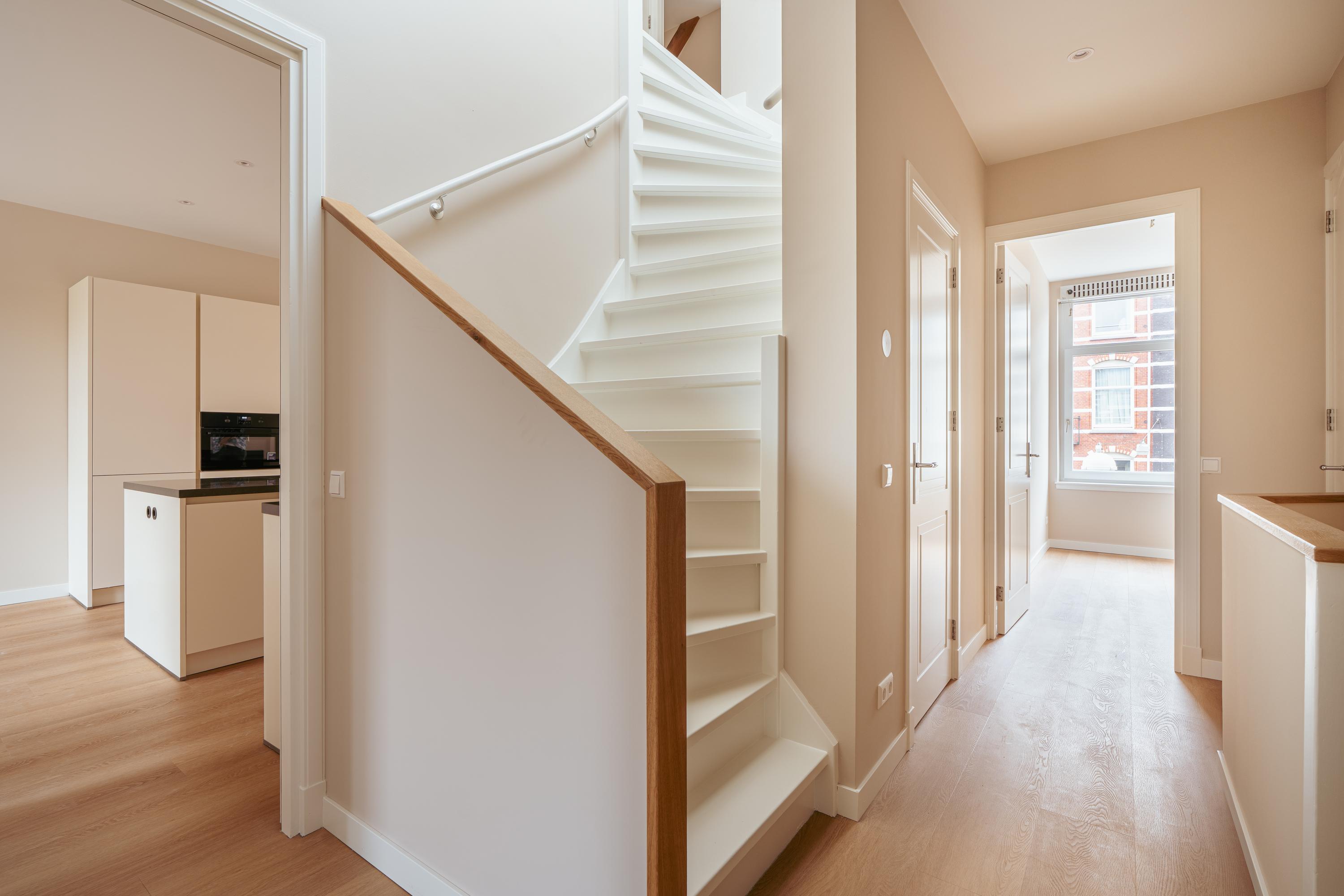 Het appartement is bereikbaar via een gemeenschappelijke entree, met een eigen opgang op de eerste verdieping met ruime trapkast. De woning strekt zich uit over de tweede en derde — tevens bovenste — verdieping van het pand.