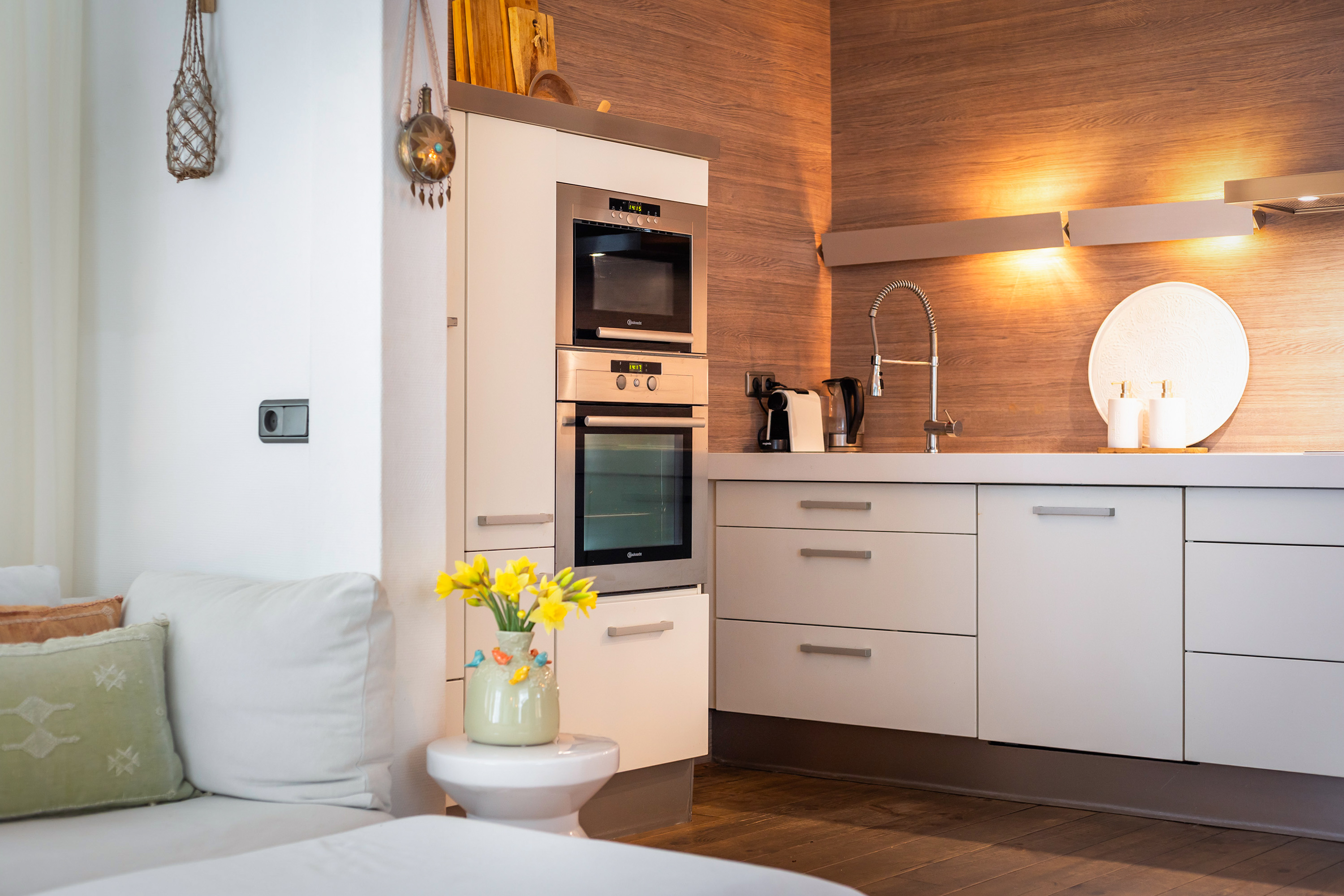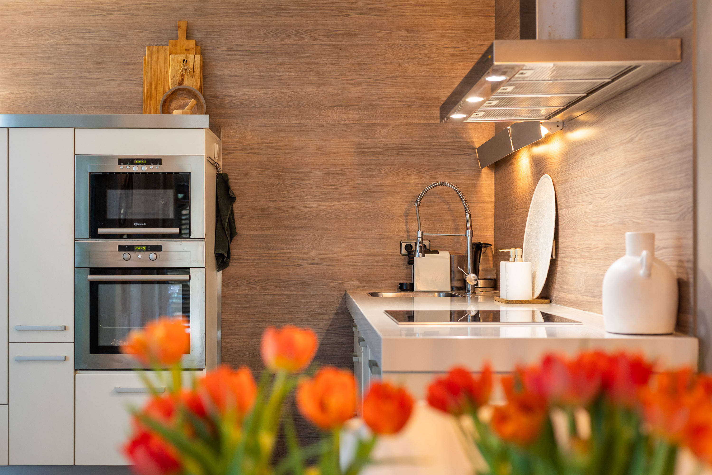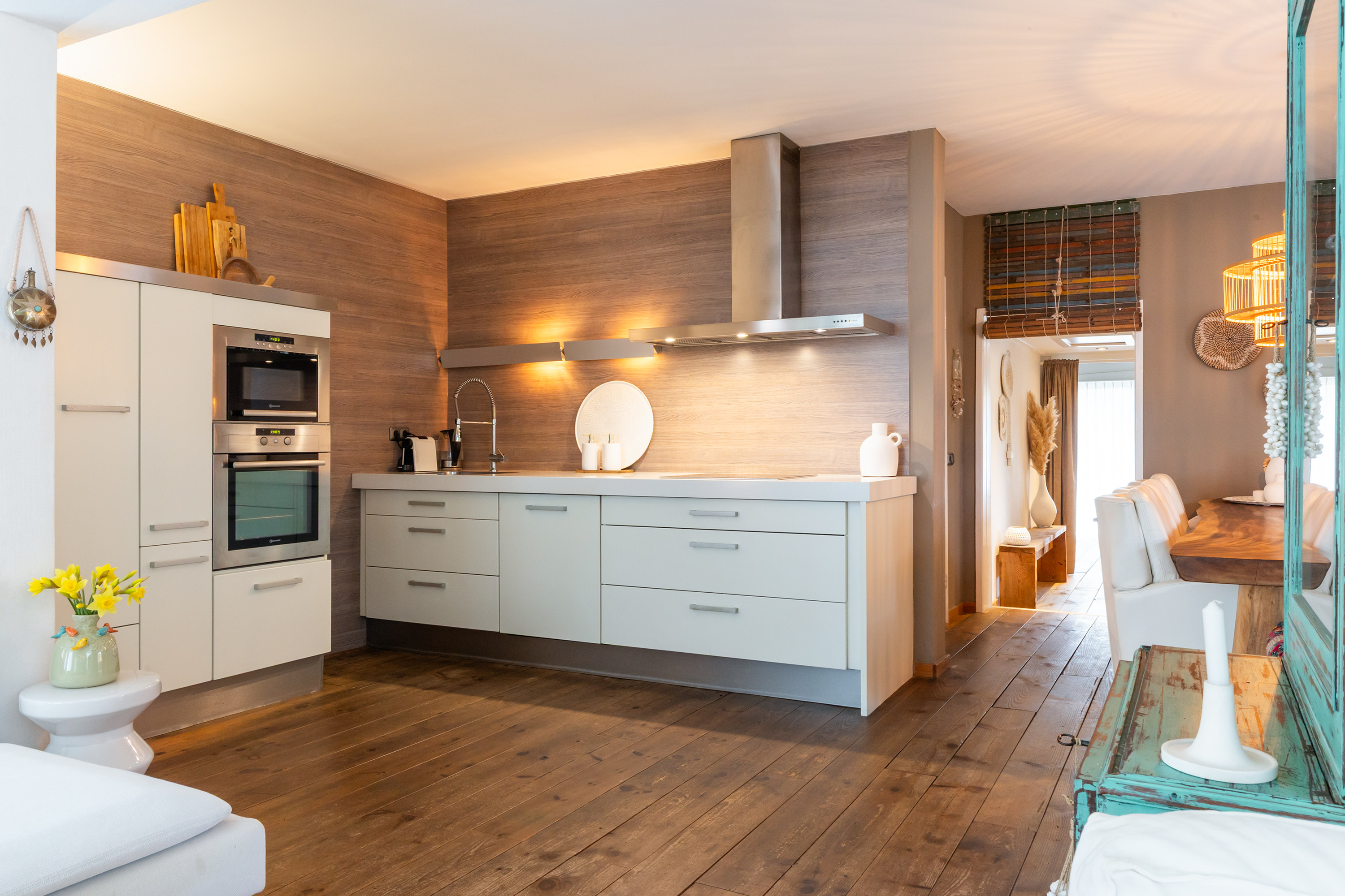 De woonkamer staat in open verbinding met de royale woonkeuken. De woonkeuken heeft een tweedelige luxe keukenopstelling met diverse inbouwapparatuur, waaronder een oven, magnetron, vaatwasser, koelkast, afzuigkap met filters en een inductiekookplaat. De keuken is afgewerkt met een hoogwaardig en extra diep Caesarstone werkblad, dat een elegante uitstraling geeft en tevens duurzaam en onderhoudsvriendelijk is.