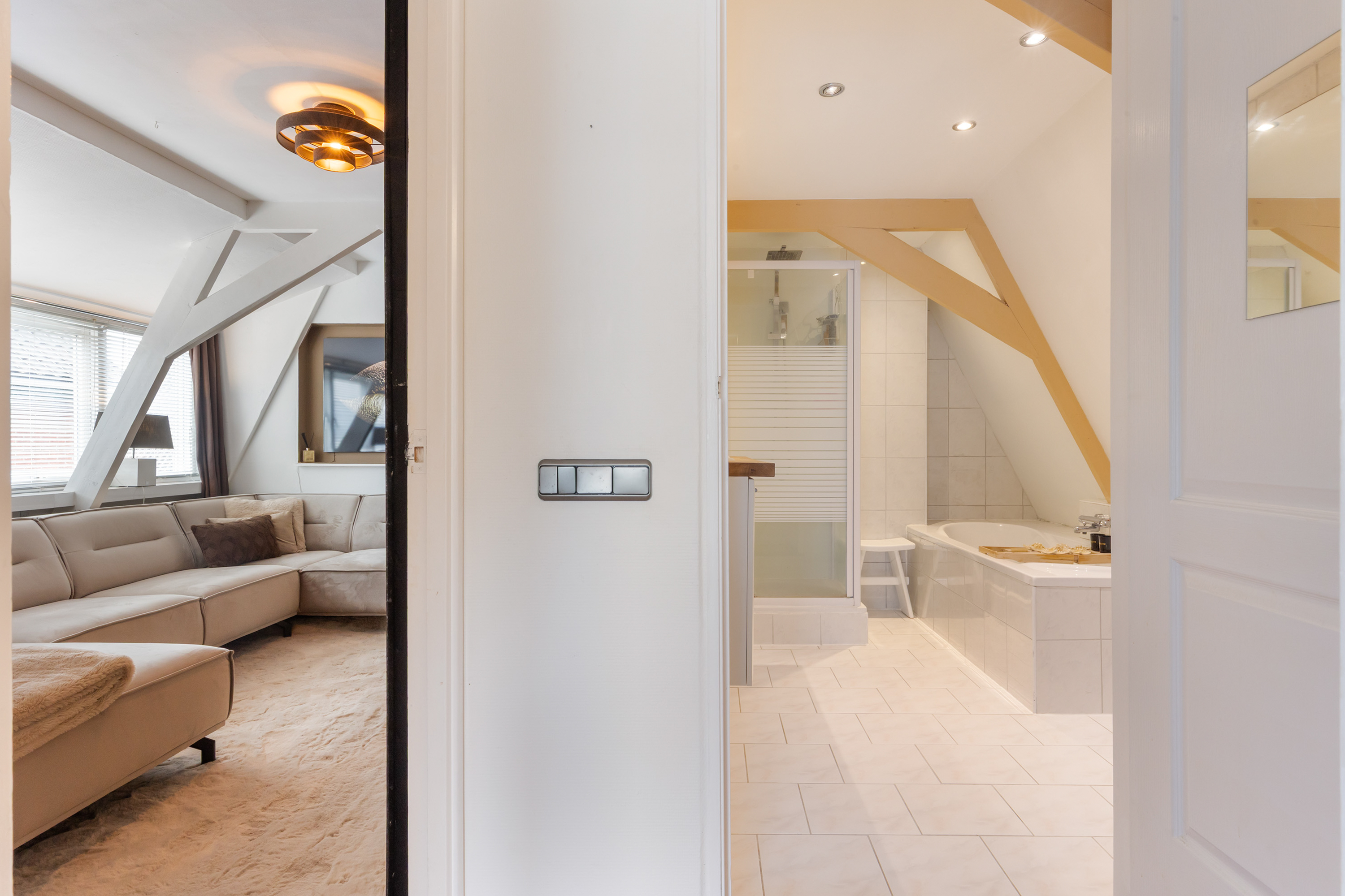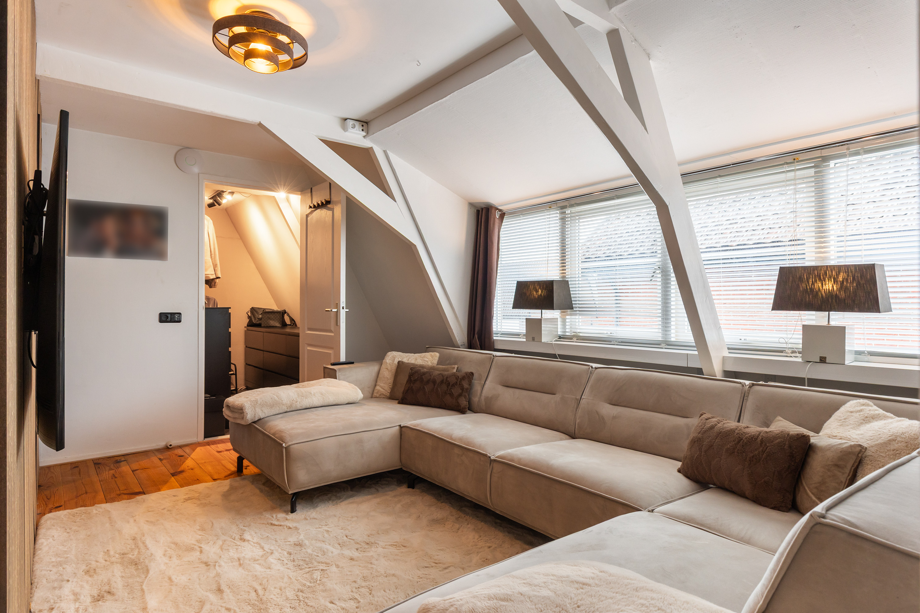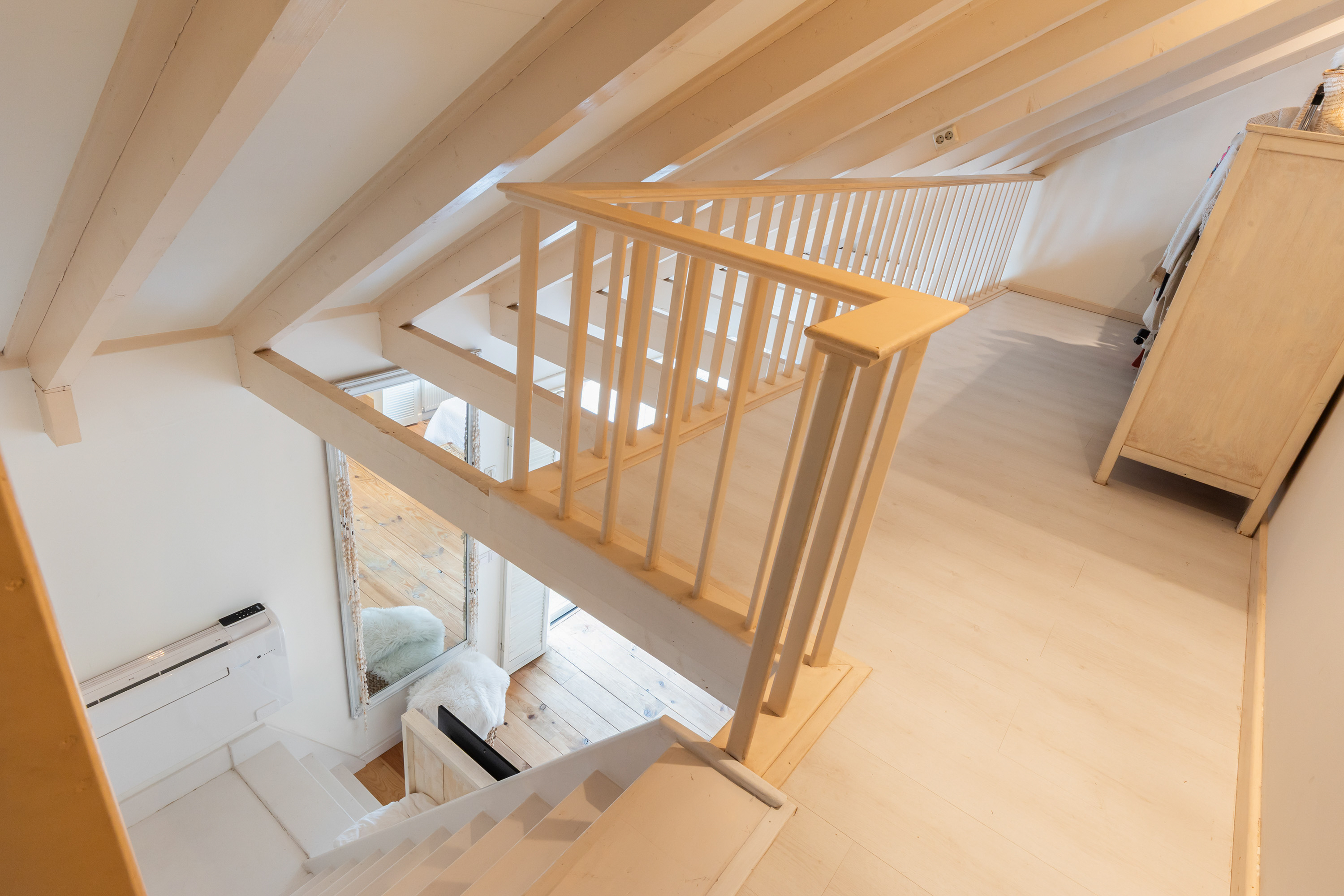 Op deze verdieping zijn de originele balken, schuine wanden, brede dakkapellen en houten vloeren aanwezig, wat zorgt voor een warme en karaktervolle sfeer.