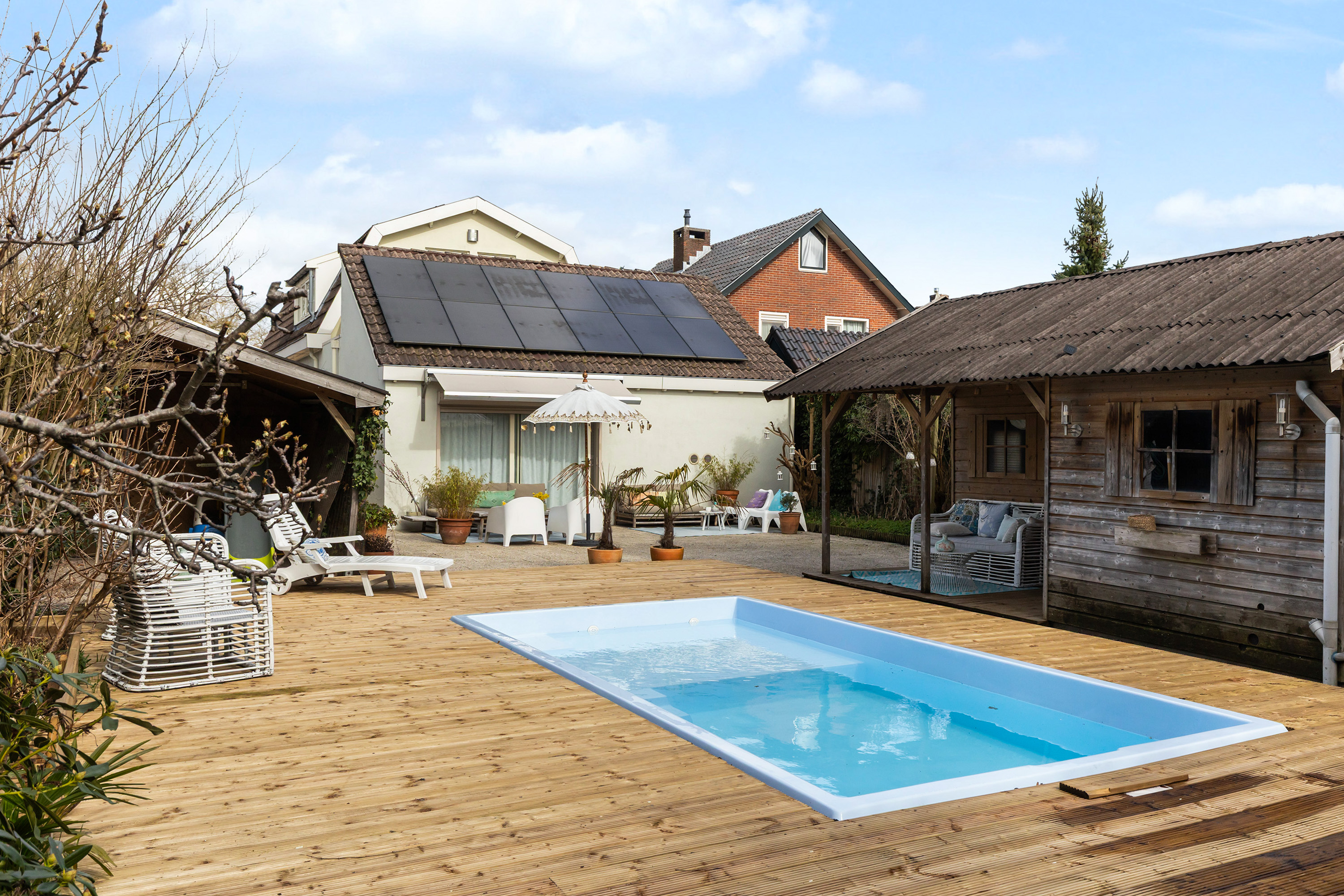 In de tuin ligt het in 2025 gerealiseerde zwembad met een afmeting van circa 5 x 2,75 meter en een diepte van 1,20 meter. Het polyester zwembad beschikt over een aangenaam ondiep zonnedek en verlichting in verschillende kleuren. De rolcover zorgt ervoor dat het bad veilig kan worden afgesloten. Rondom het zwembad ligt een houten vlonderterras met ruimte voor ligbedden en een terras.