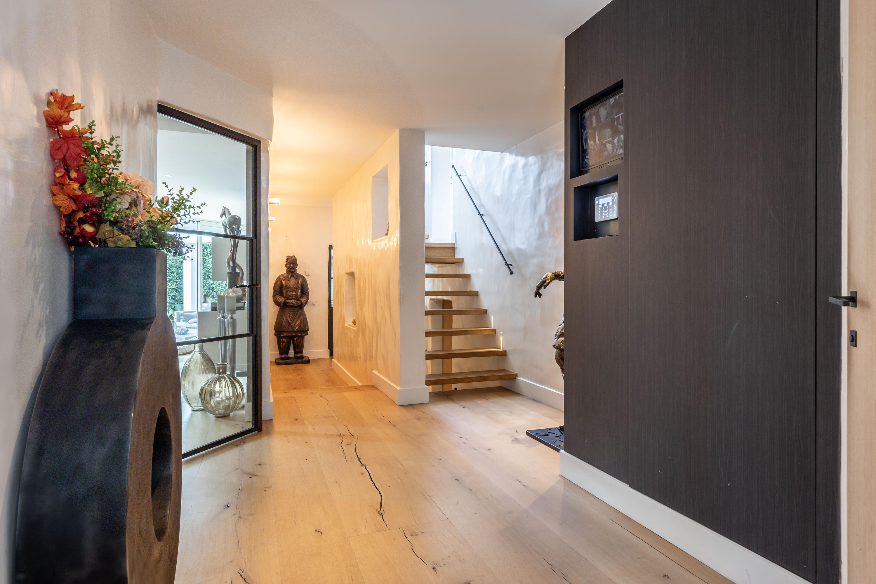 De entree is royaal, met open eiken trappen en sfeervolle verlichting. Het toilet is luxe uitgevoerd met een wandcloset, urinoir en marmeren wastafelmeubel.