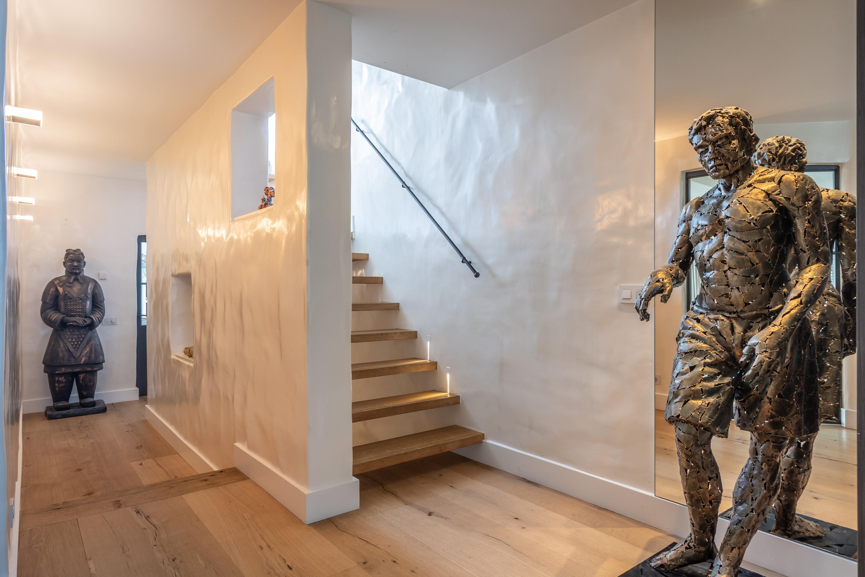 Alle wanden zijn uitgevoerd met exclusief puddingstuc in moderne Ibiza-stijl. Puddingstuc is een hoogwaardige en ambachtelijke afwerkingstechniek voor wanden en plafonds. Het staat bekend om zijn zachte, bijna fluweelachtige uitstraling en subtiele glans. De naam komt voort uit de romige, gladde textuur die doet denken aan pudding.Dit stucwerk wordt met de hand in meerdere lagen aangebracht en zorgvuldig gepolijst, waardoor een naadloos en luxe oppervlak ontstaat. Het oogt warmer dan strak pleisterwerk en rijker dan standaard stucwerk. Puddingstuc wordt vaak toegepast in exclusieve villa’s en boutique hotels vanwege de authentieke, Mediterrane sfeer en de combinatie van strak design met een natuurlijke, elegante uitstraling.