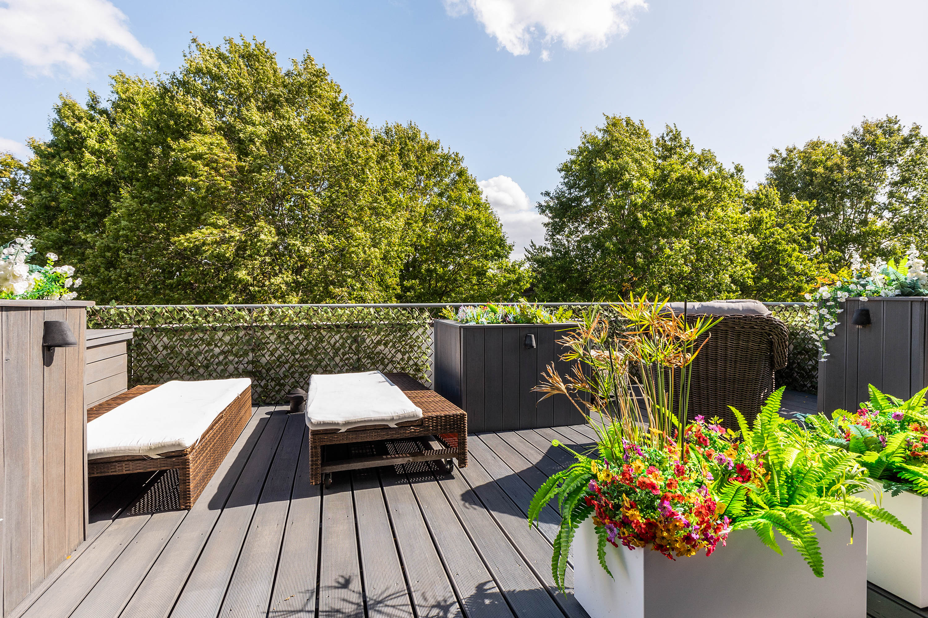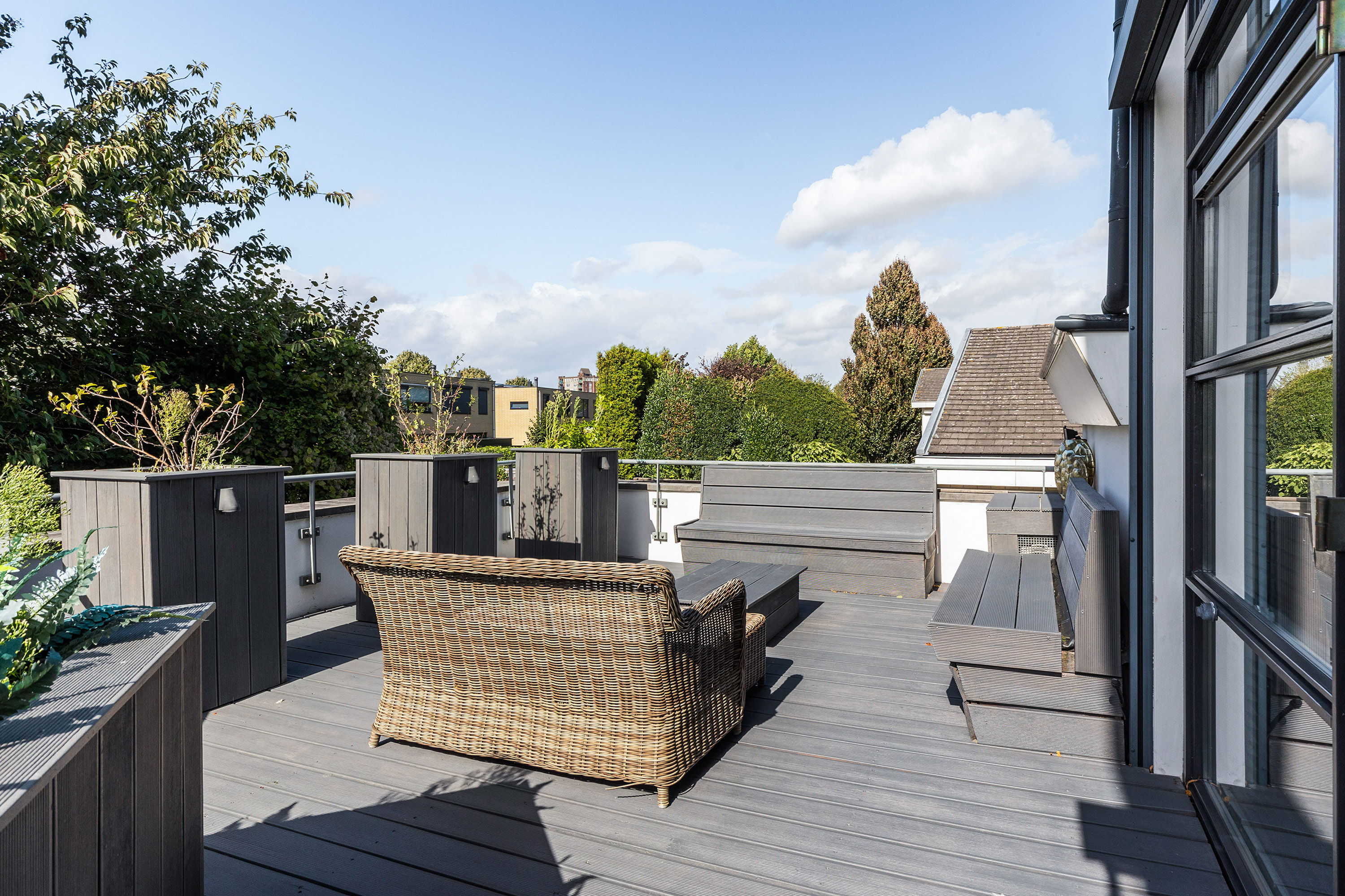 Drie grote slaapkamers bieden eveneens luxe maatwerk; één ervan heeft toegang tot een eigen dakterras. Op de overloop is een tweede badkamer met dubbele wastafel, inloopdouche, bidet en apart toilet.