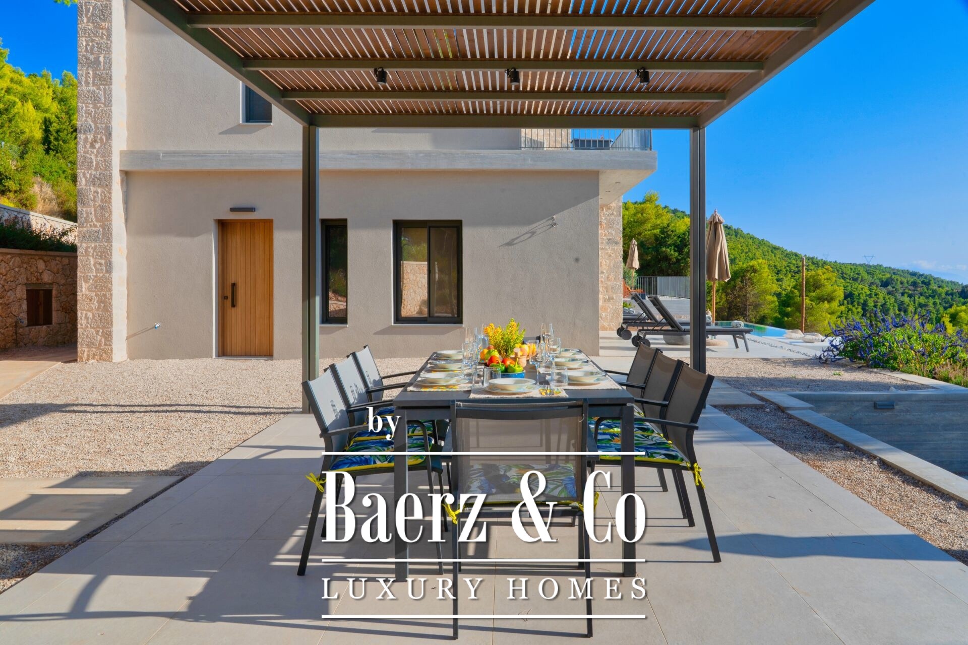 Nestled in an idyllic pine forest, just 600 meters from the sea, this newly built luxury villa of 247 sq.m. stands on a private plot of 4.679 sq.m., offering total privacy, a refreshing breeze, and the delicate aroma of pine trees that defines the surrounding landscape. The villa enjoys breathtaking panoramic views of the Ionian Sea, the mountains, and the lush greenery of Lefkada.