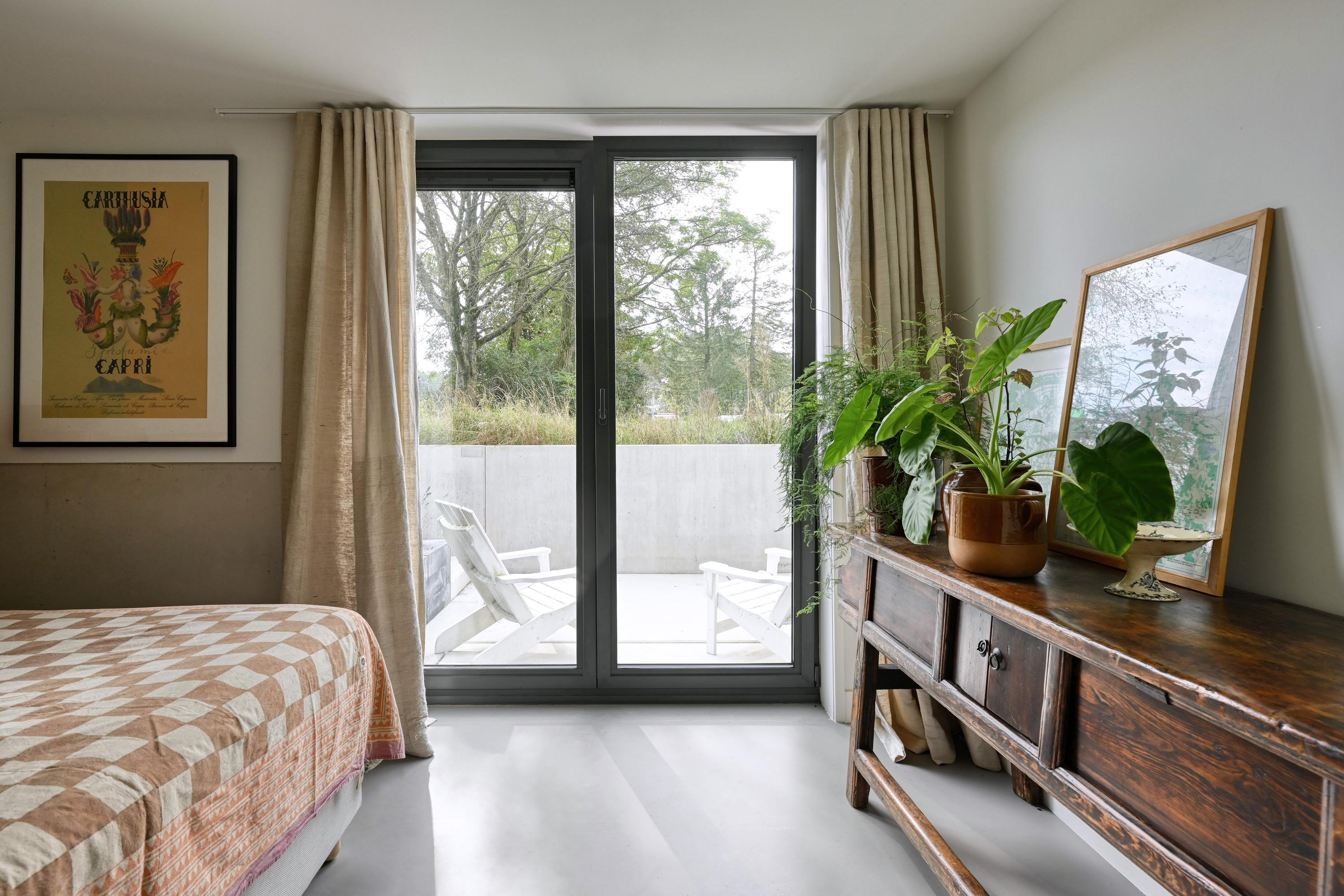 Entree, ruime hal met zicht op de vide. Deze ruimte is met het biljart in gebruik als hobbyruimte met terrasdeuren die geheel opengeschoven kunnen worden naar het terras. Dubbele stalen deuren bieden toegang tot de woonkeuken als ‘het kloppend hart’ van het huis. Het modern vormgegeven kookeiland met marmeren aanrecht staat centraal in de ruimte. Zodra de terrasdeuren over de gehele breedte zijn geopend is heerlijk om in de ochtend te genieten van de ochtendzon en het buitenleven met vrij zicht over een open veld. In combinatie met de groene kleurstelling van de keuken en de muur die tot aan het plafond is getegeld met Marrokkaanse tegeltjes is een geraffineerde mix van luxe materialen en sfeer ontstaan. Uiteraard is de keuken voorzien van de benodigde inbouwapparatuur. Een grote berging/bijkeuken doet dienst als provisieruimte en was- en linnenruimte. Een houten trap brengt u naar de woonkamer met ramen en deuren naar de vloer met vrij uitzicht over de natuur aan de zuidzijde van het huis. Een trap brengt u een niveau lager naar een gang met kledingkasten waaraan de slaapvertrekken en de badkamer zijn gesitueerd. 3 Ruime slaapkamers zijn voorzien van terrasdeuren naar het naastgelegen terras. Een luxe badkamer is gerealiseerd met ligbad, douche, toilet en een wastafel voor 2 personen. Een trap brengt u naar de 4e slaapkamer aan de zuidzijde van het huis. Deze kamer is voorzien van een wastafel. Omdat overal de ramen en deuren van glas tot de vloer doorlopen staat u in direct contact met de natuur. Vanuit de keuken is een vaste trap naar de vide.