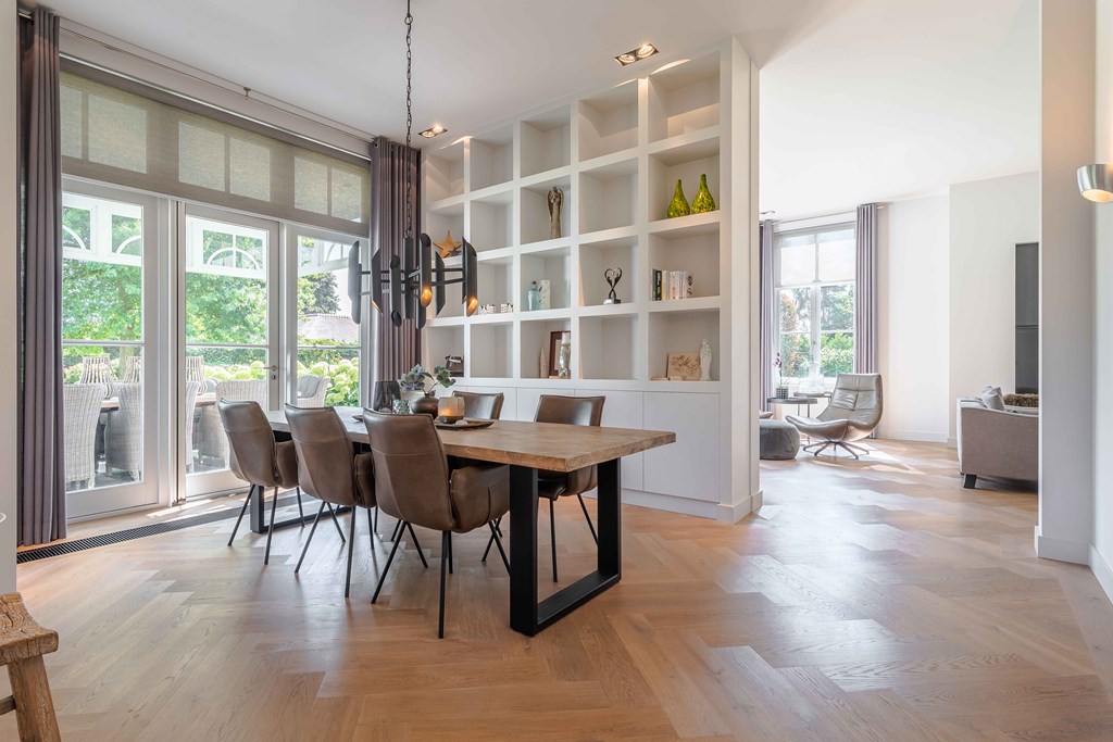De eetkamer is gesitueerd in het midden en is voorzien van een parketvloer en een tuindeur voor direct toegang tot de veranda. Hierdoor is, zeker met mooi weer, de veranda een schakel tussen het binnen-en buitenleven.