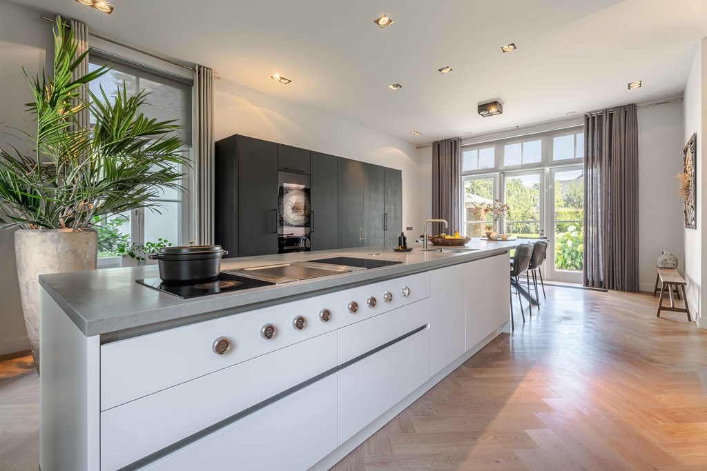 Het kloppende hart van deze woning is uiteraard de prachtige leefkeuken. Vanwege het open karakter van deze ruimte is dit de plek waar u als gezin samen kunt komen. Het grote eiland in het midden is een plek om zowel te koken als te zitten.