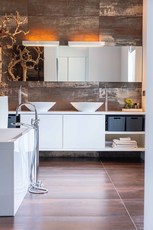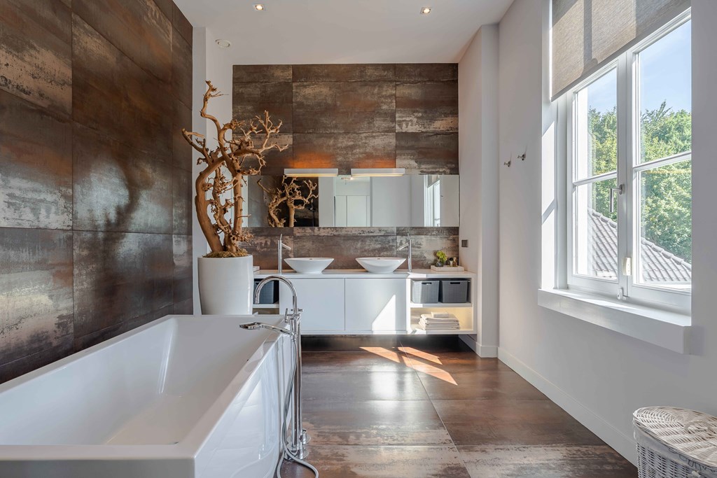 Slaapkamer 1 gelegen aan de voorzijde van de woning. Deze master suite, met doorkijkjes naar de tuin, is een oase van rust. Aansluitend heeft u toegang tot een kleedkamer en een complete badkamer met inloopdouche, een vrijstaand ligbad en 2 waskommen met meubel.