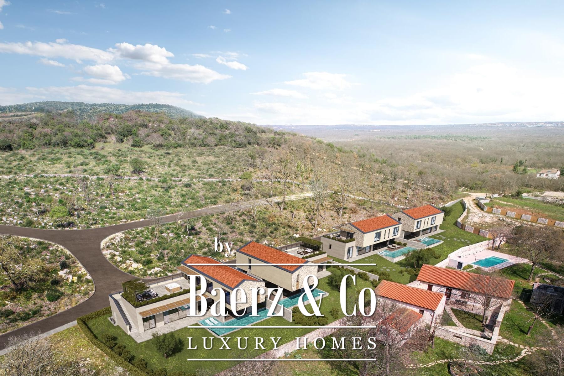 Het ontwerp, gericht op privacy en duurzaamheid, combineert natuursteen, royale glaspartijen en strakke moderne lijnen die naadloos opgaan in het Istrische landschap. De interieurs zijn open van opzet, waardoor binnen- en buitenruimten optimaal met elkaar in verbinding staan. Dit resulteert in een verfijnde mediterrane levensstijl, met nadruk op authentieke materialen en veel natuurlijk licht.