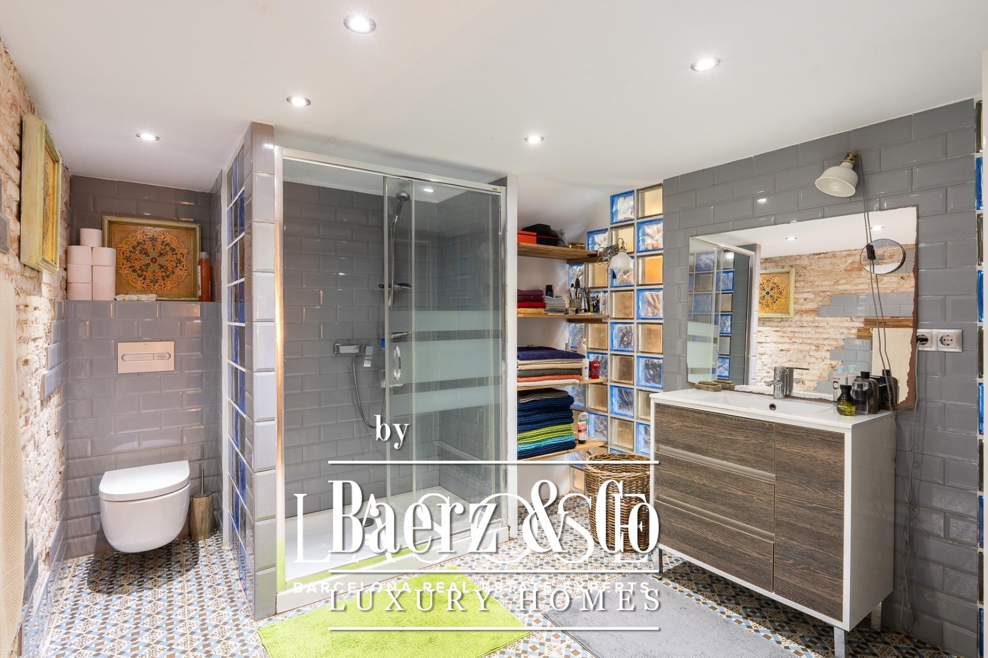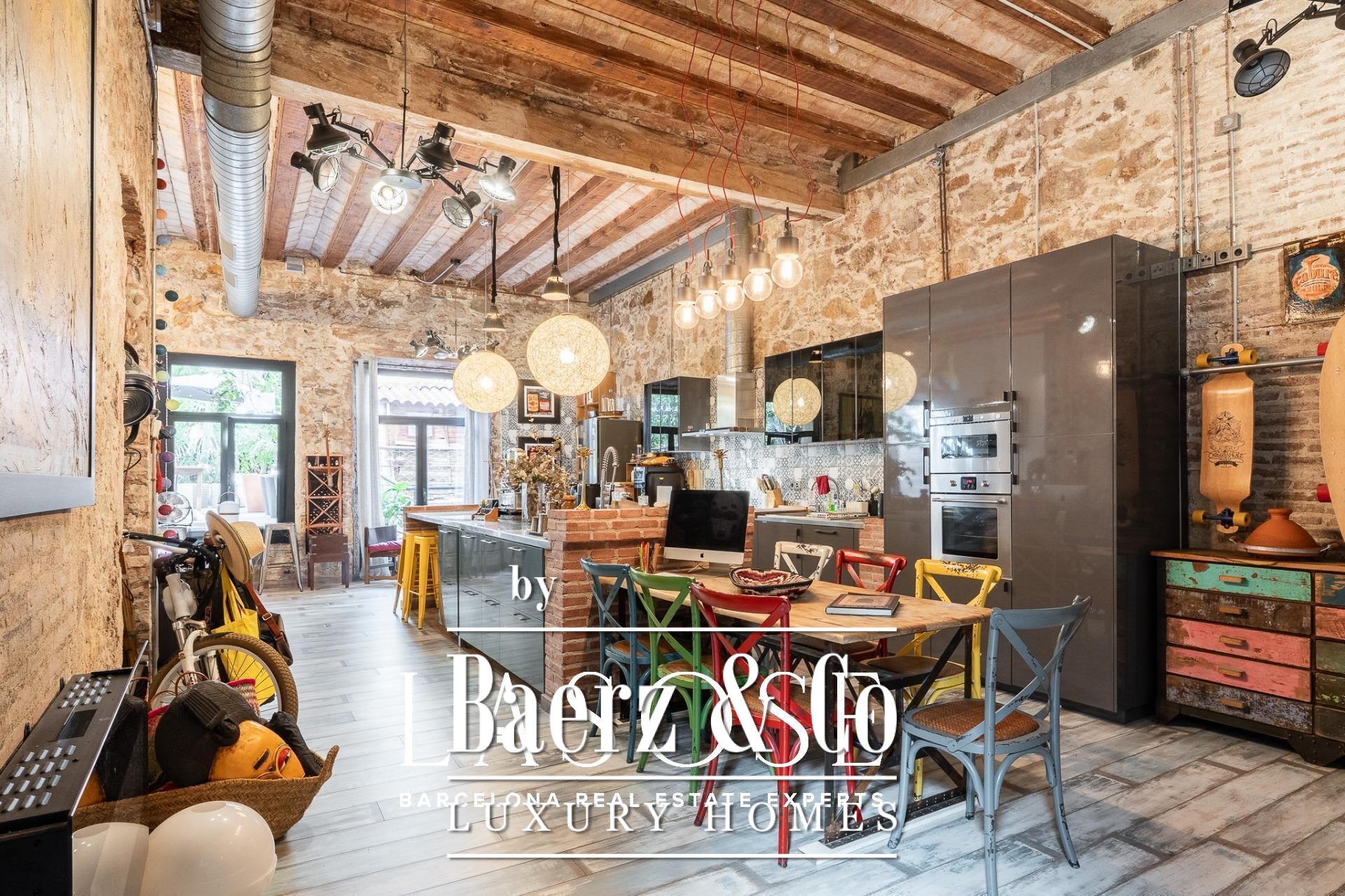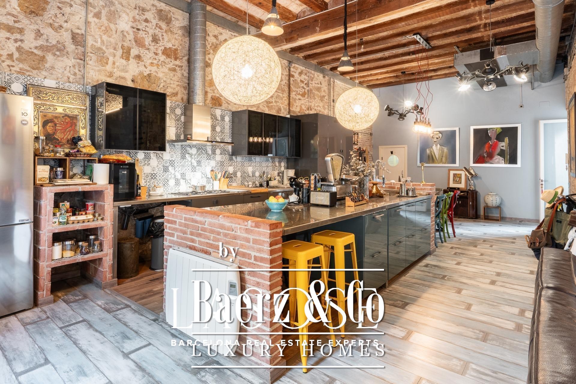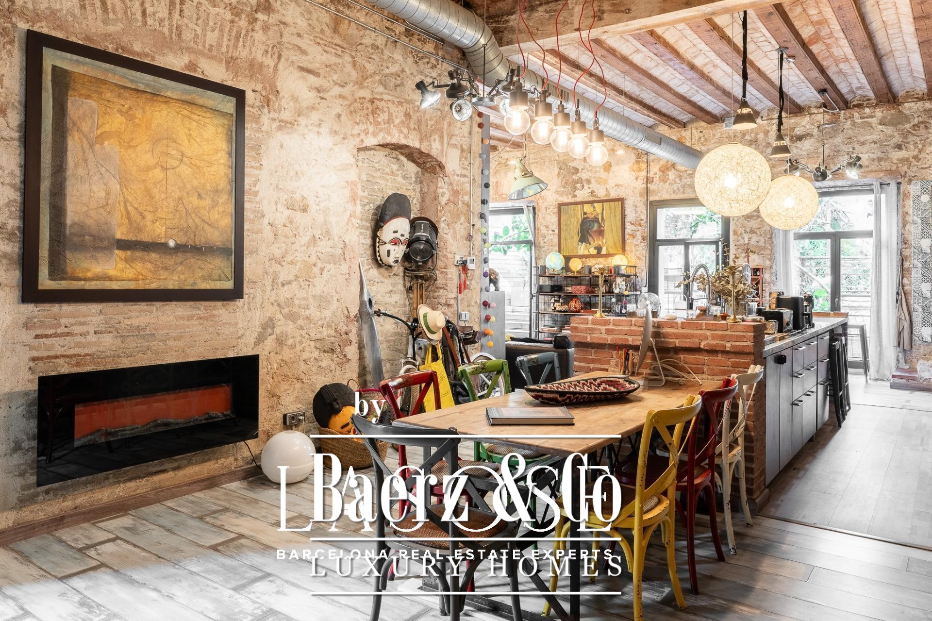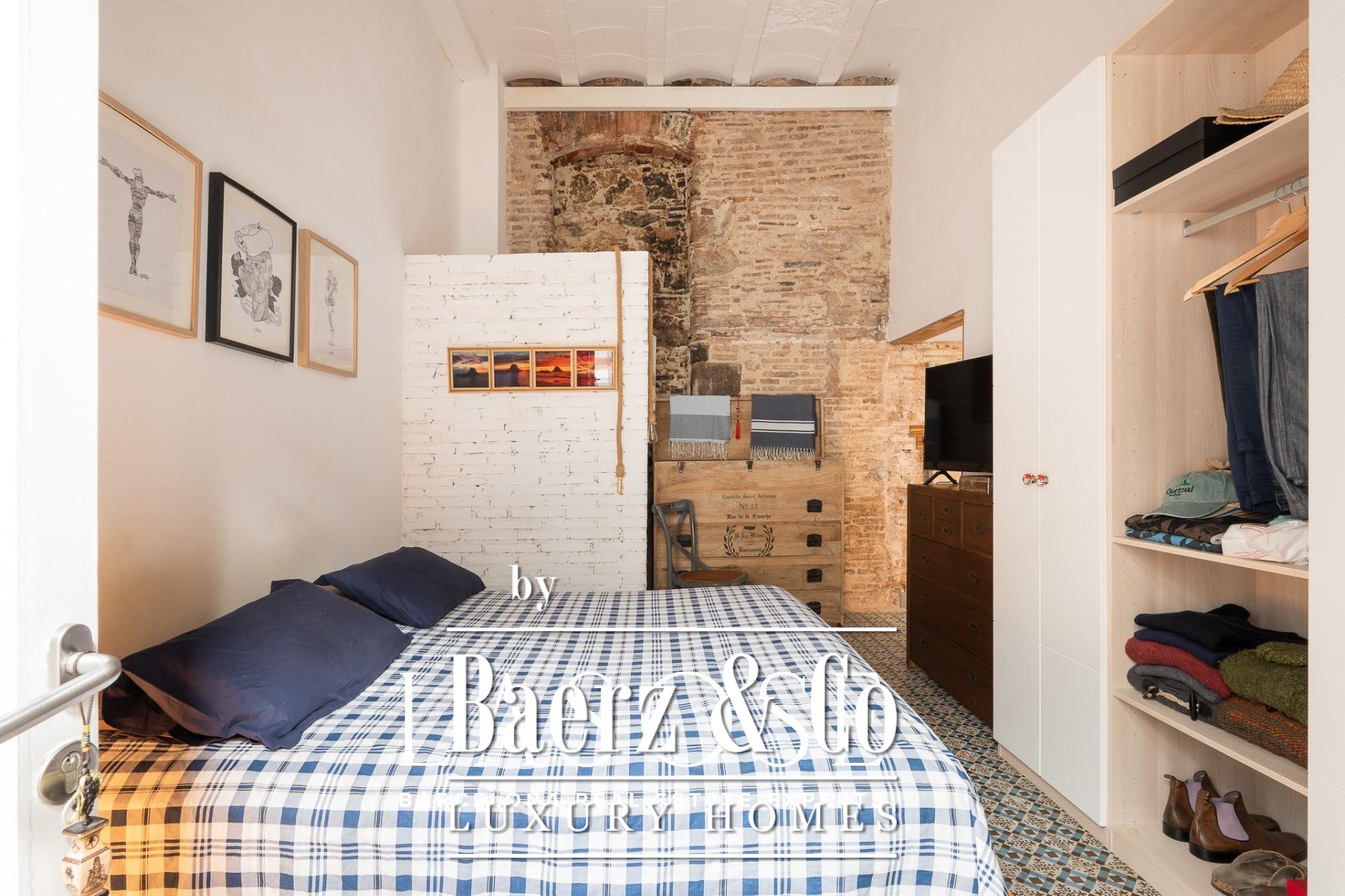 Bij binnenkomst baadt een gang met ramen van vloer tot plafond het interieur in natuurlijk licht en biedt uitzicht op een rustige binnentuin. Drie tweepersoonsslaapkamers, elk met een eigen badkamer, zijn geoptimaliseerd voor privacy en rust. Een royale multifunctionele kamer biedt ruimte voor werk of ontspanning. De living wordt gekenmerkt door een vijf meter hoog plafond, originele bakstenen muren en sierlijke tegels. De open keuken vormt een geheel met de woonkamer, die extra sfeer krijgt door een houtgestookte open haard.