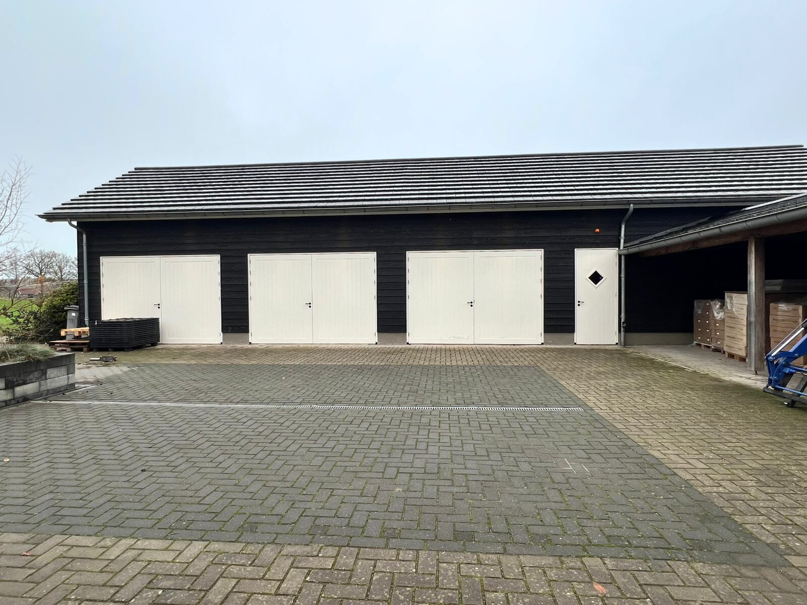 Aansluitend bevindt zich een wagenloods/carport (60 m2). Daarnaast wordt de U-vorm gevuld met een dubbele afsluitbare garage (46 m²) en aansluitende tweede grote opslag-/stallingsruimte (ca. 62 m²). Op het bestrate buitenterrein is er parkeerruimte voorzien ten behoeve van minstens zes auto’s met een oplaadpaal 22kW (nu openbaar beschikbaar).