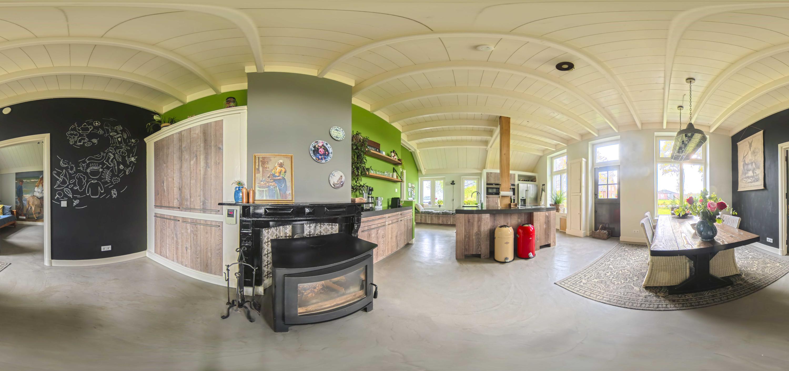 De keuken is maatwerk van Scheffer Keukens Zelhem en is ronduit indrukwekkend; met een dik, composiet werkblad, robuuste massief eiken fronten en alle moderne inbouwapparatuur – van inductieplaat tot Quooker - is het een heerlijke plek om je als chef-kok uit te leven. In de oude schouw staat nog een stoere Nordic Fire-houtkachel, die de keuken voorziet van extra sfeer en warmte.