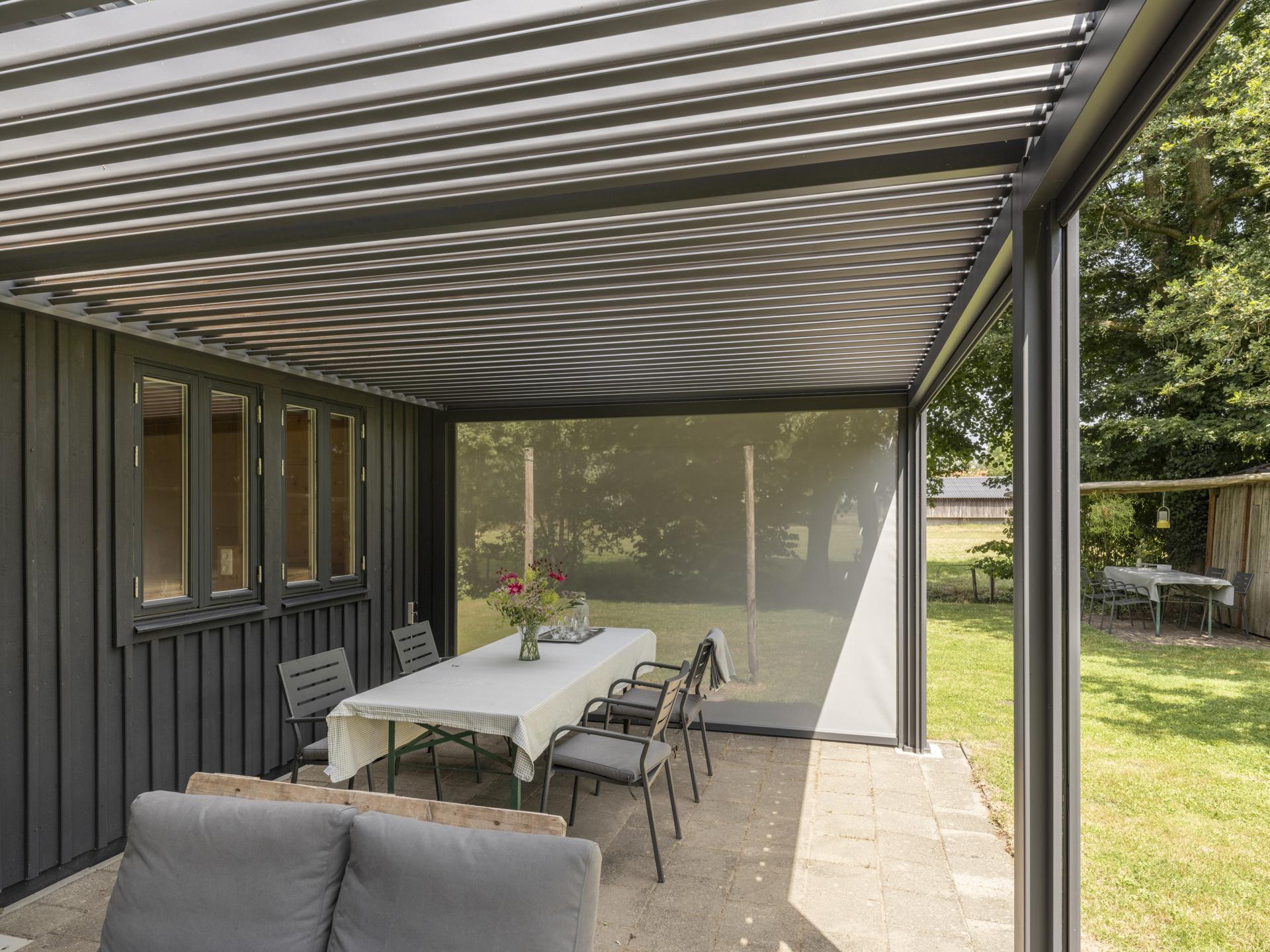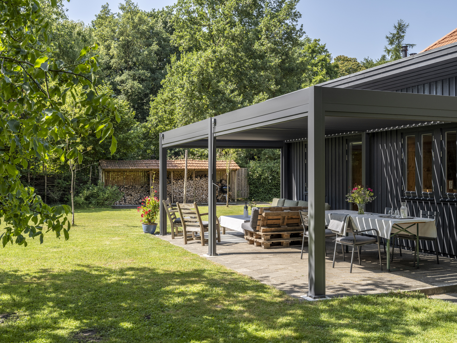 Aan dit bijgebouw is in 2025 een zeer degelijke overkapping geplaatst, een heerlijk verlengstuk van de leefruimte in de tuin. Het dak is te openen en sluiten (een lamellen-systeem), zowel voor lichttoetreding als bescherming tegen regen. Tevens is de overkapping voorzien van uitschuifbare windschermen.