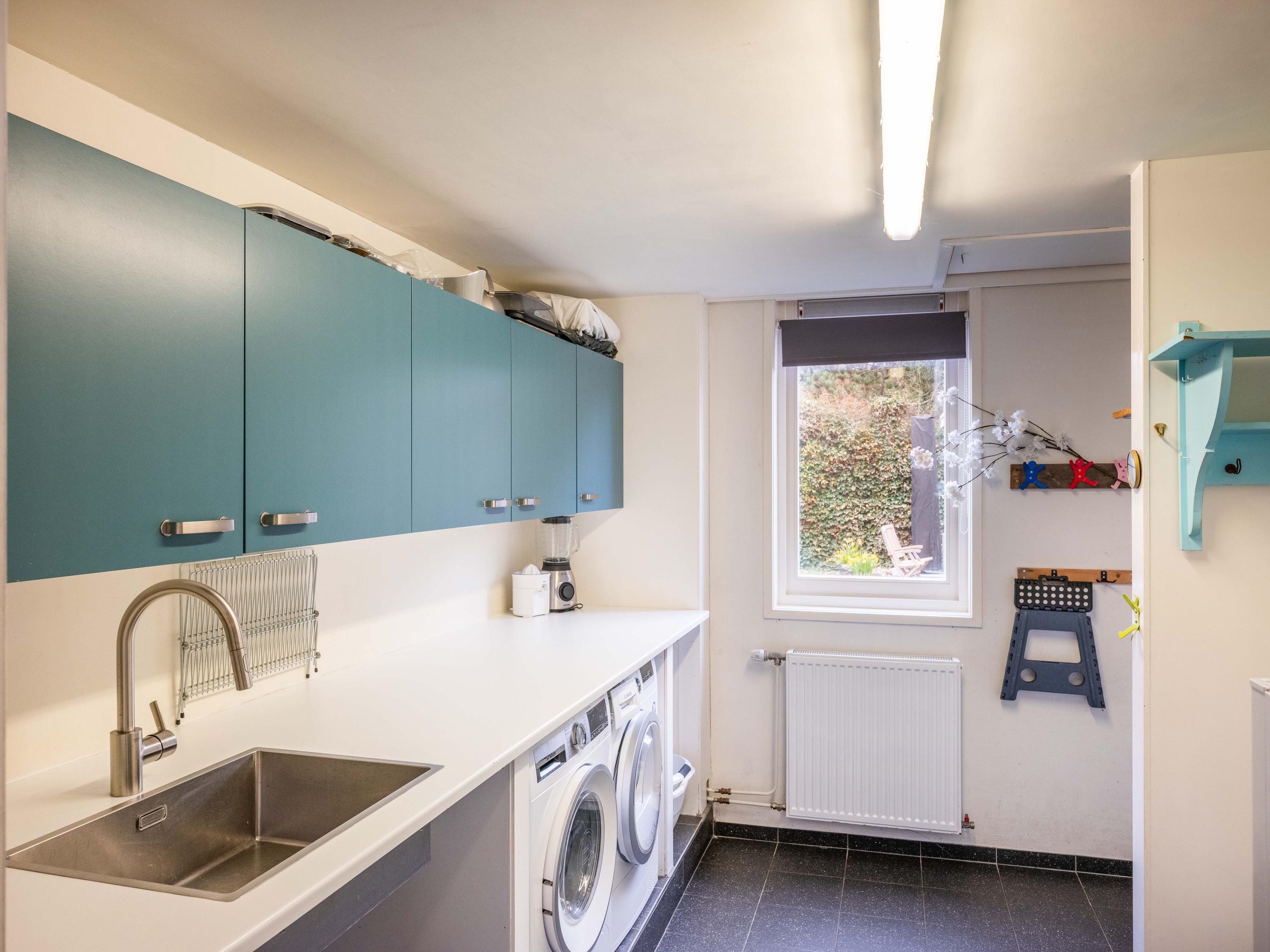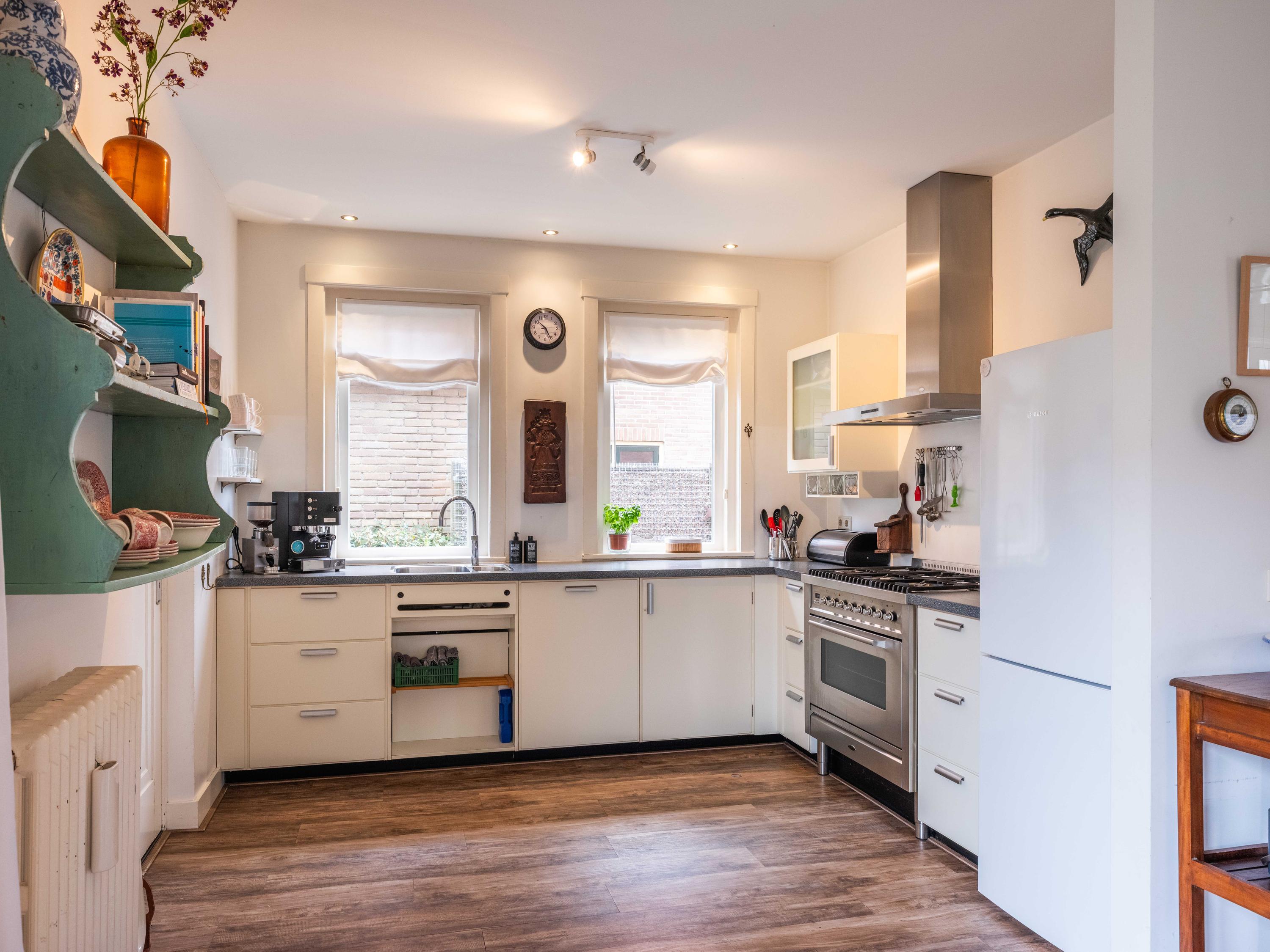 De open keuken is uitgerust met inbouwapparatuur, waaronder een 6-pits Boretti gasfornuis, een Quooker en een vaatwasser. Vanuit de keuken is de bijkeuken bereikbaar, met een wasbak, een raam met uitzicht op de tuin en aansluitingen voor een wasmachine en droger. Boven de bijkeuken bevindt zich een praktische zolderruimte met de cv-ketel.