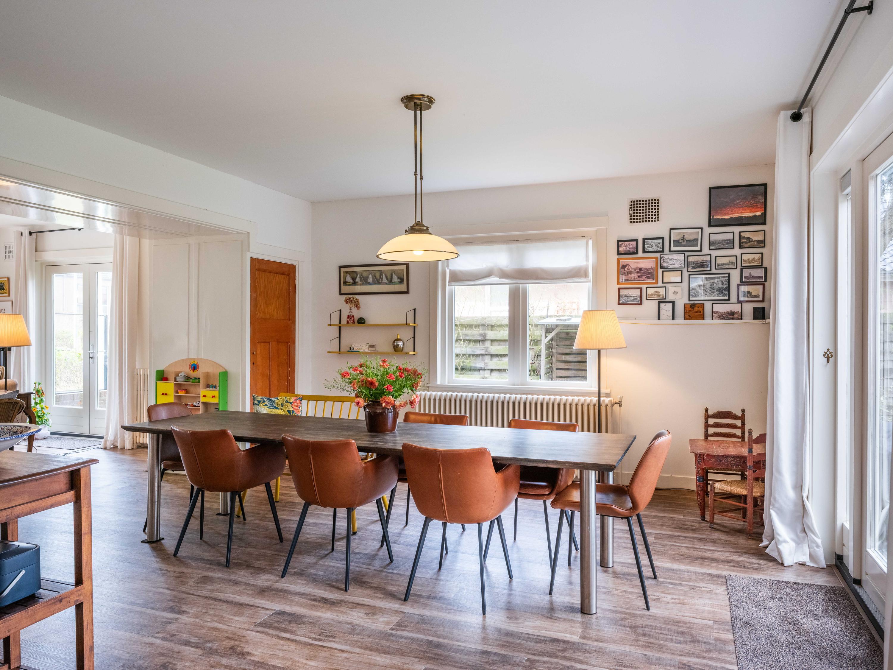 Bij binnenkomst via het tochtportaal valt direct de ruime hal op, met garderobe, meterkast, toilet en toegang tot de kelder. Vanuit de hal zijn zowel de woonkamer als de eetkamer bereikbaar. De woonkamer en-suite is licht en ruim, voorzien van een erker, ingebouwde kasten en een sfeervolle houtkachel. Openslaande deuren geven toegang tot de tuin. De aangrenzende eetkamer heeft eveneens openslaande deuren.