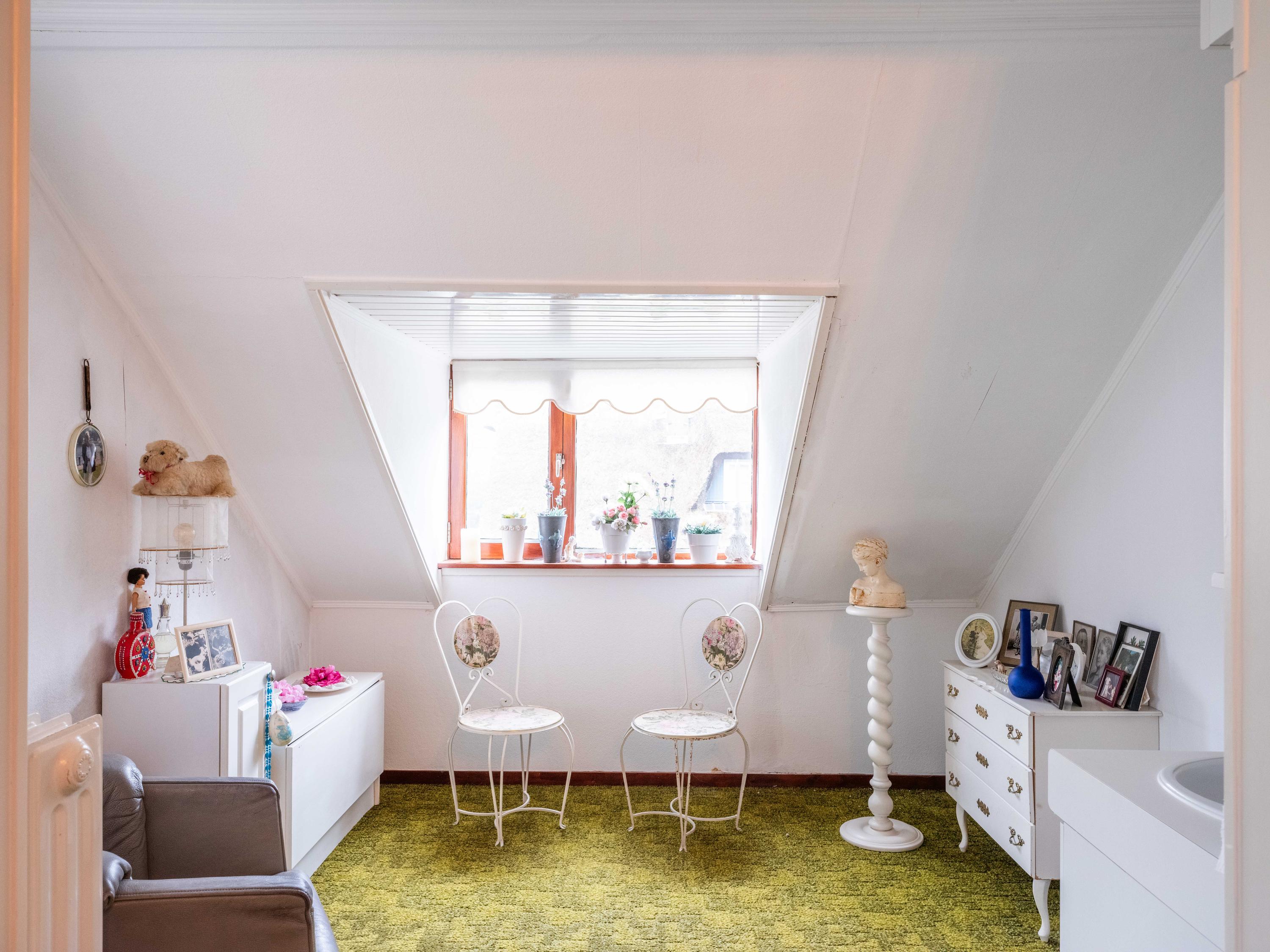 De tuingerichte zit-/eetkamer met openslaande deuren is flink van formaat en naar wens nader in te delen. De keuken is gesloten en eenvoudig uitgevoerd, via de achterdeur in de bijkeuken bereiken we de tuin met de flinke garage van ca. 40 m2. Op de begane grond is tevens een riante atelierruimte beschikbaar die ook prima dienst kan doen als slaapkamer. Via deze ruimte is de tevens van buitenaf bereikbare kantoorruimte bereikbaar. Ideaal voor praktijk aan huis bijvoorbeeld.