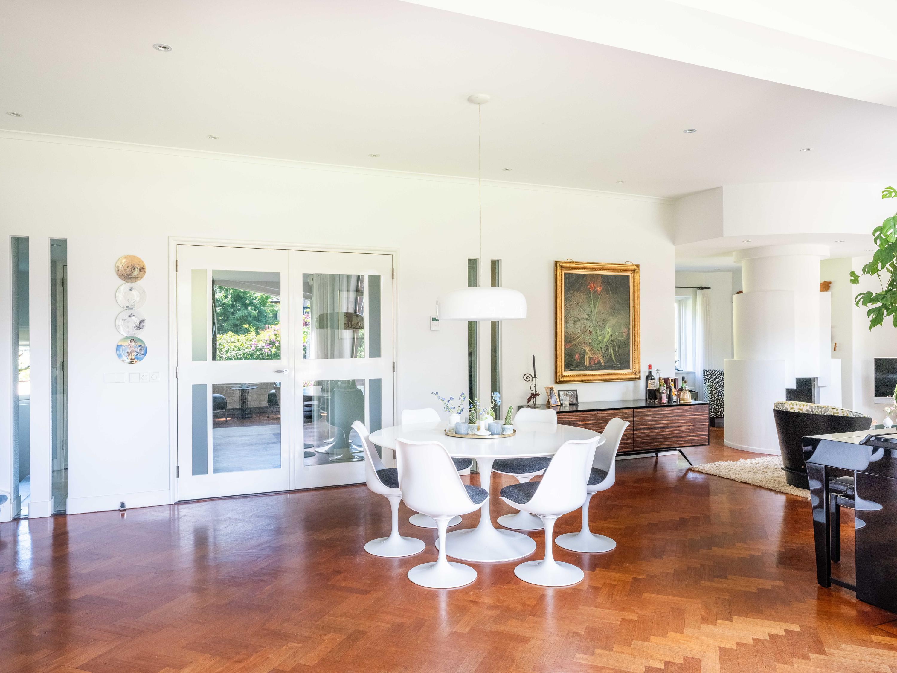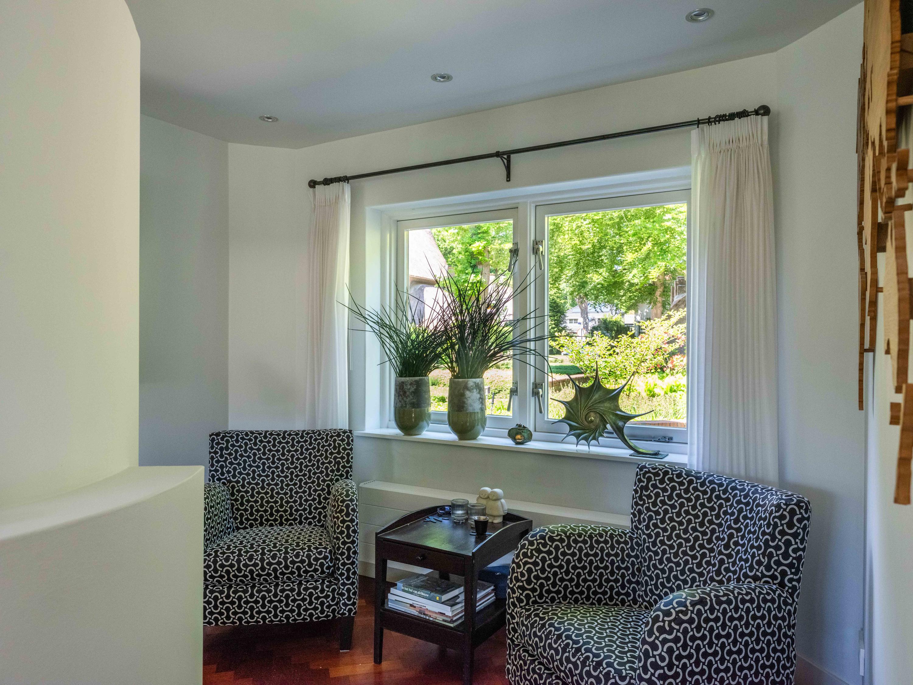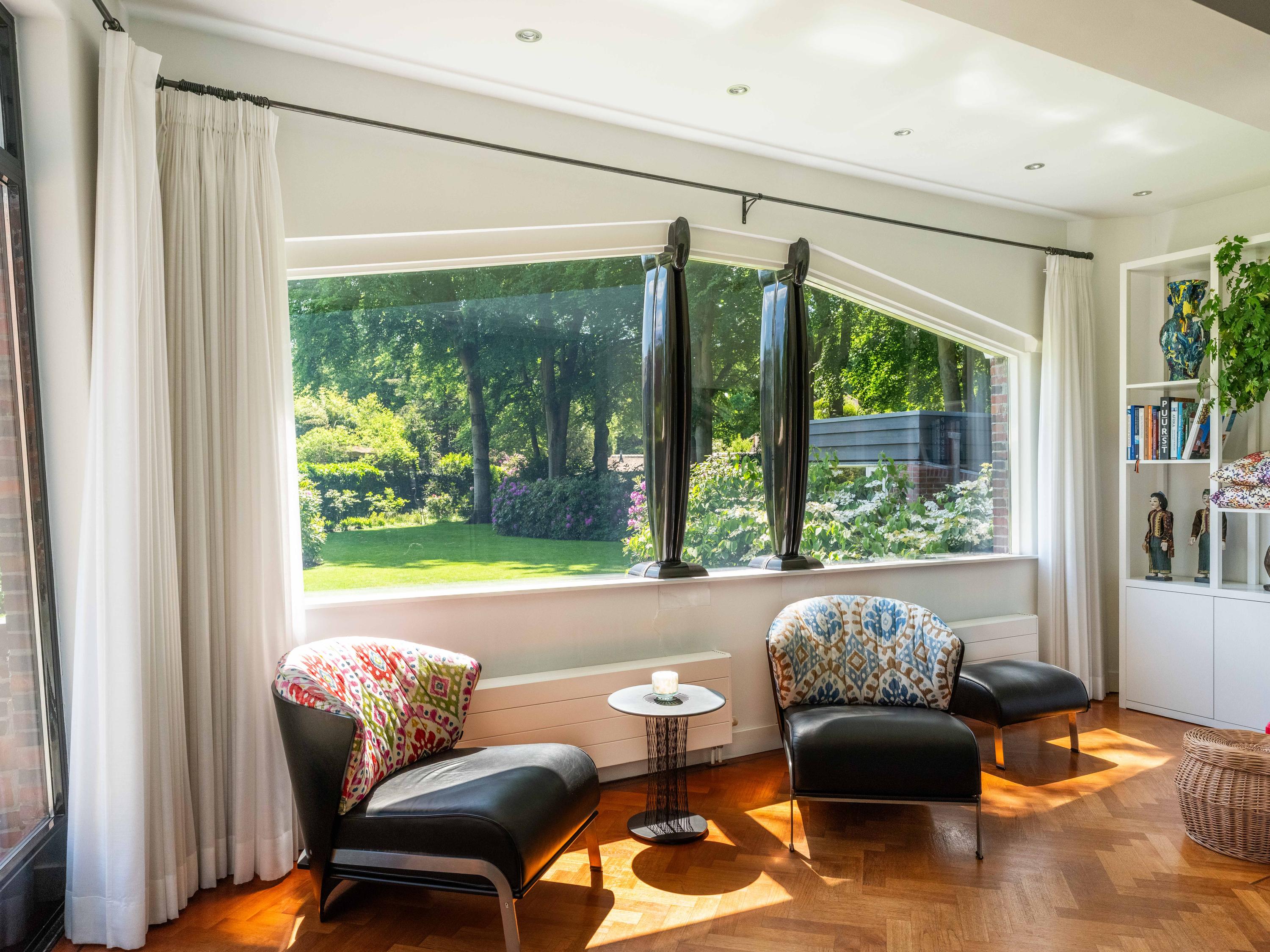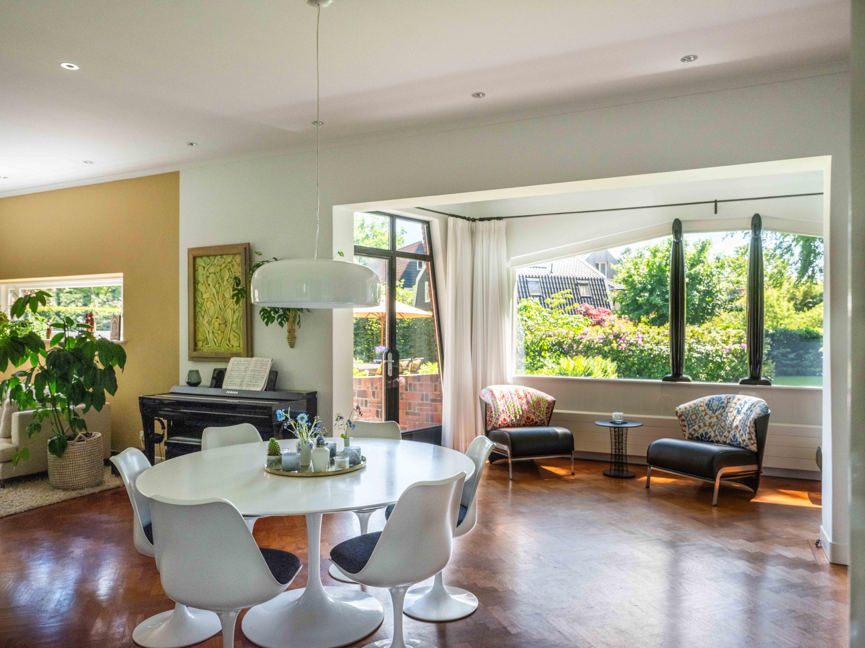 Openslaande deuren leiden naar de royale woonkamer met open haard, een eetgedeelte en serre. Opvallend is het verhoogde gedeelte "de stuurhut". Een mooie parketvloer met bies, de ronde vormen van de open haard , de "kompasbollen" bij de verhoging en het trapeziumvormige raam met kolommen geven het geheel een bijzondere uitstraling.