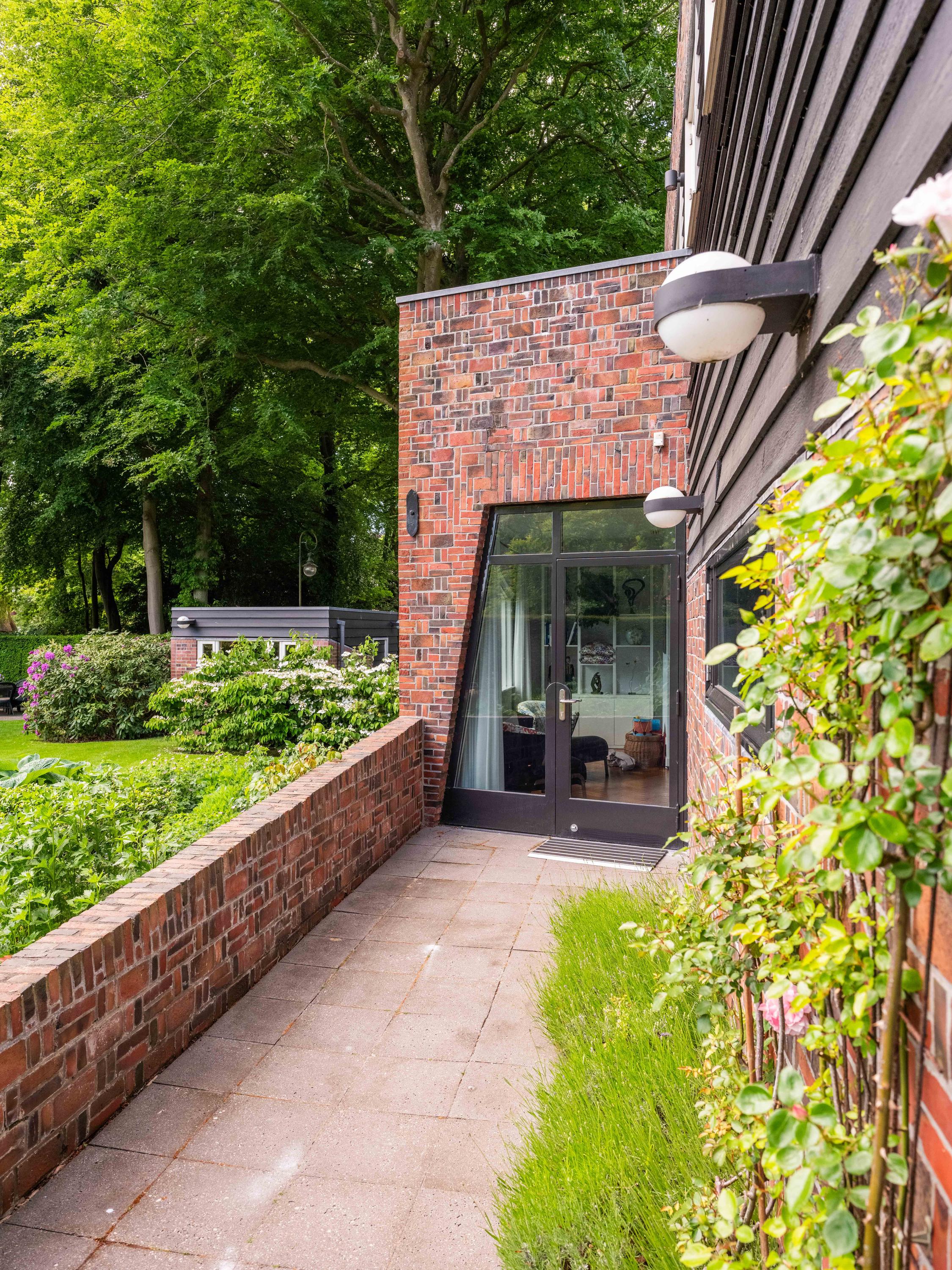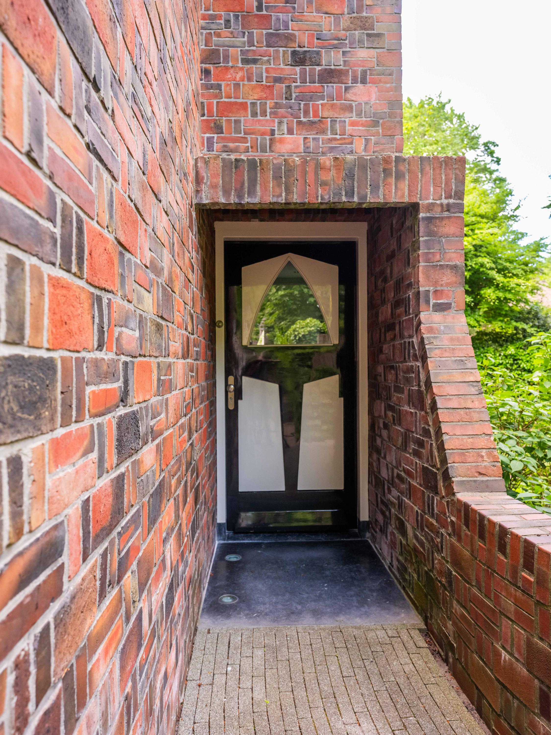 Een kronkelig paadje tussen mooi gevormde ligusterhagen loopt naar de verscholen voordeur. Via de entree lopen we de hal binnen met een garderobe, de trap naar de verdieping en een toilet.